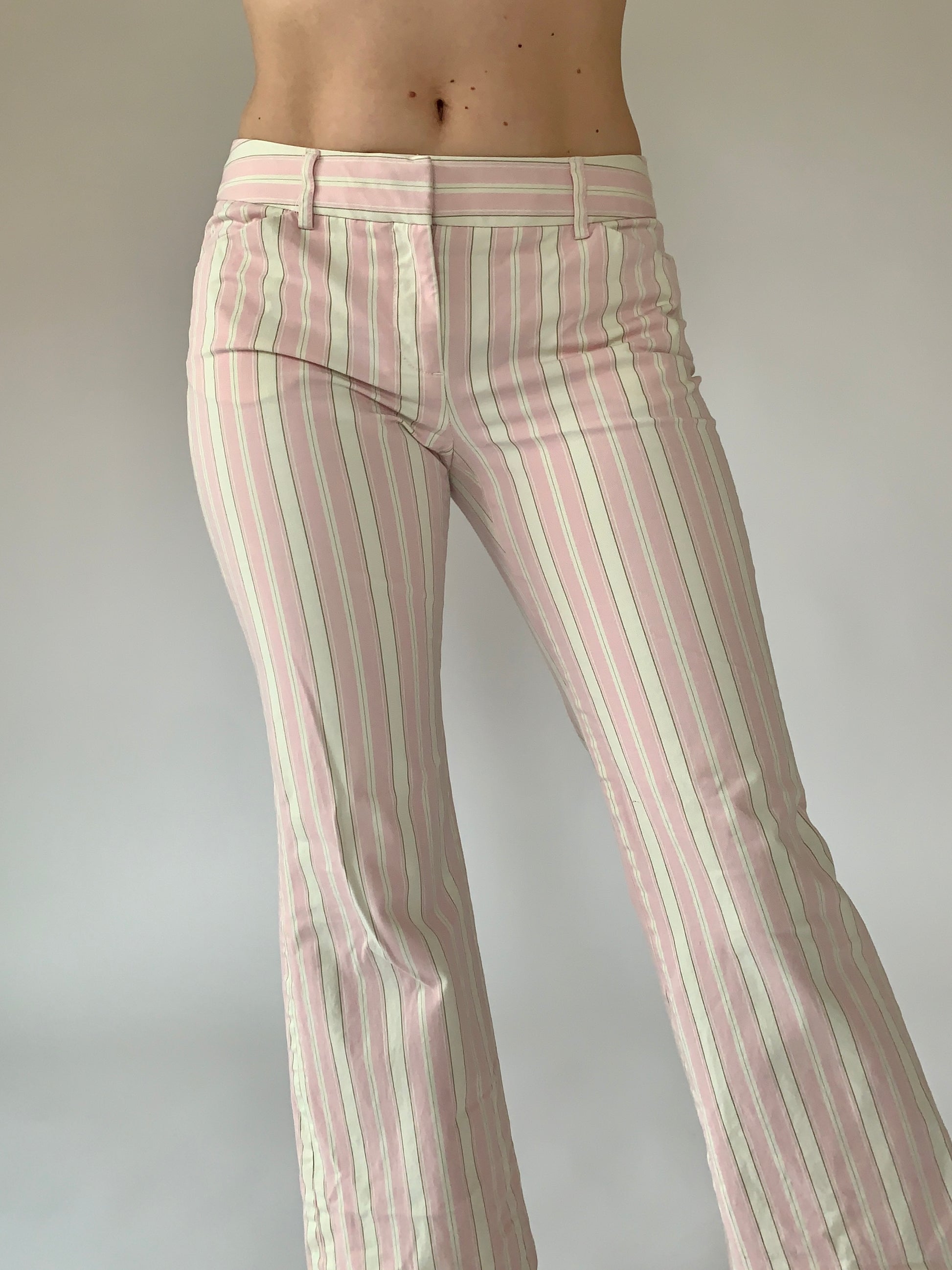 2000s Body by Victoria striped trousers. Low rise with flare. In pink and white. Material is a cotton spandex blend. Excellent condition. Tagged size 2, best fits 28” waist at low rise.