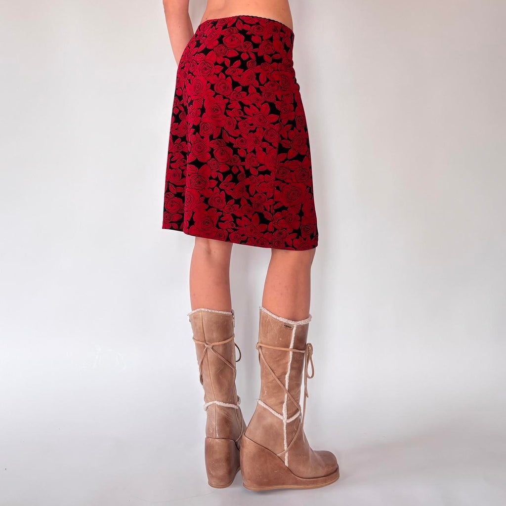 Sophie wears a modern size XS (5’6” tall / 25” waist / 35” hips / 32B bust). This skirt fits her well styled mid or low rise.