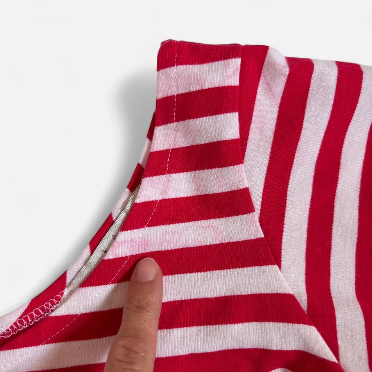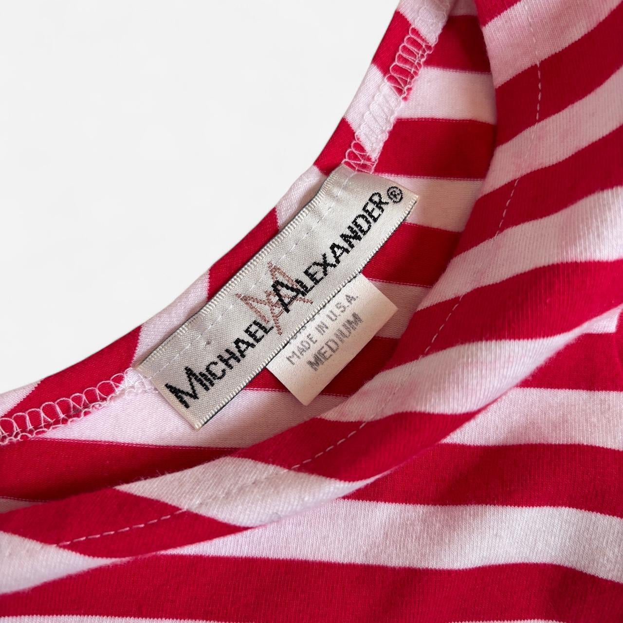 Size small/medium. Tagged size medium. Bust measures 34” and stretches to 38”. Length is 13”. Vintage from the 1990s. Brand is Michael Alexander, made in USA. Red & white. 90% cotton / 10% lycra with stretch. Fair condition with some color bleeding around the shoulders - see photos.