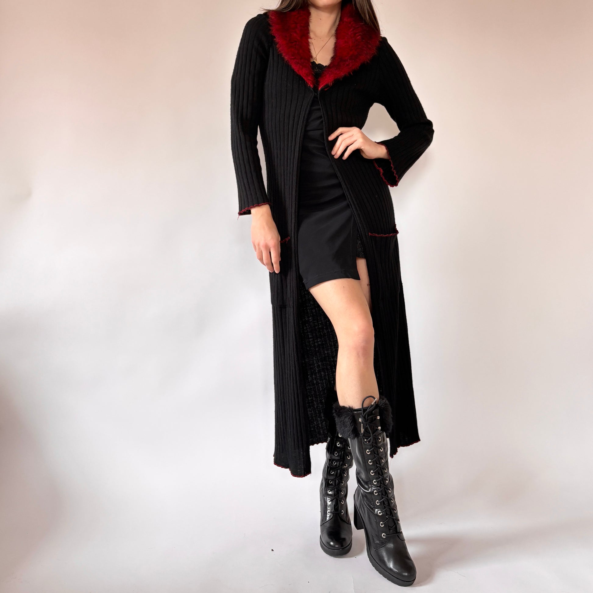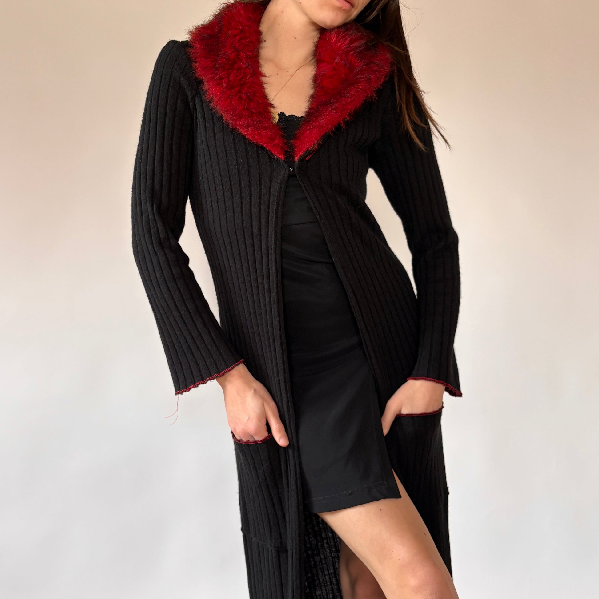 - Black knit with red faux fur