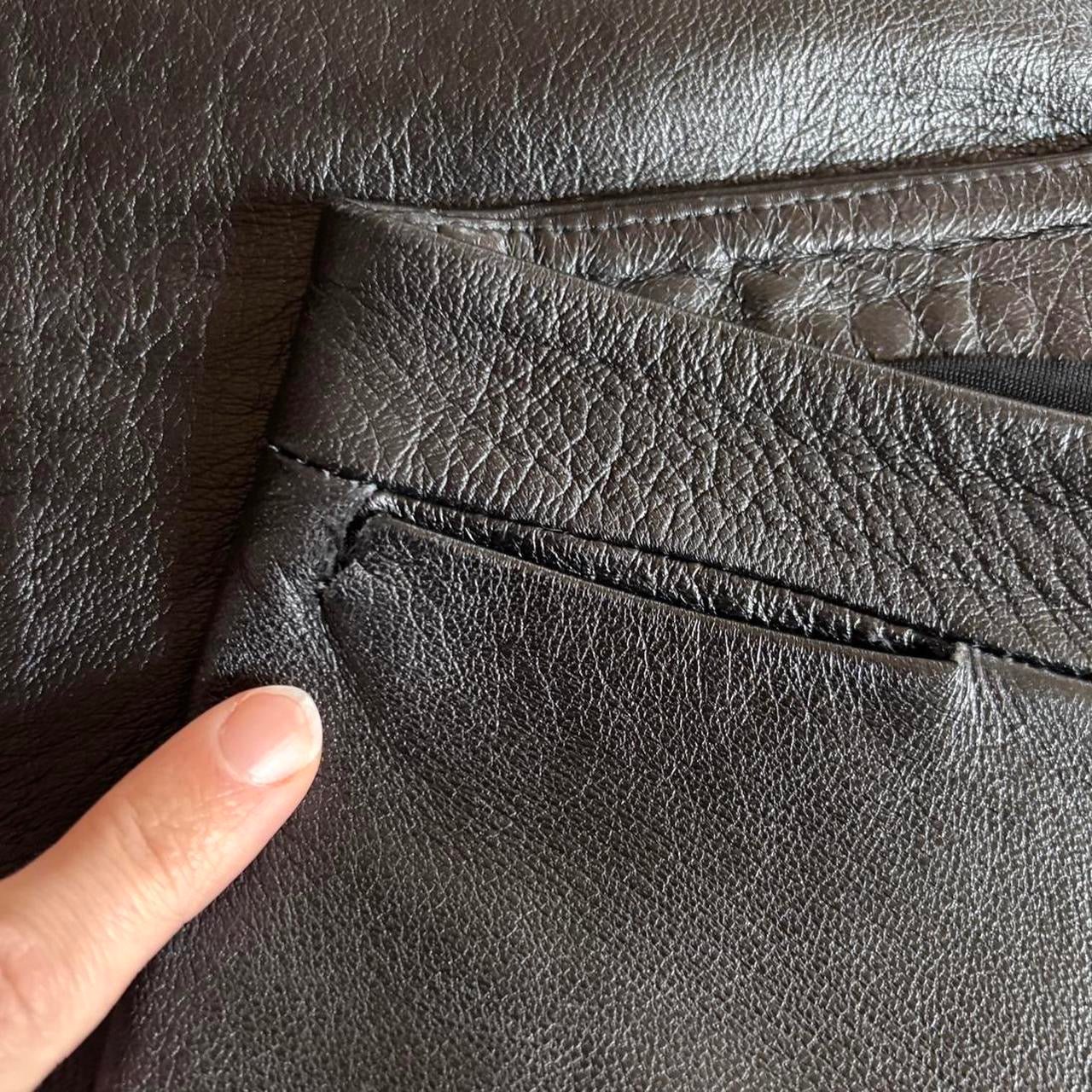 Good, front pocket has a little tear (see photos) — Most of our pieces are preloved <3 expect a little character. Any major imperfections have been noted. Please check measurements, as all sales are final.