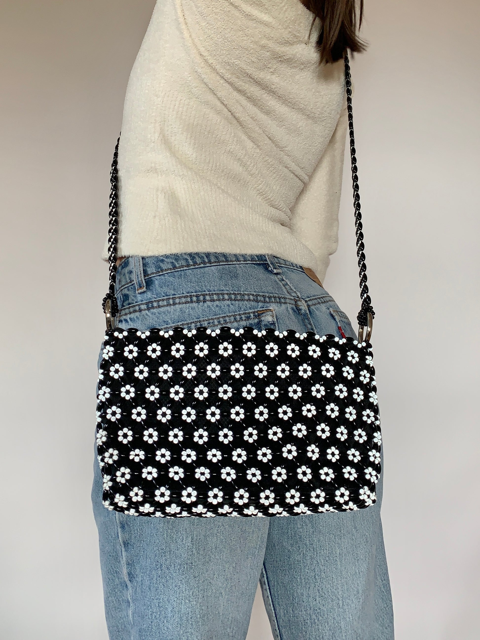 Contemporary beaded crossbody bag. In black and white. Excellent condition. Body measures 7 inches tall by 12 inches wide.