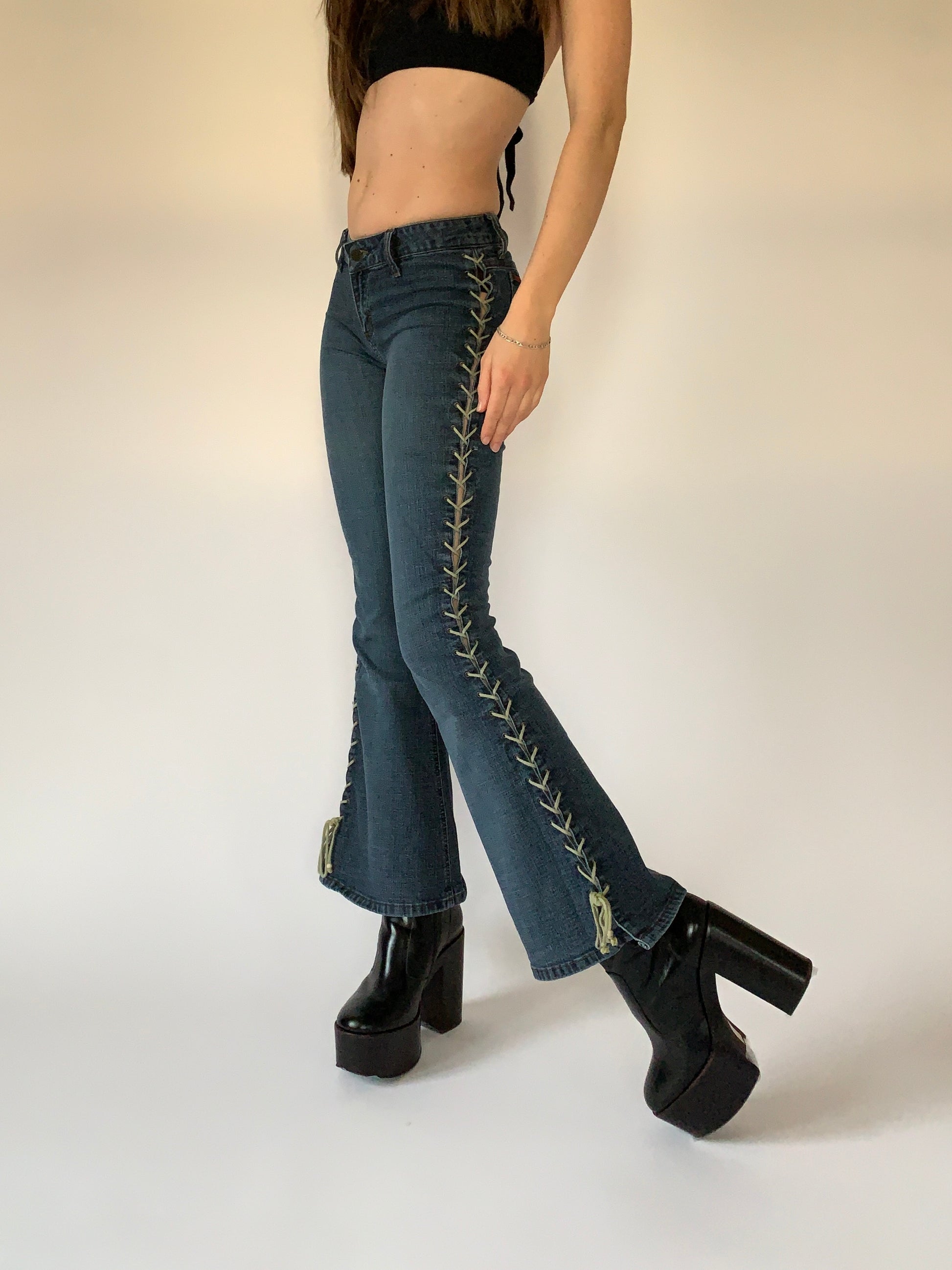 Early 2000s Mudd lace up jeans. Low rise with flare. In a dark wash with full lace up sides. Material is a cotton/poly/spandex blend with stretch. In excellent condition. Tagged size 3, best fits sizes XXS-XS.