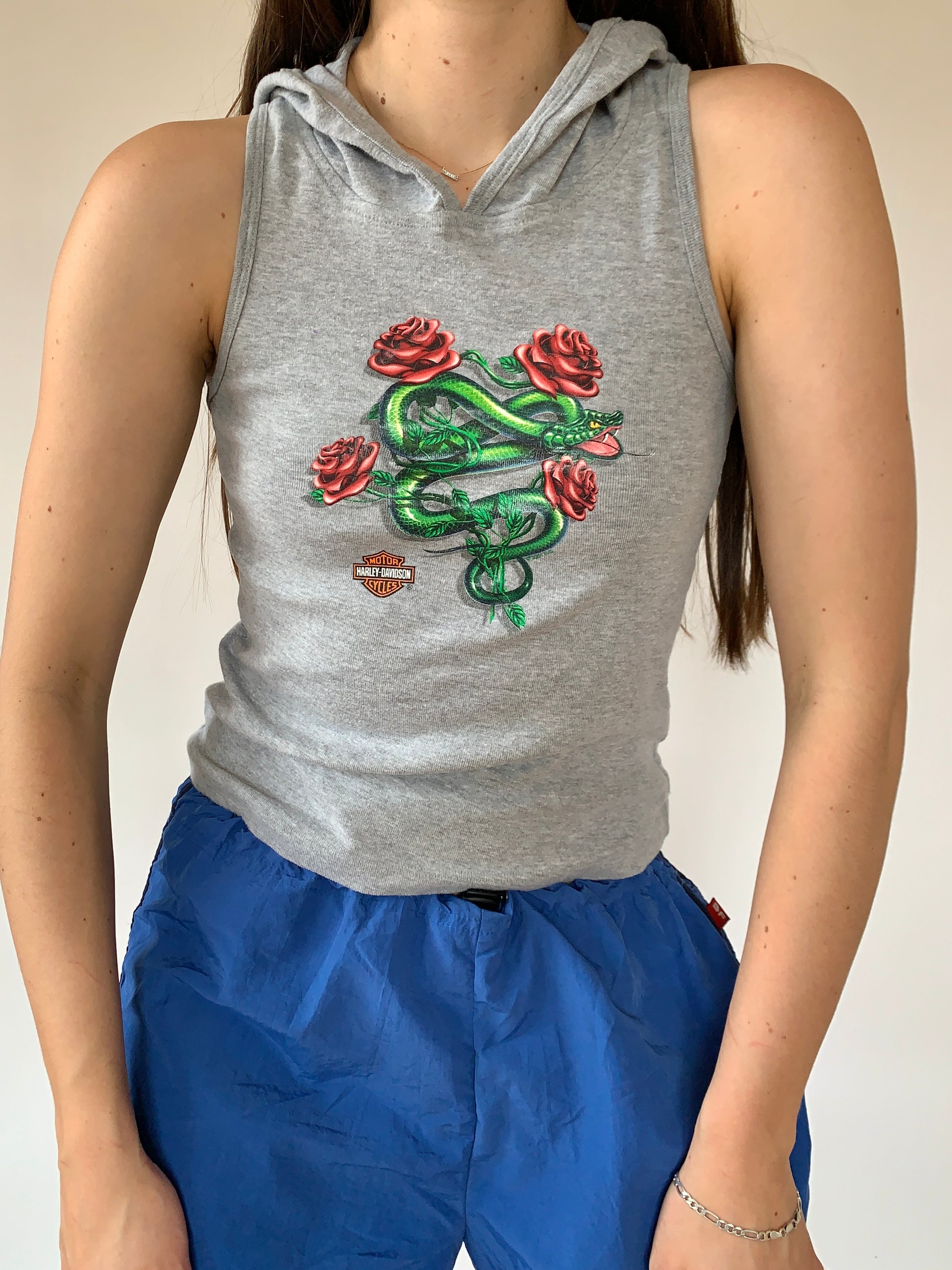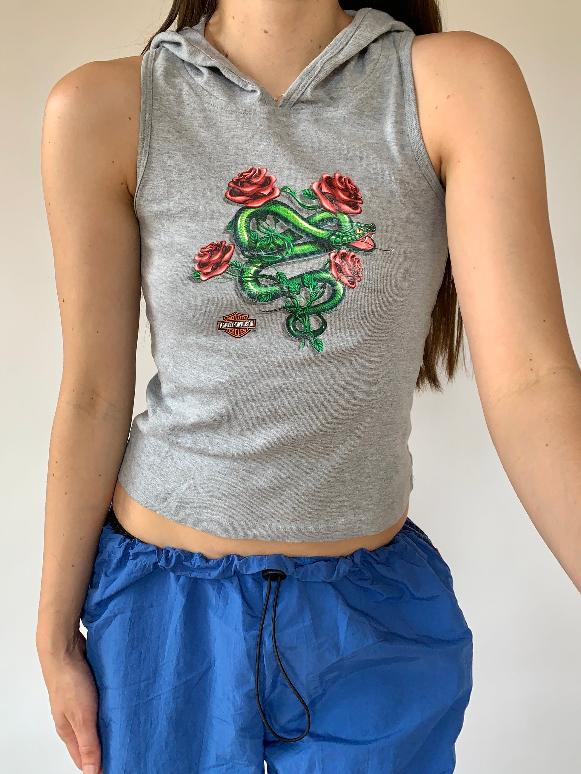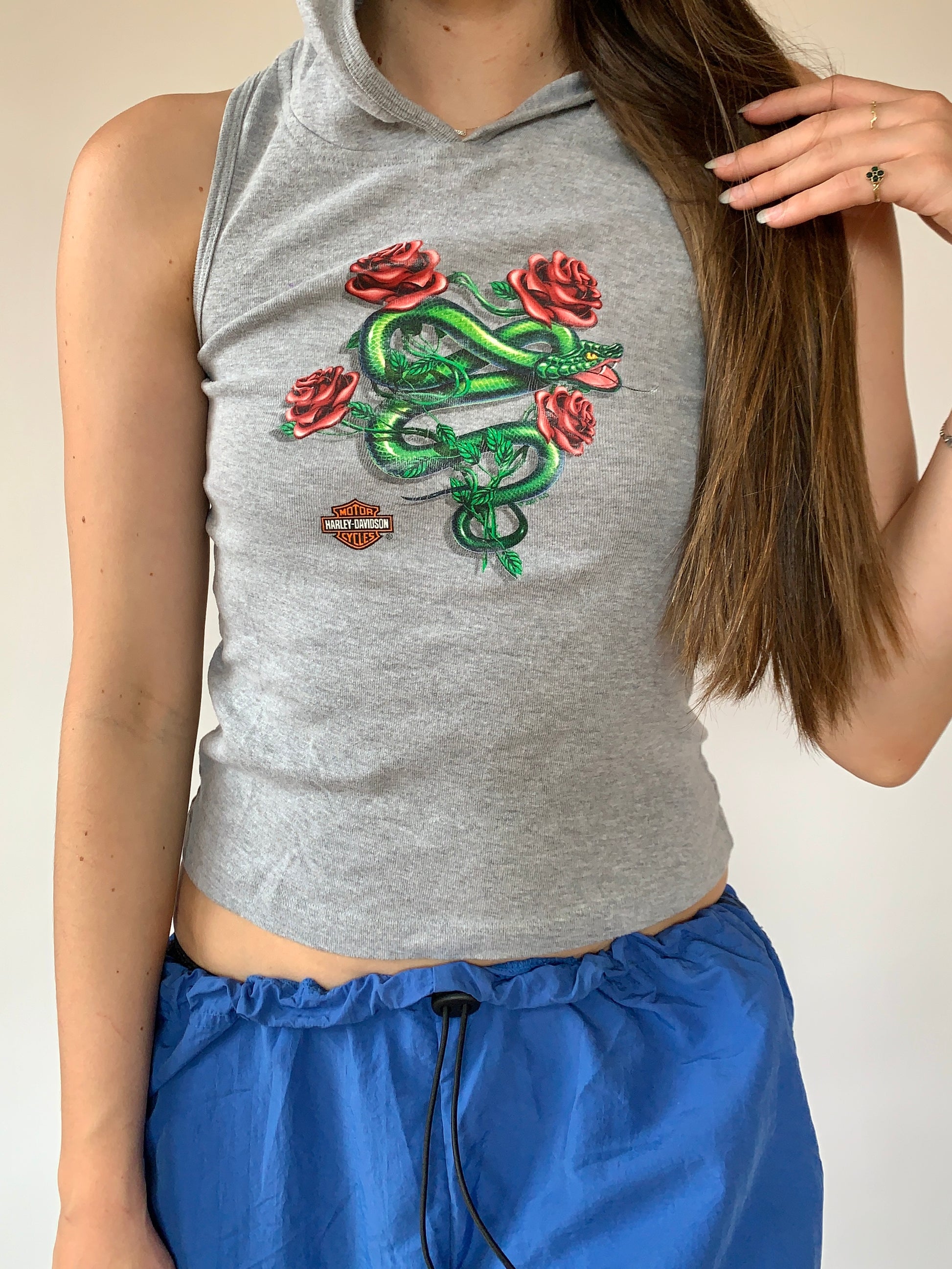 2001 Harley Davidson hooded tank. In gray with a snake and rose graphic. Material is a cotton poly blend. Excellent condition. Tagged size S, shown on size S.