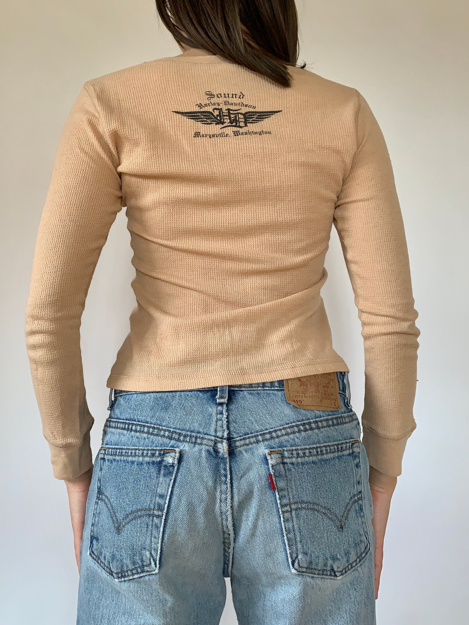Harley Davidson long sleeve waffle tee, made in 2006. In tan. Material is a cotton/poly blend. Good condition. Tagged size M.