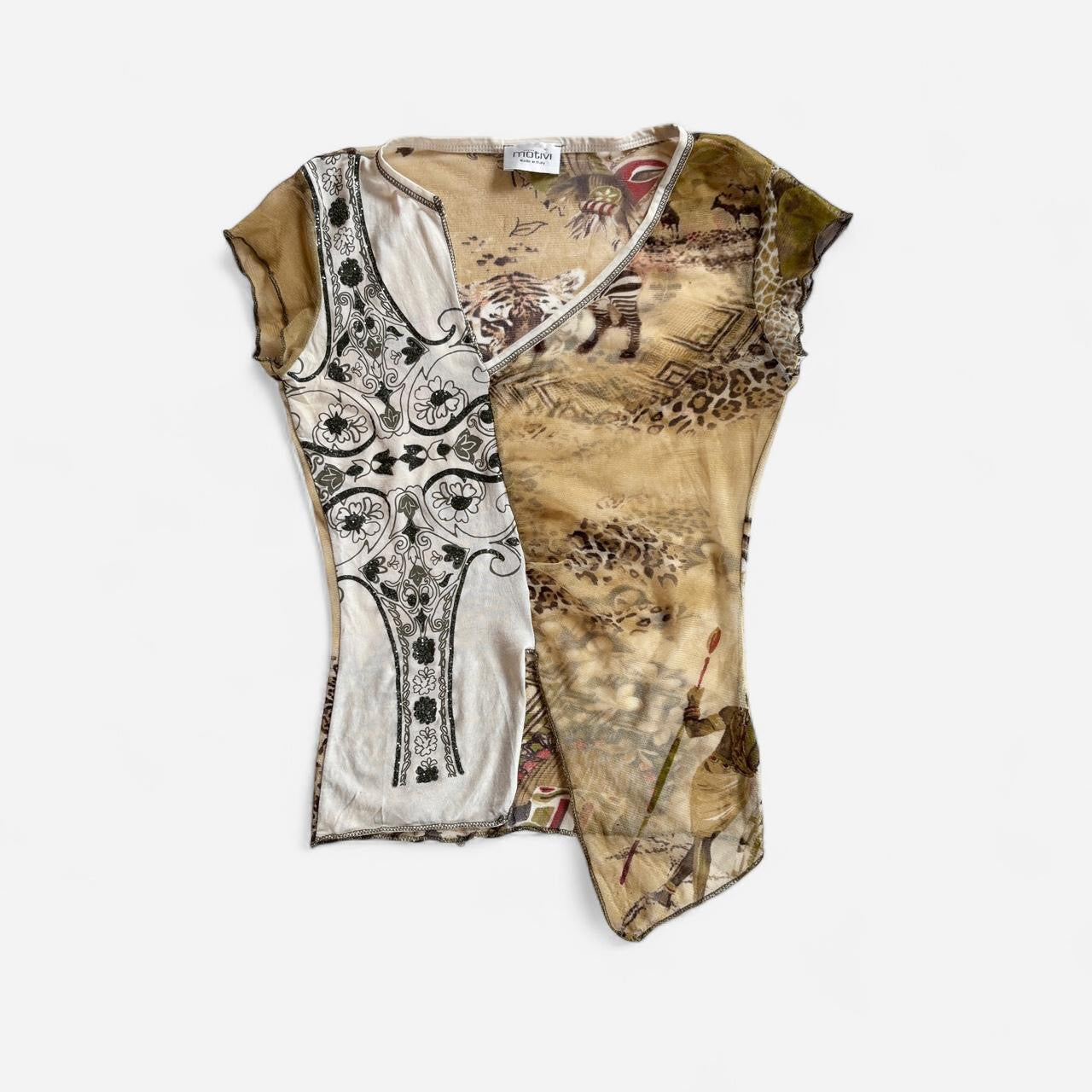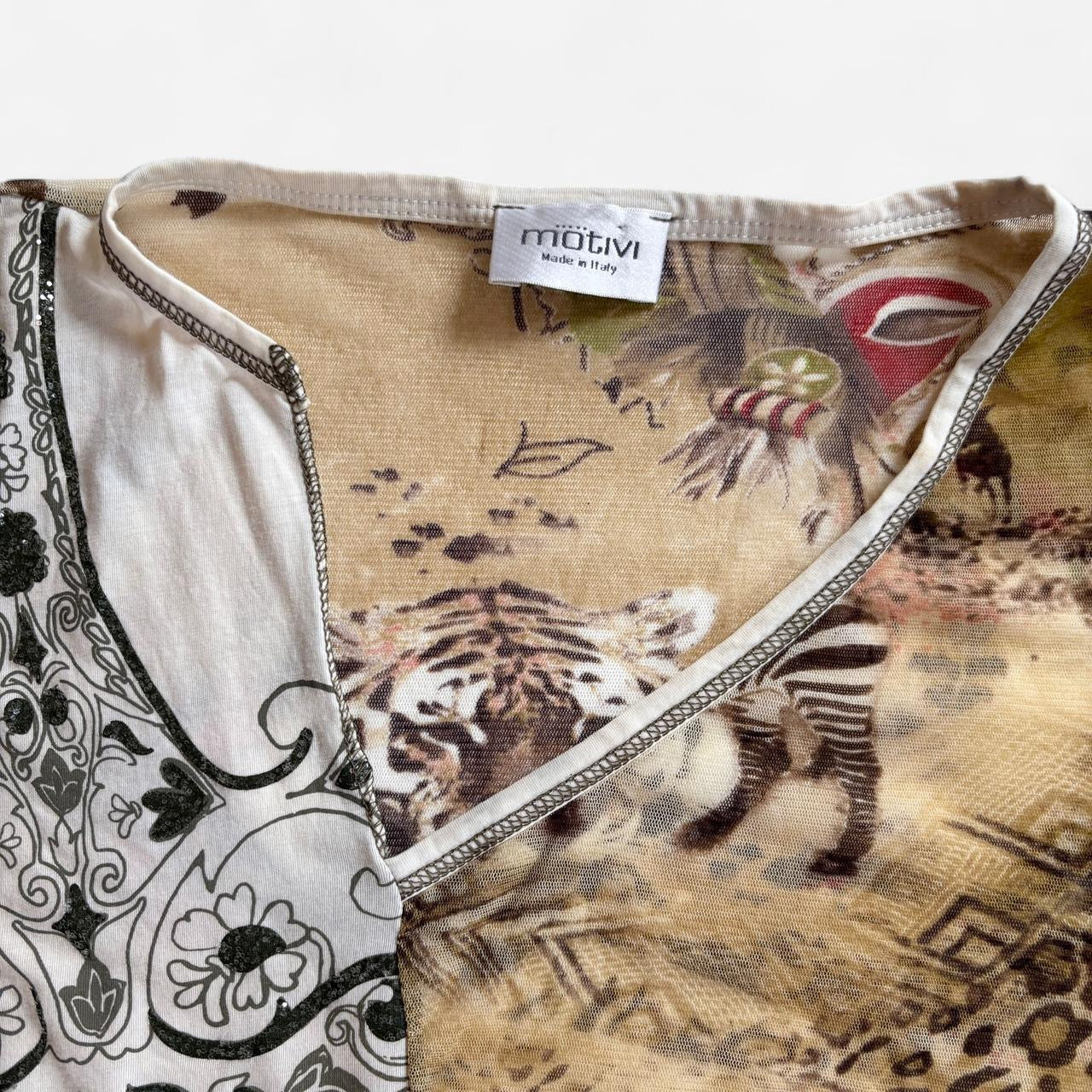 Size xs. Bust measures 28” and stretches to 34”. Length is 23”. Vintage from the 2000s. Brand is Mötivi, made in Italy. Sheer stretchy safari-printed mesh. Asymmetrical hem. Excellent condition.