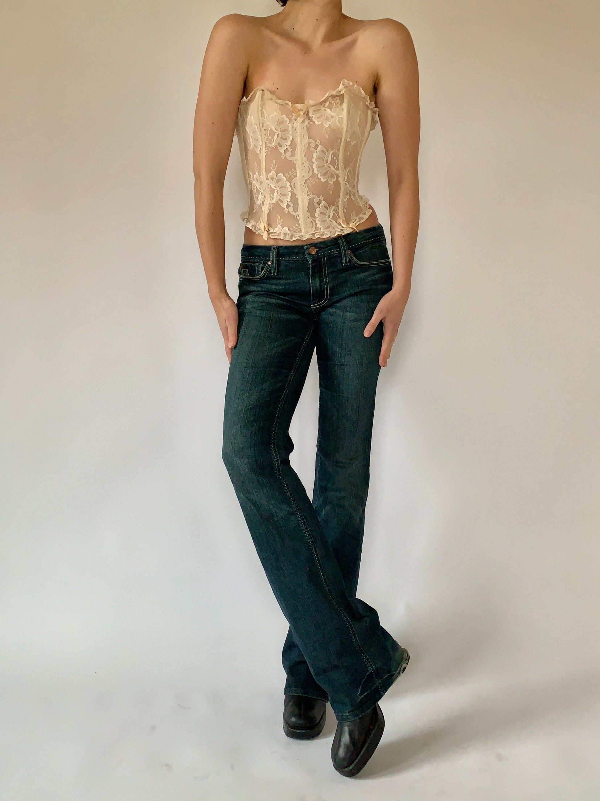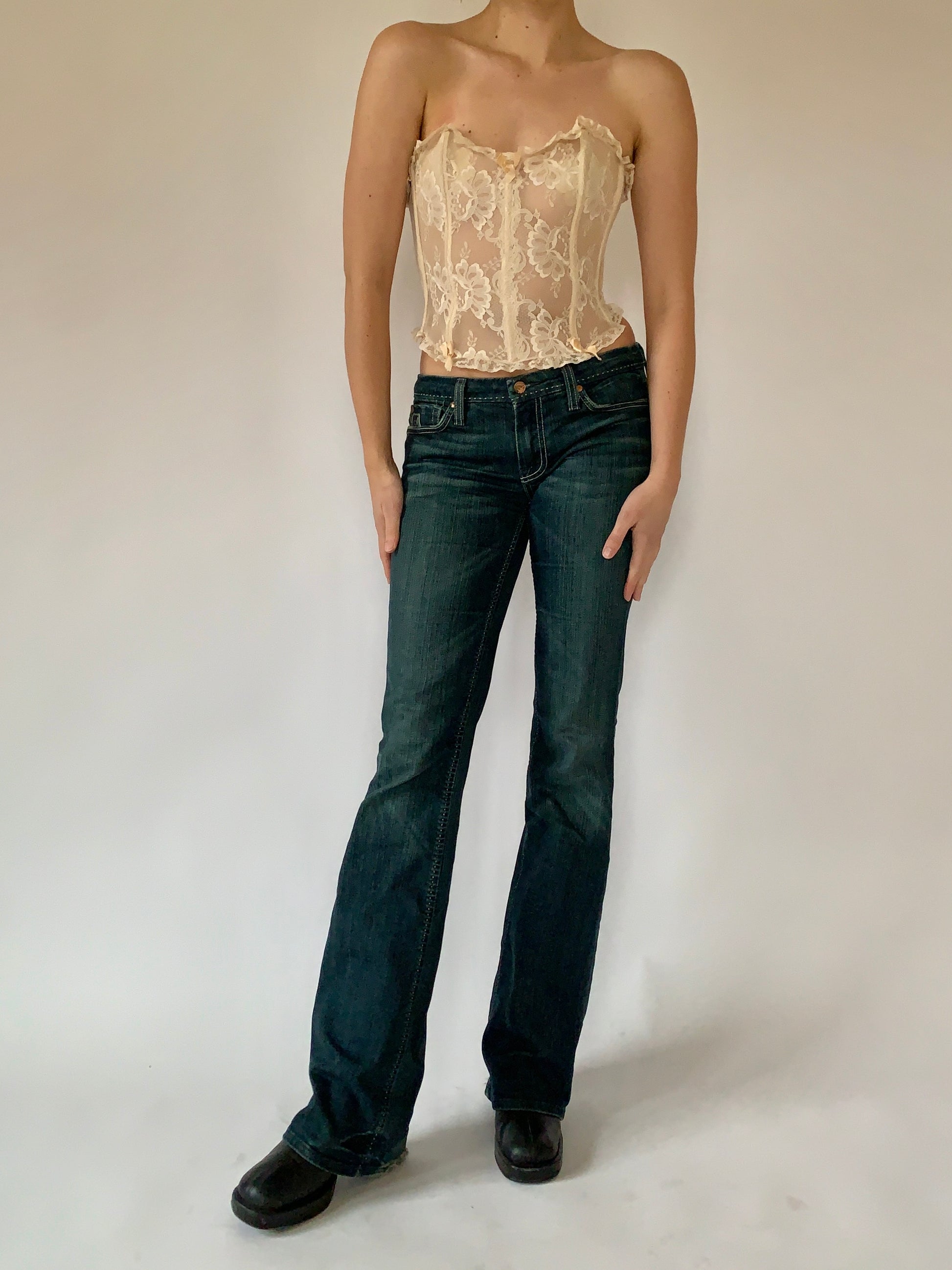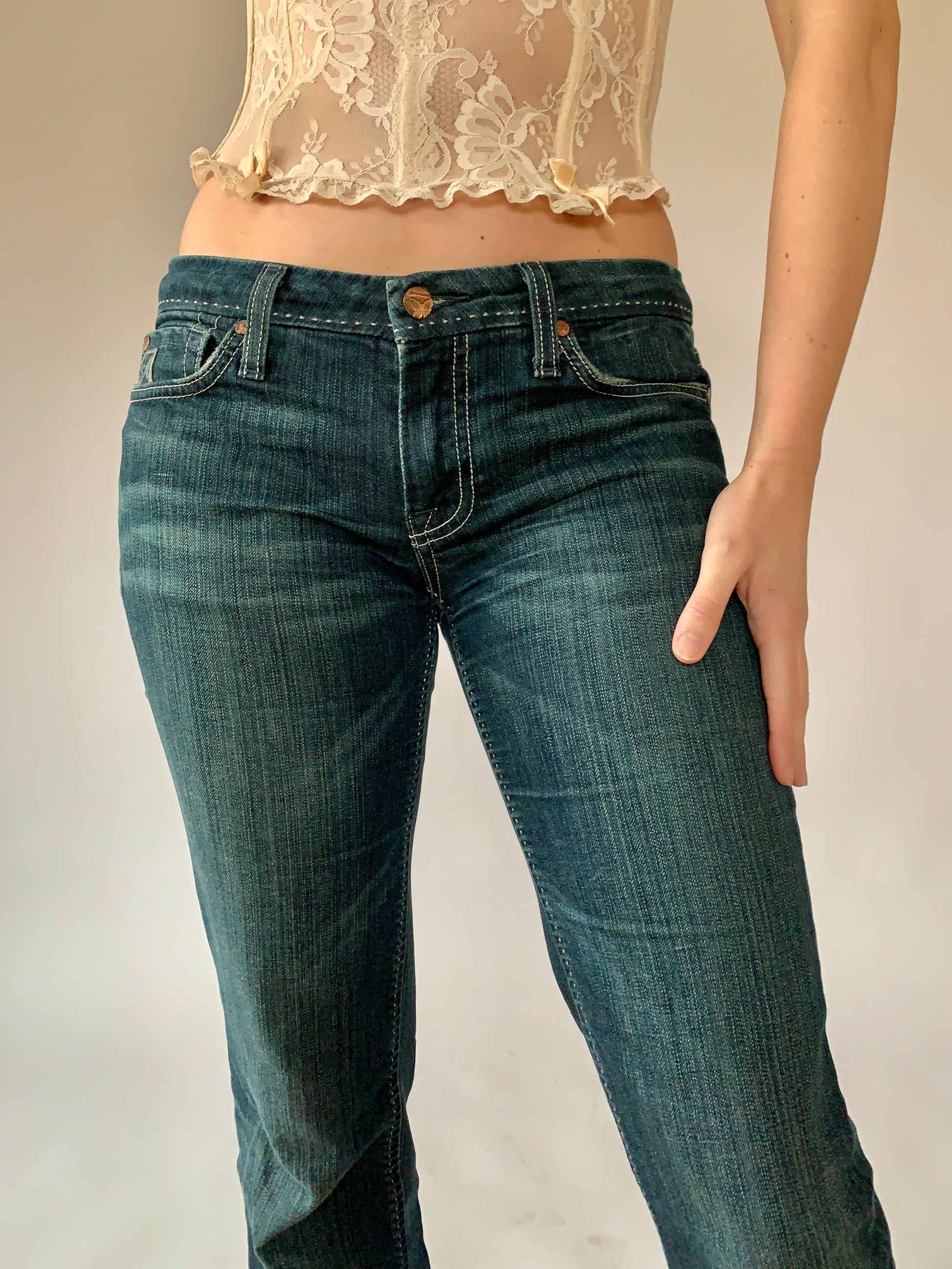 - Labeled a size 27 with stretch, low rise with a boot cut