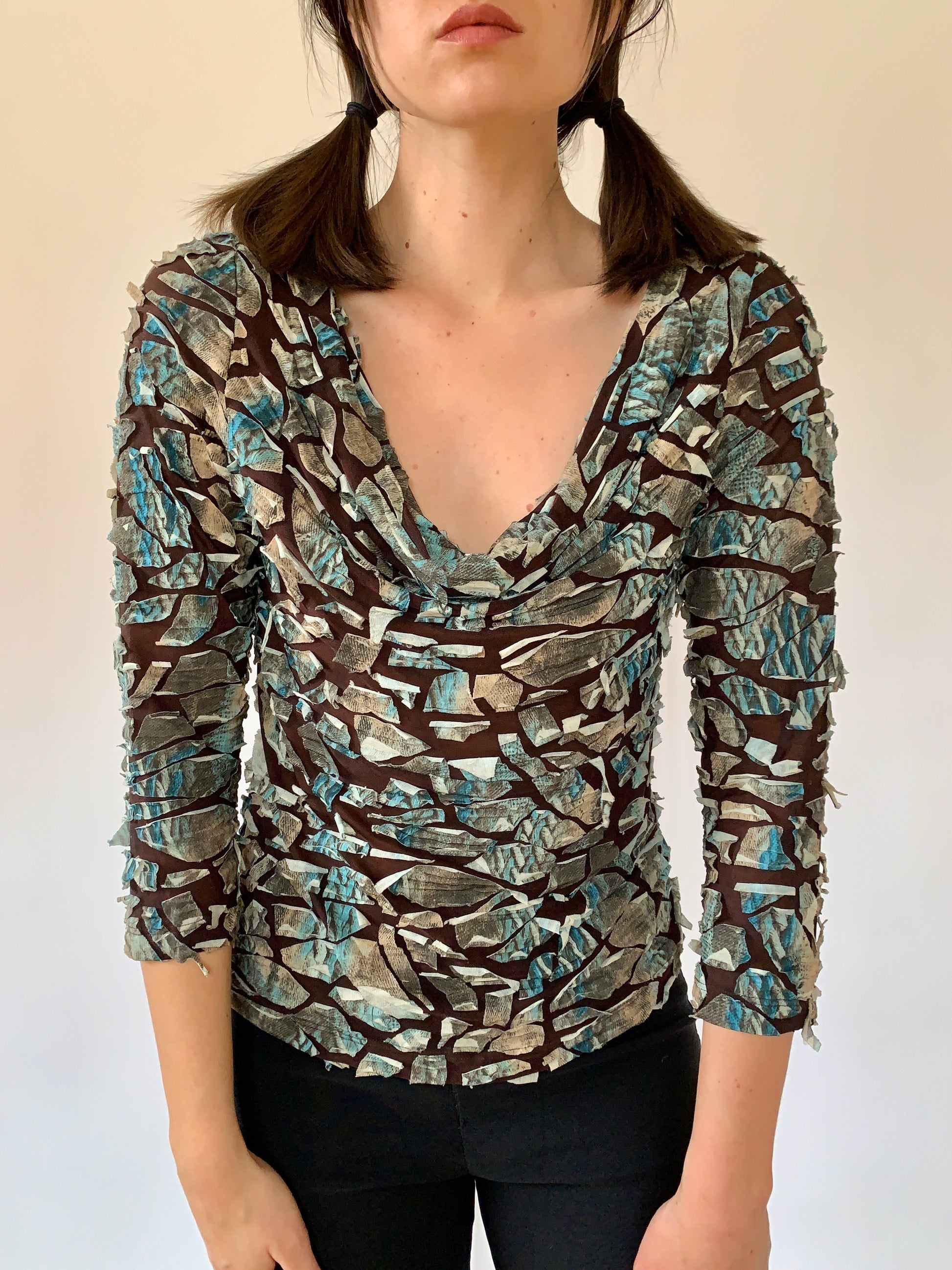 Y2K textured cowl neck blouse in forest