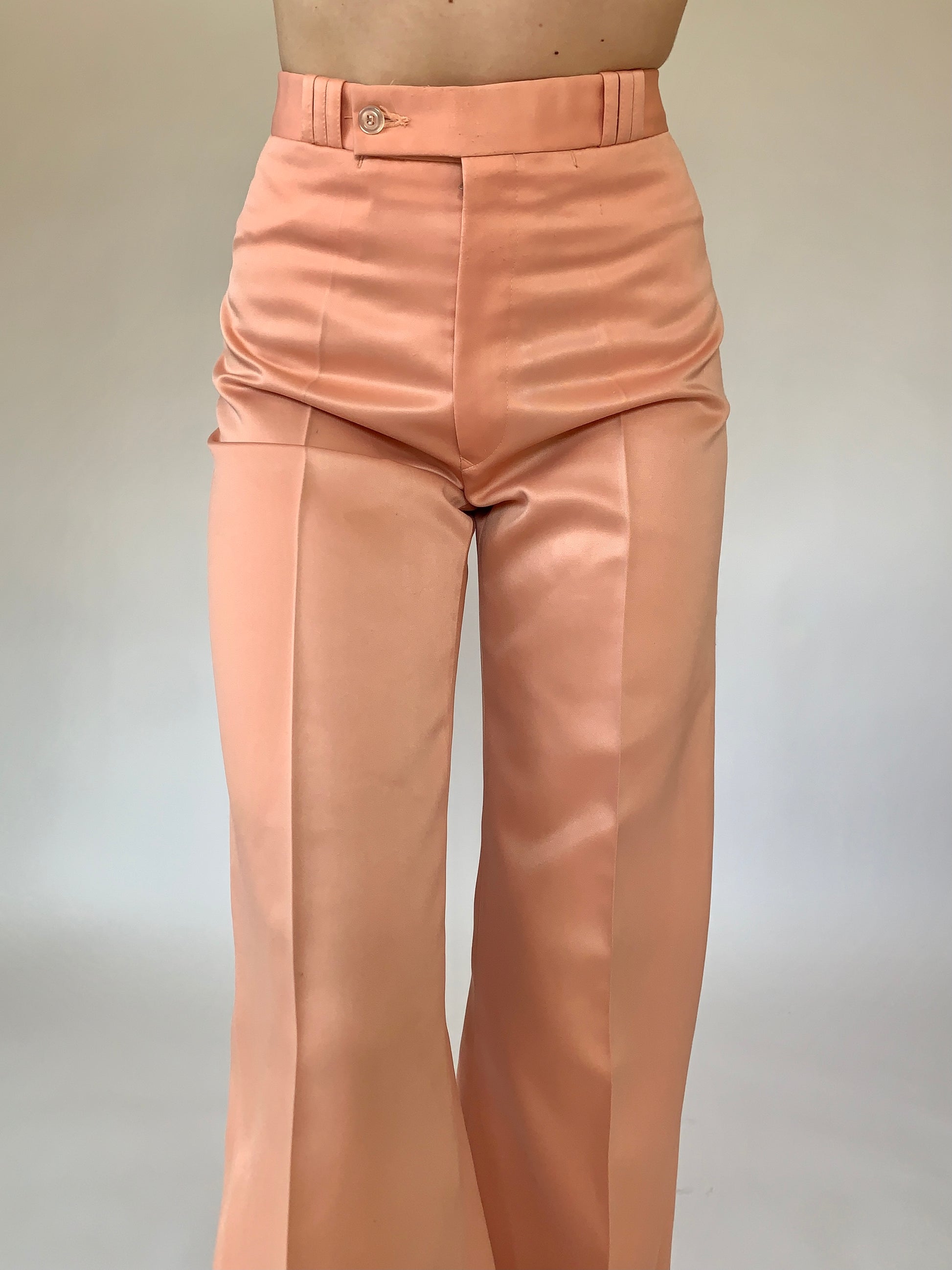 Vintage 1970s Nouvelle by Hal Alpert peach bellbottoms. High waisted with a zip fly and flare. Material is polyester. In good vintage condition despite visible wear including discoloration spots and minor pilling. Tagged size 28, best fits 27-28” waist.