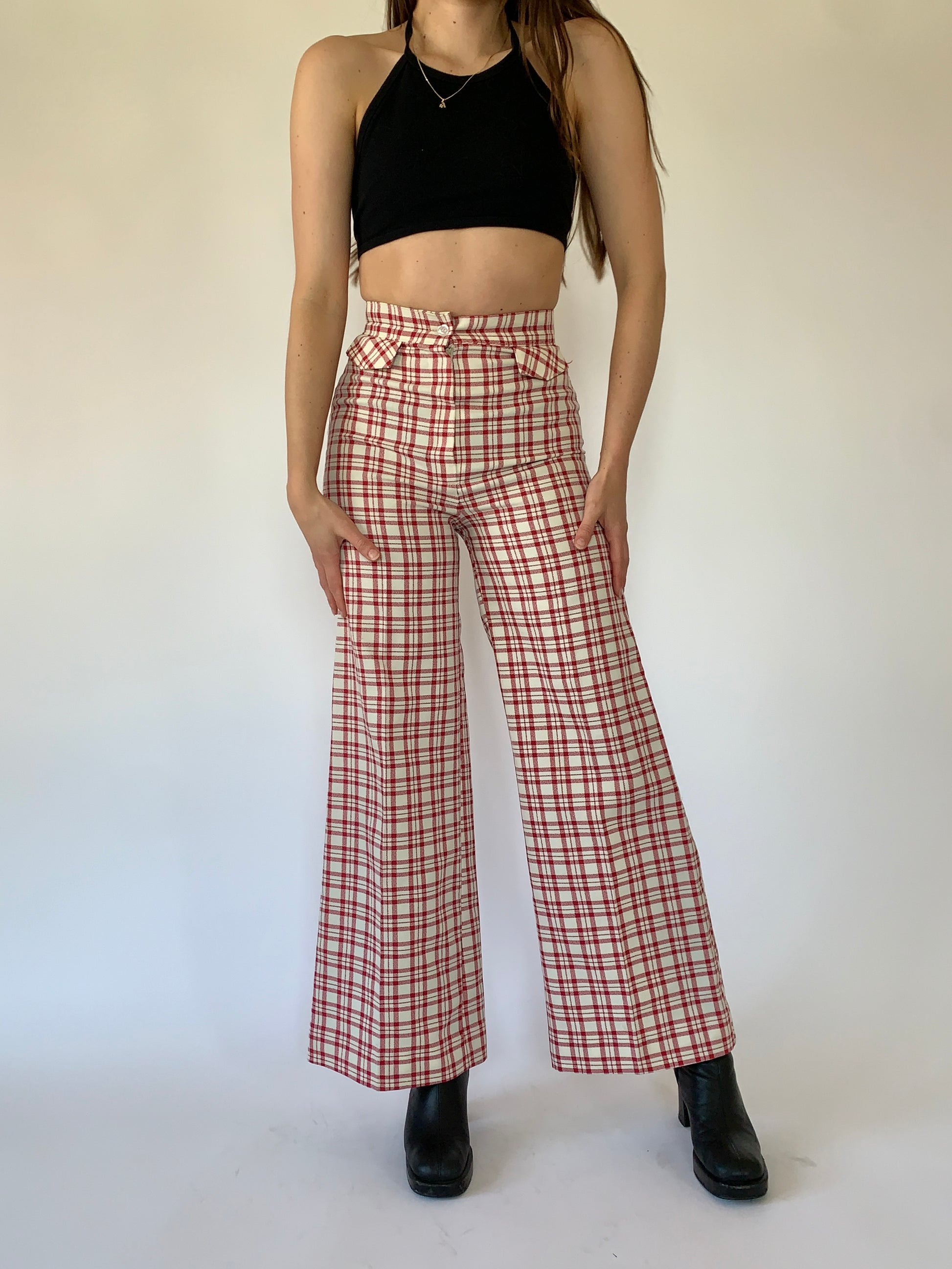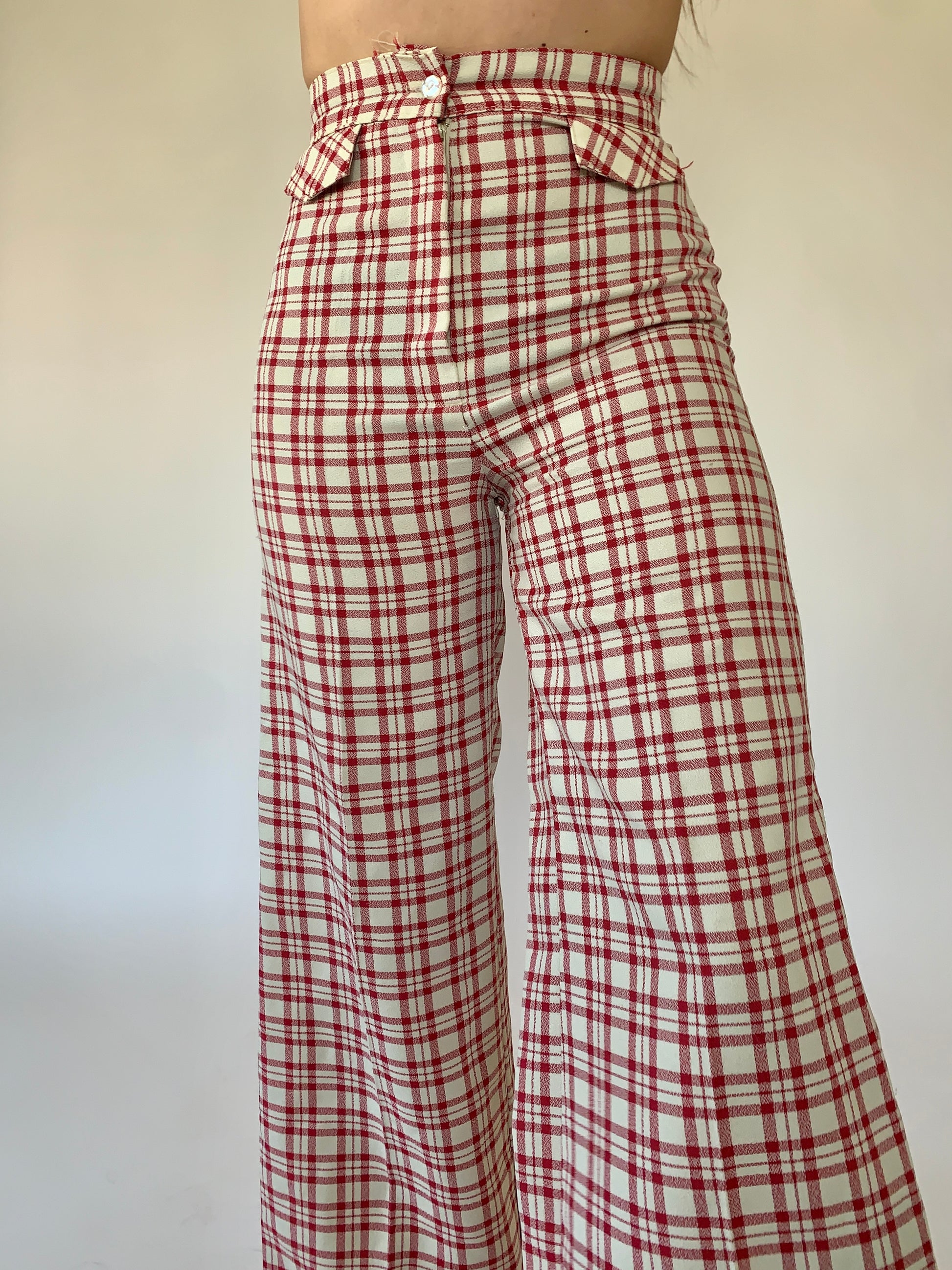 Vintage 1970s plaid bellbottoms, made by Lisa Deb Casuals. High waisted with a zip fly and flared leg. In red and white. Material is polyester. Excellent condition. Best fits 24” waist.