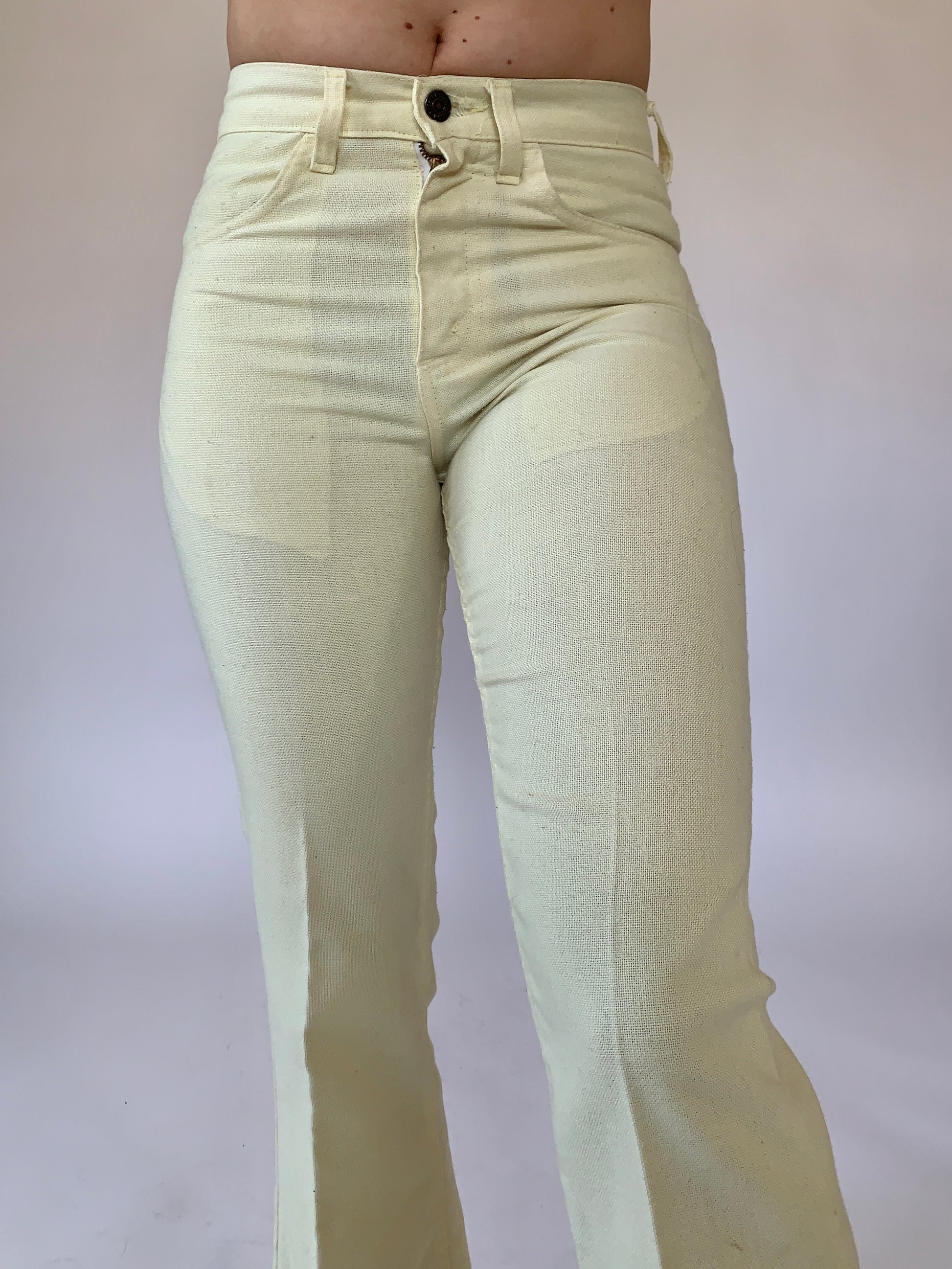 Vintage 1970s big E Levi’s Sta-Prest flares. High rise. In a pale yellow. Good condition despite some light pilling. Best fits 25-26” waist.
