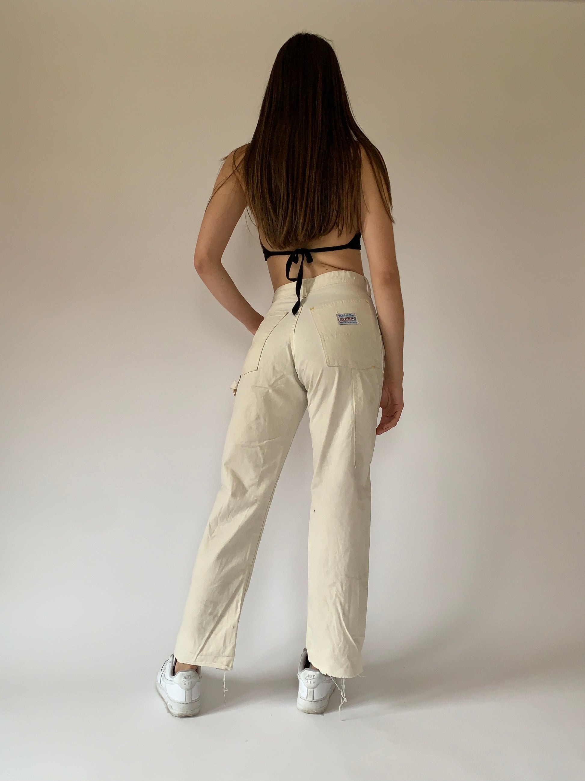Vintage 1970s Carter’s carpenter pants. High waisted with a zip fly and straight leg with raw hem. In an off white cream color. Made in USA. In distressed condition with raw hem and black paint marks on the leg. Best fits 25” waist.