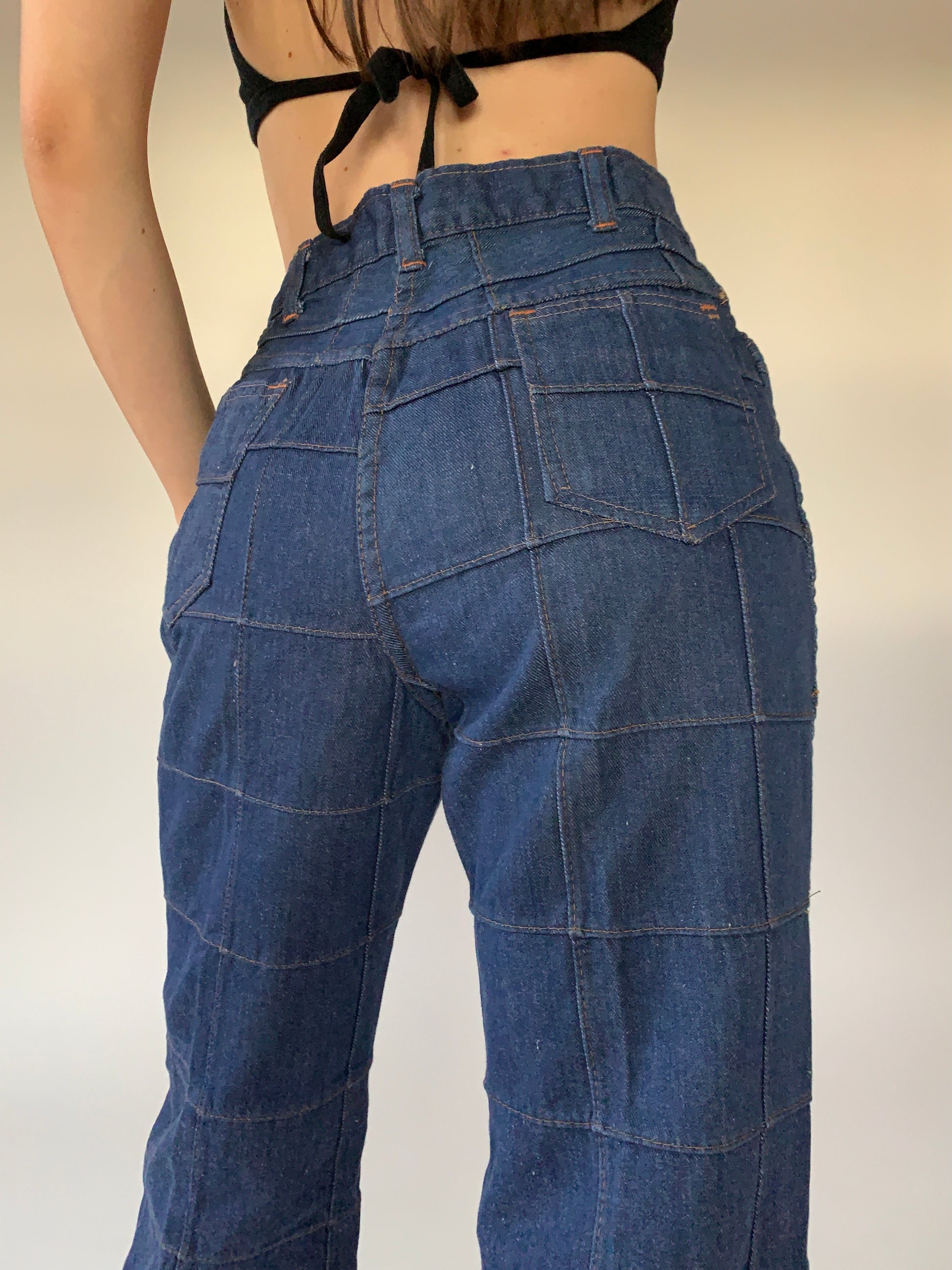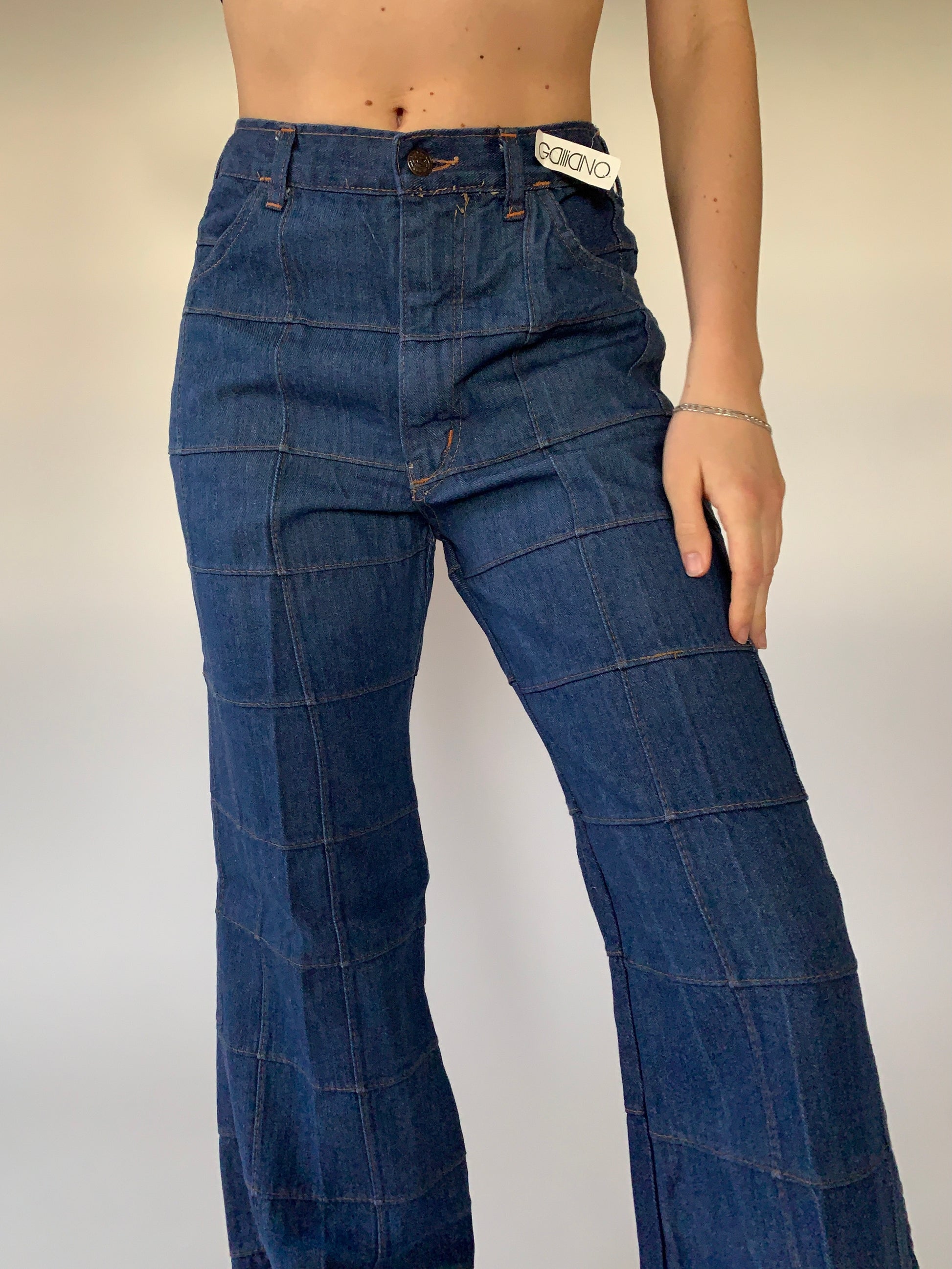 Vintage 1970s deadstock Galliano patchwork jeans. High waisted with a zip fly and flare. In a dark wash. 100% cotton denim. In brand new deadstock condition with original tag attached. No size labeled, best fits 28-29” waist.