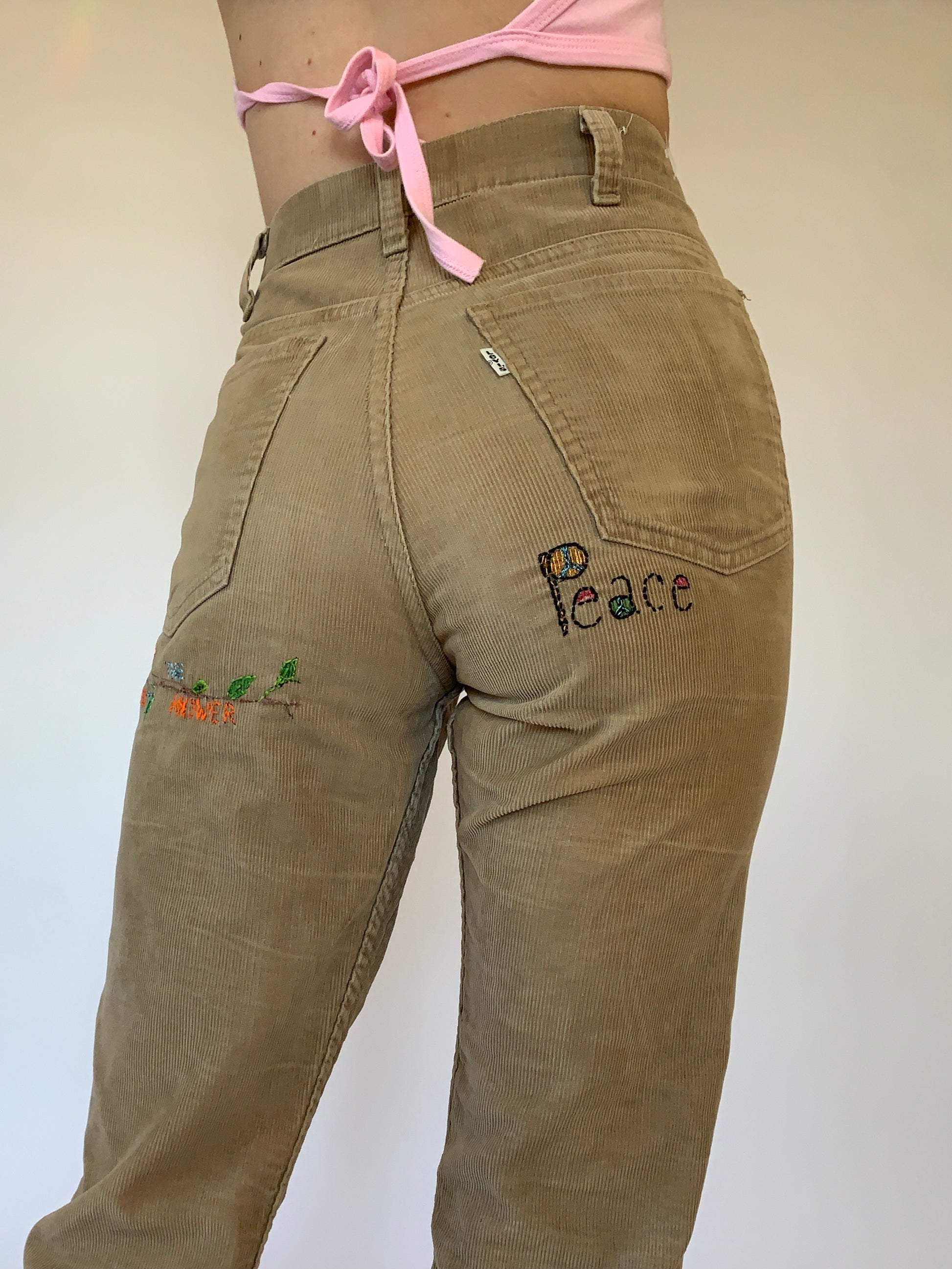 Vintage 1970s Levi’s corduroys. High waisted with a zip fly and boot cut. With the cutest embroidery - “war is not the answer,” and “peace.” In good vintage condition overall despite minimal discoloration and wear. Best fits 30” waist.