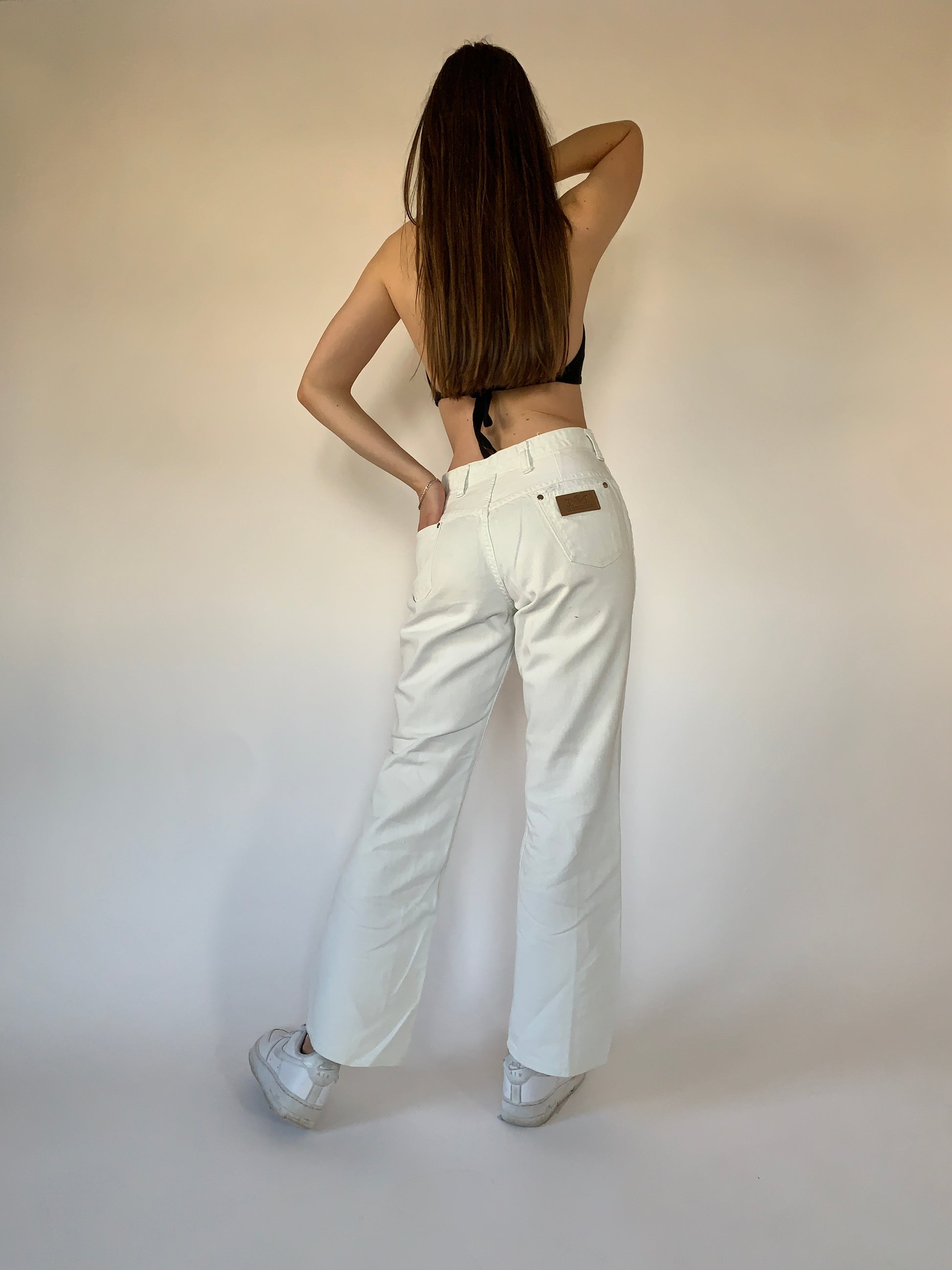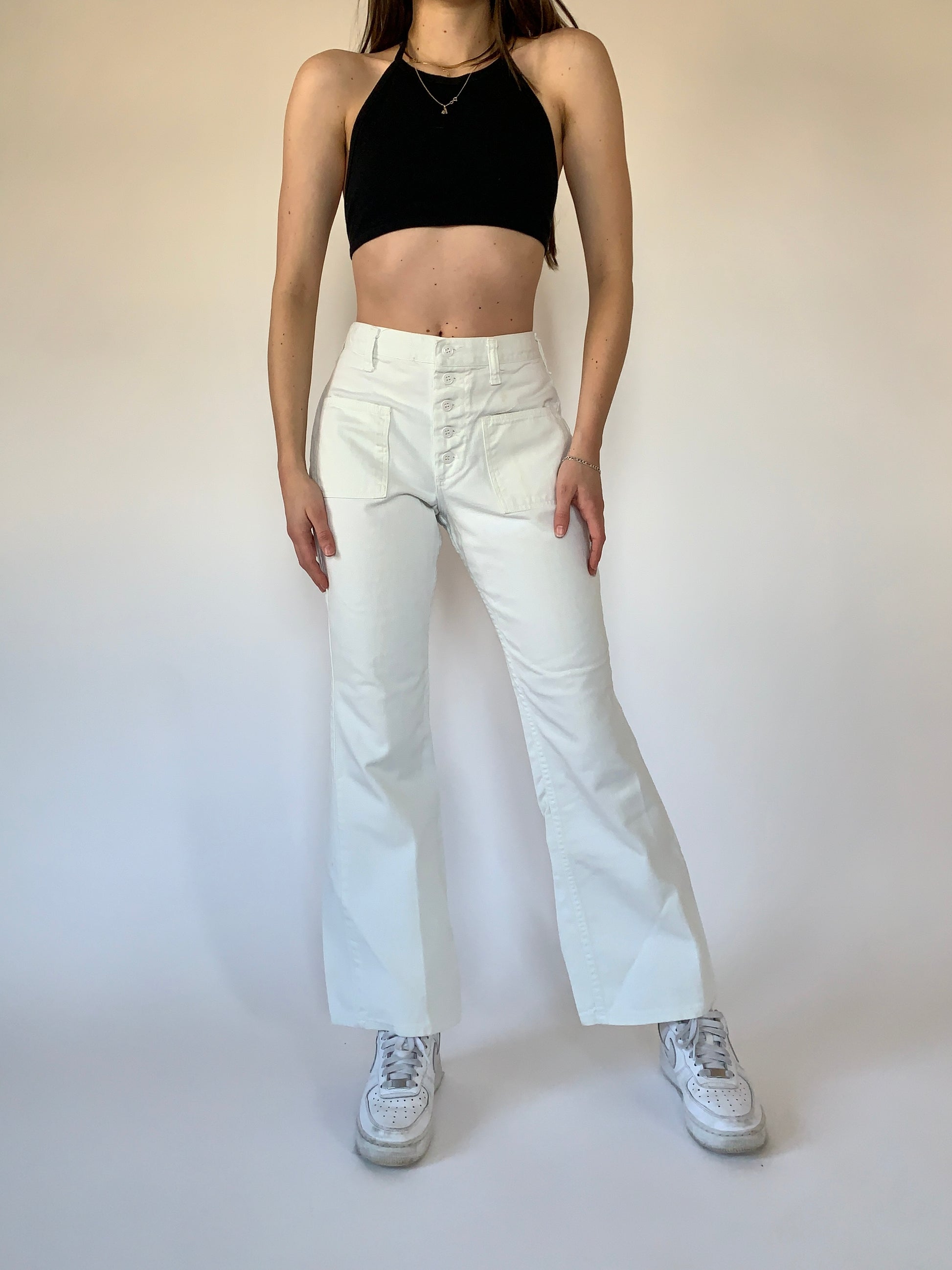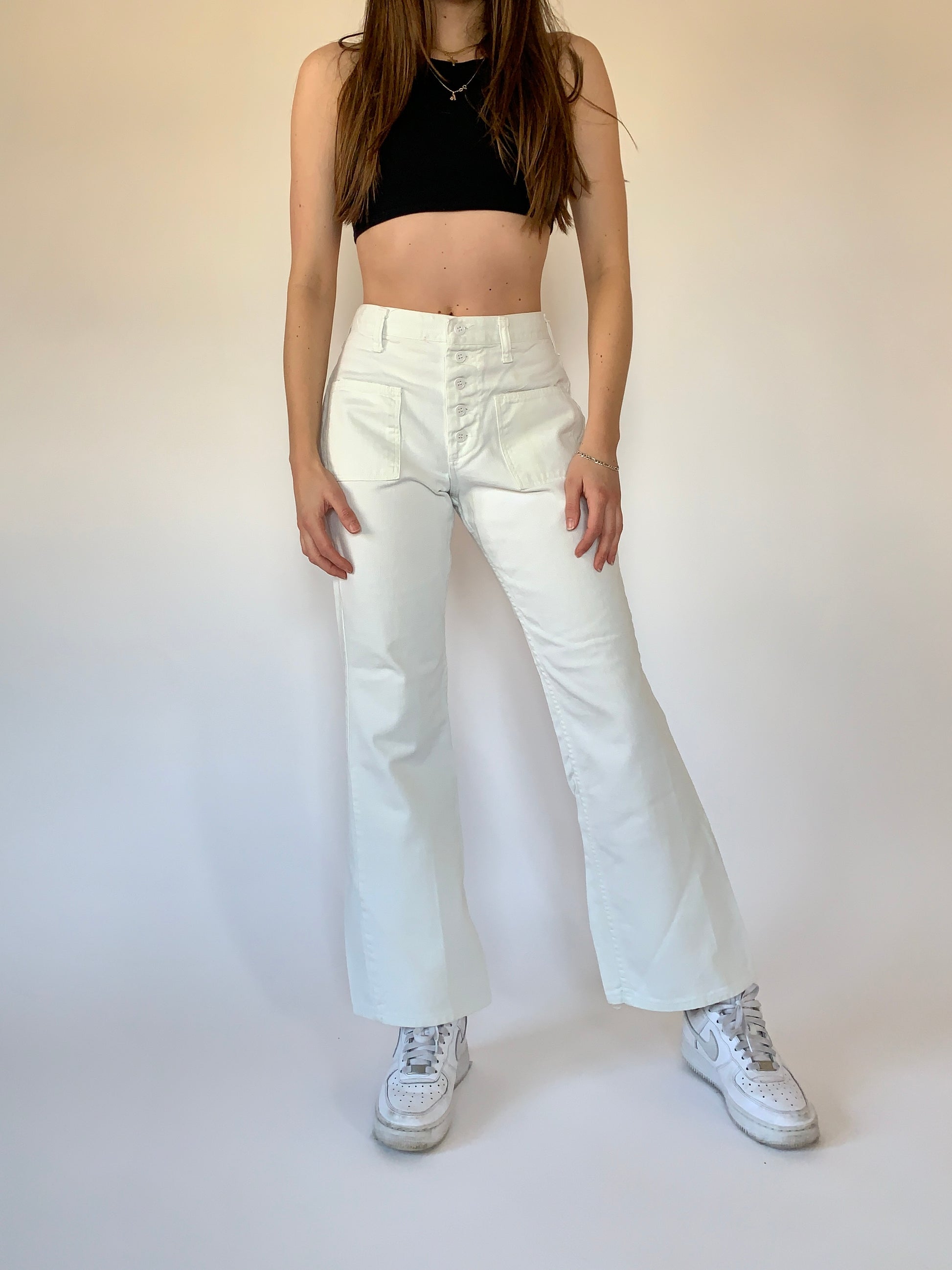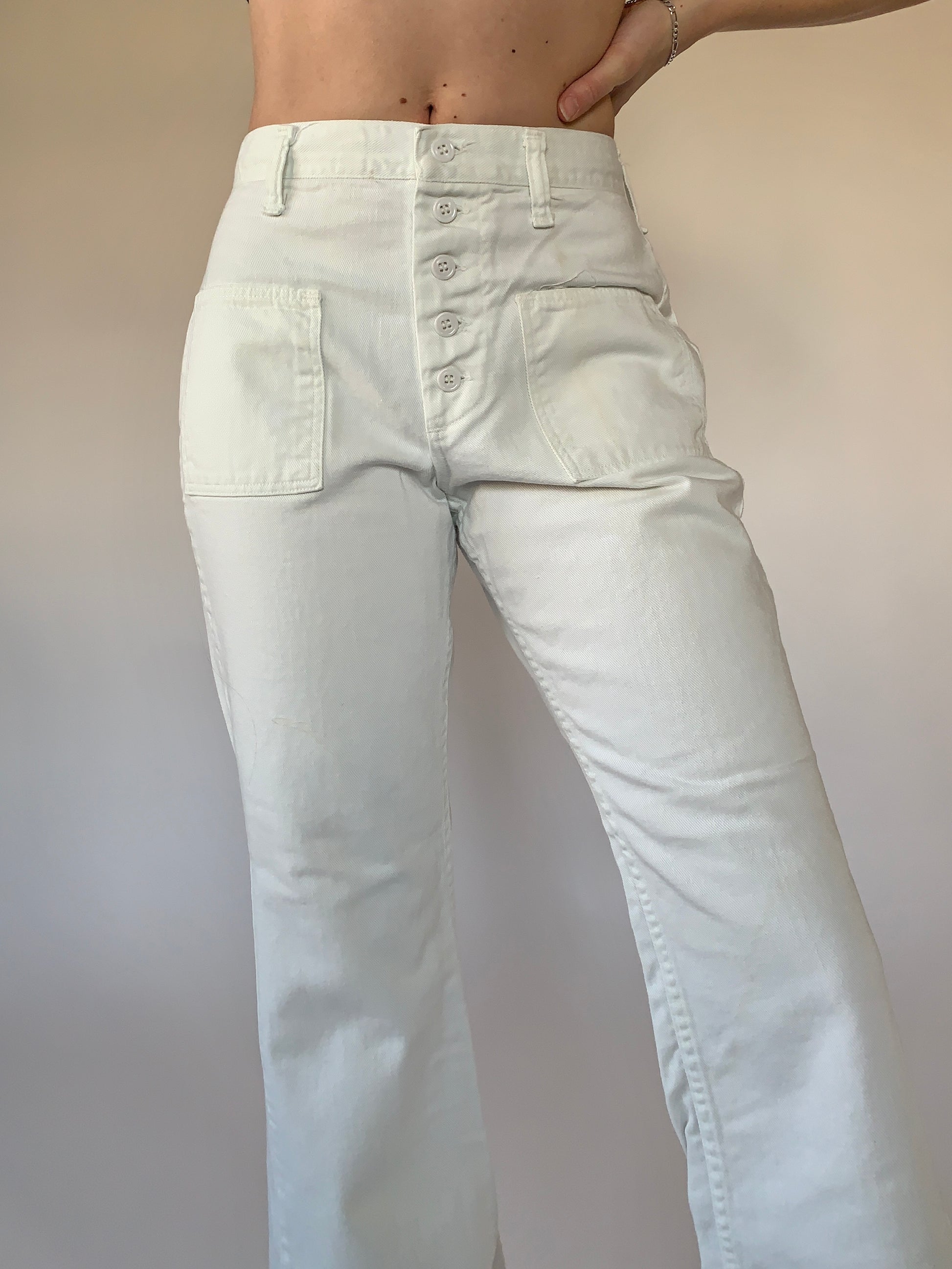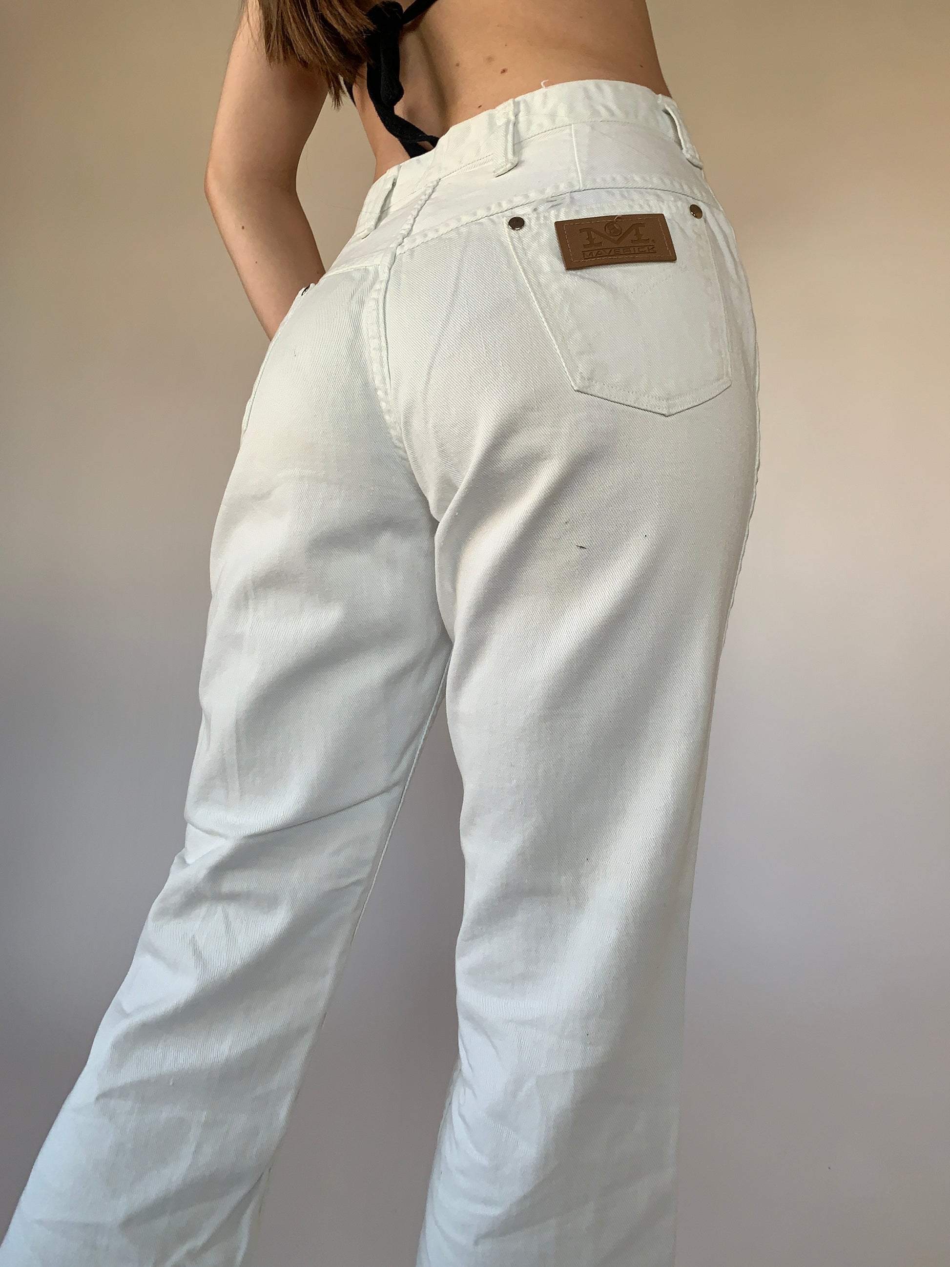 Vintage 1960s/70s Maverick jeans. High waisted with a five button fly and flared leg. In white. Made in USA. In excellent condition despite some minor discoloration due to age. Best fits 25-26” waist.