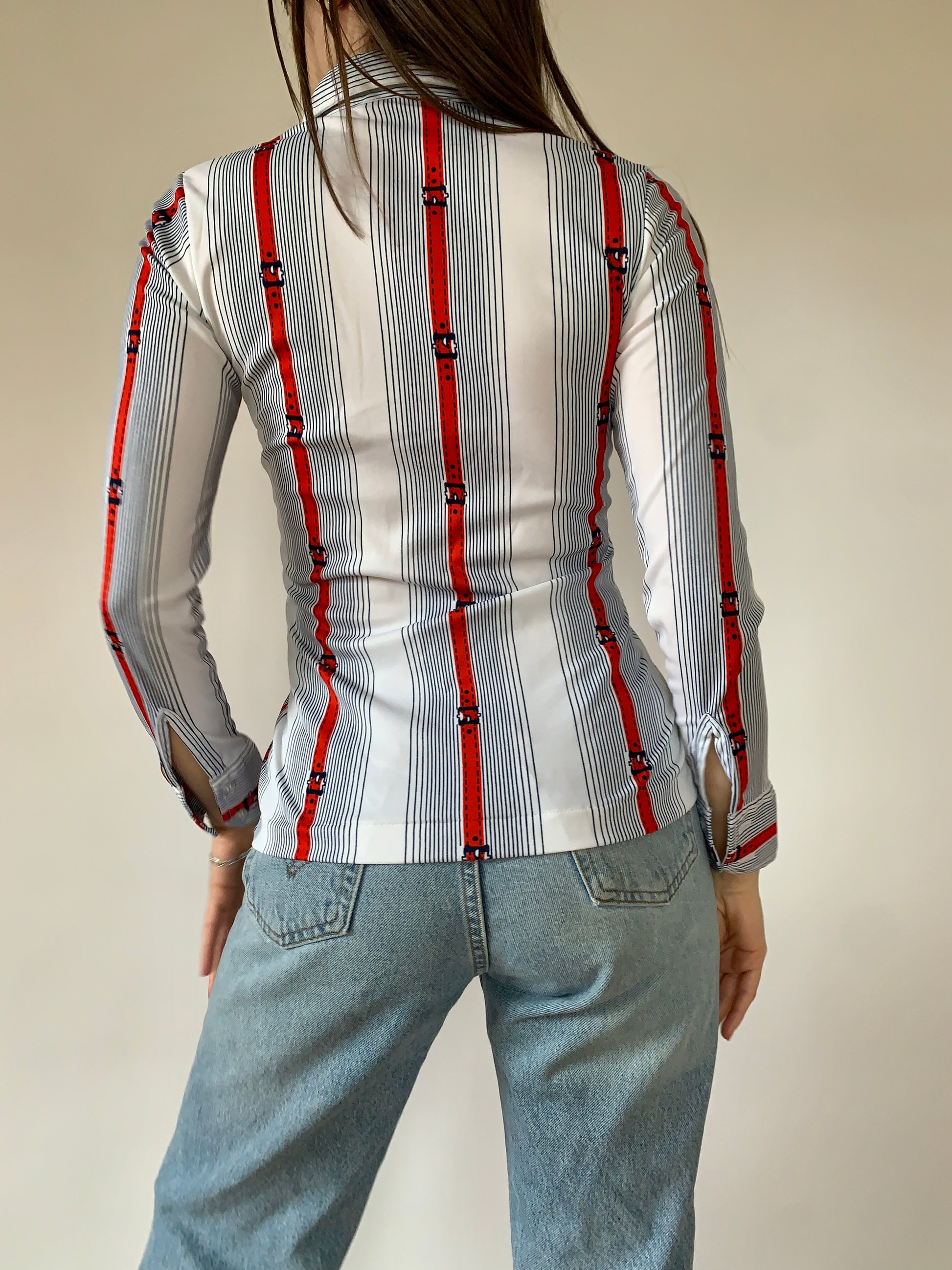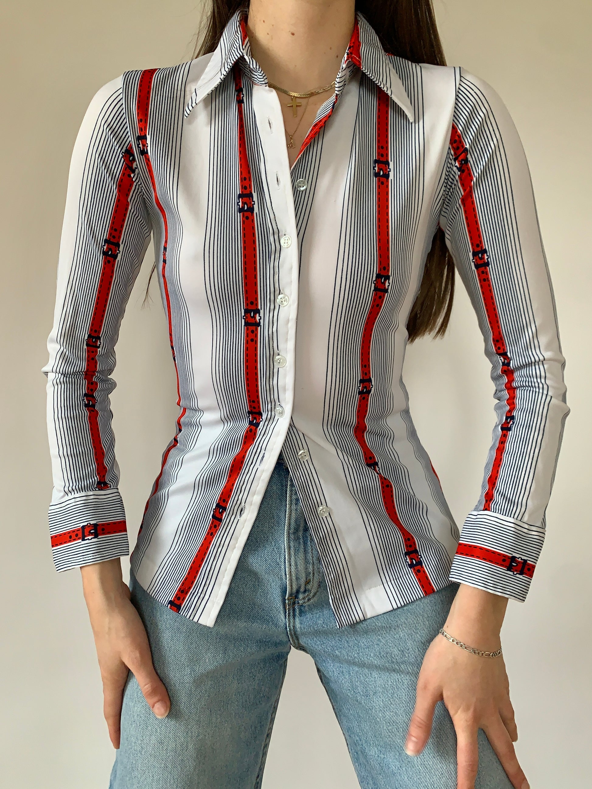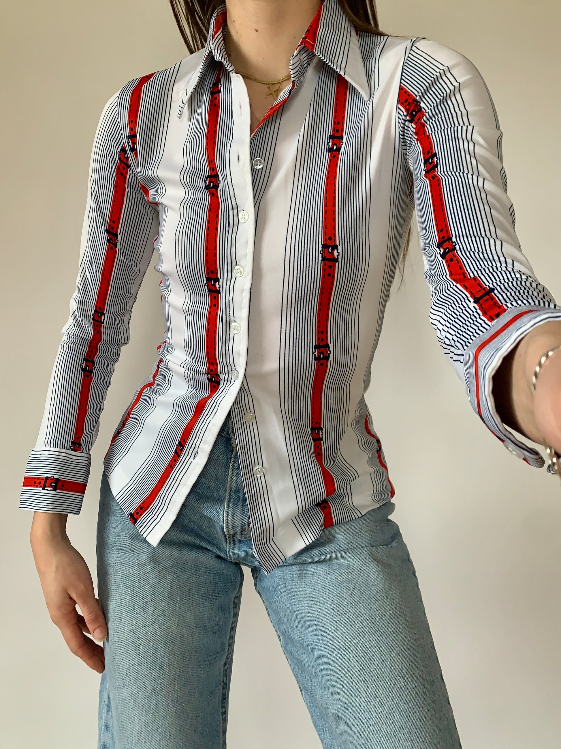 Vintage 1970s Dibs of Portland novelty print blouse. In red, white and blue with a belt buckle print. Material is polyester. Excellent condition. Tagged size M, runs smaller. Shown on size XS.