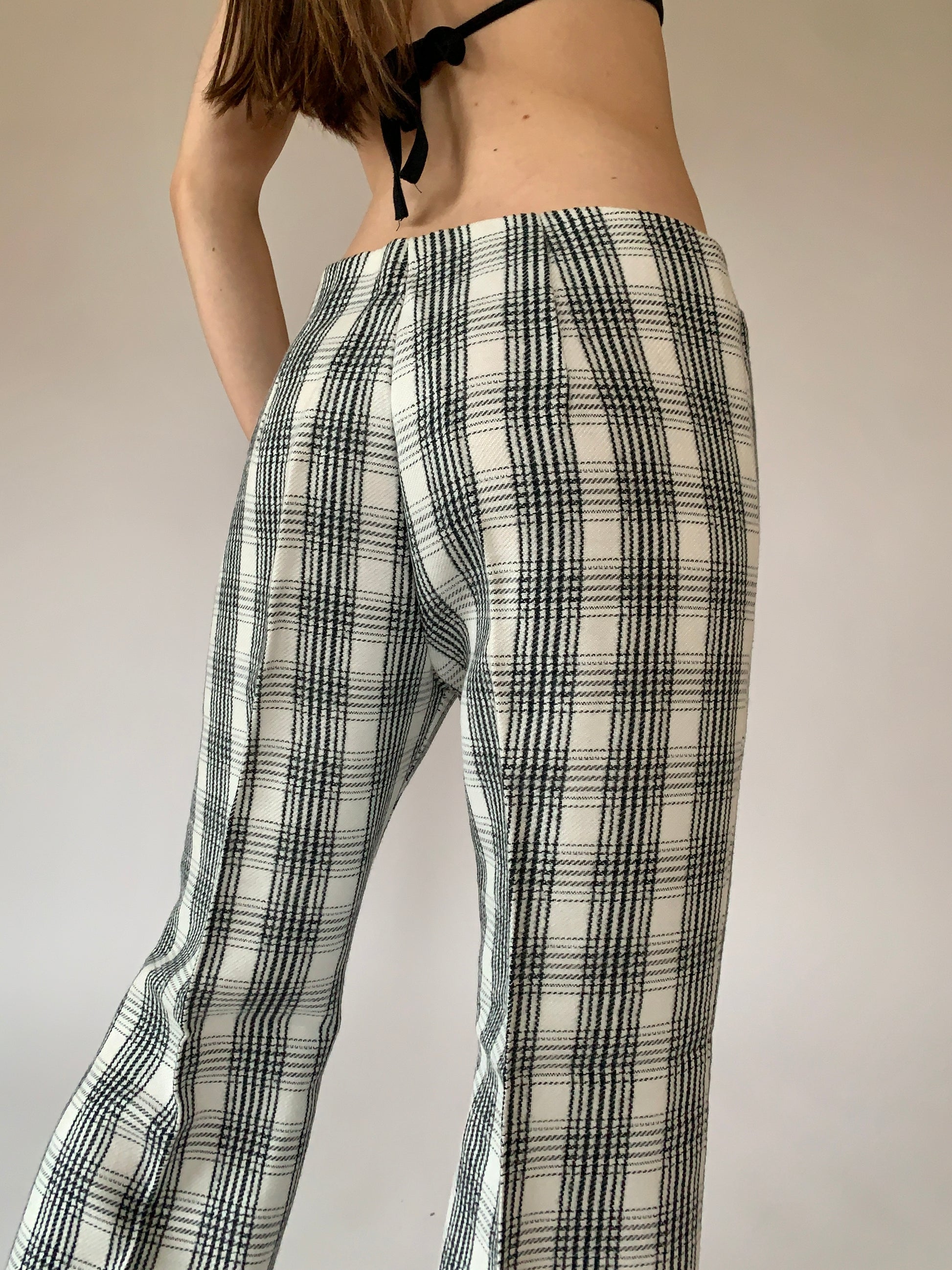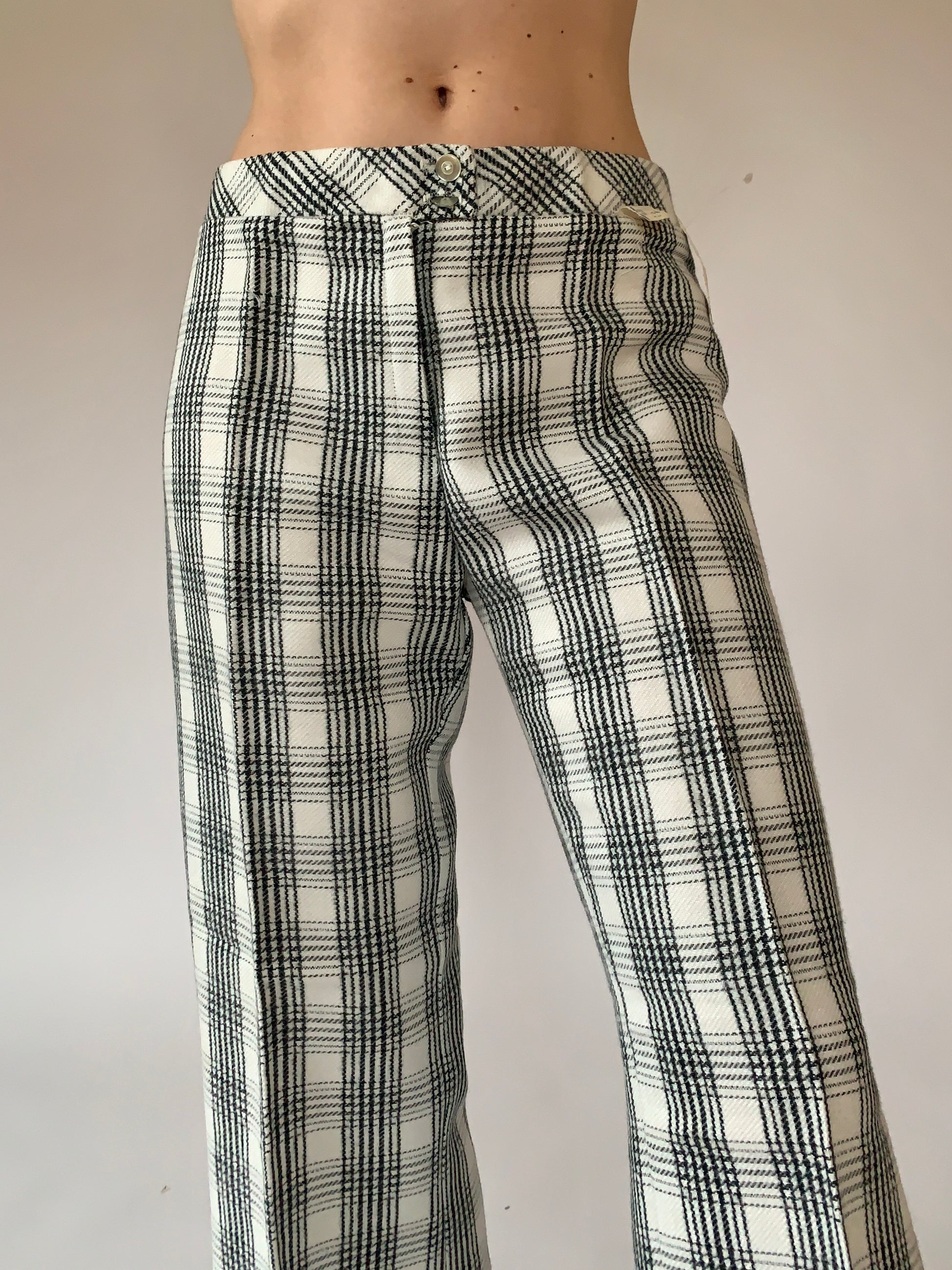 Vintage deadstock 1970s plaid trousers. High waisted with a zip fly and flare. In black and white. Material is a rayon acetate blend. Brand new condition with original tags attached. Tagged size 15-16, best fits 32” waist.