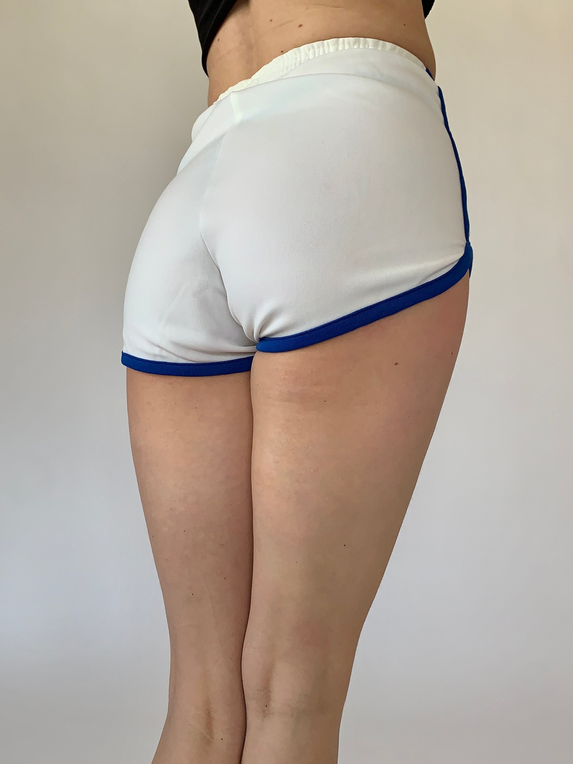 Vintage 1970s track shorts. In white and blue. Material is nylon. In good vintage condition despite minor discoloration. Tagged XS, but best fits XXS frames.