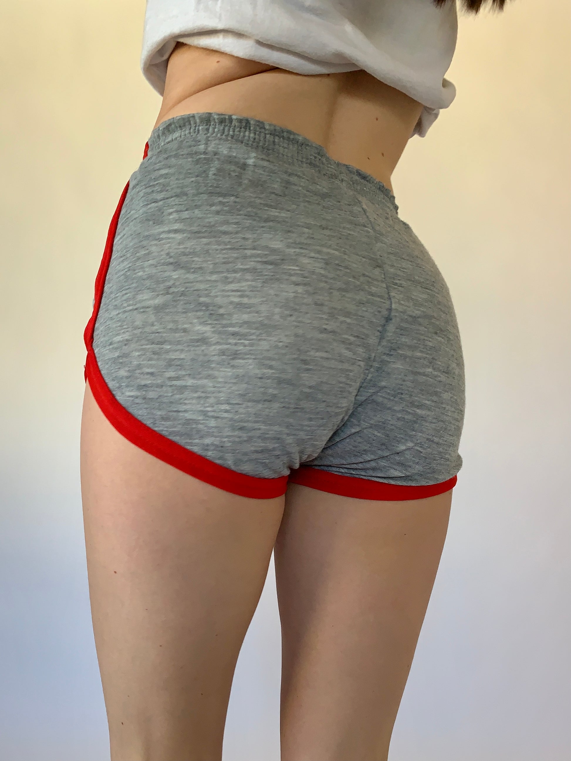 Vintage 1970s track shorts by Dodger Sportswear. In gray and red. Material is Orlon. In excellent vintage condition. Best fits XXS-XS frames.
