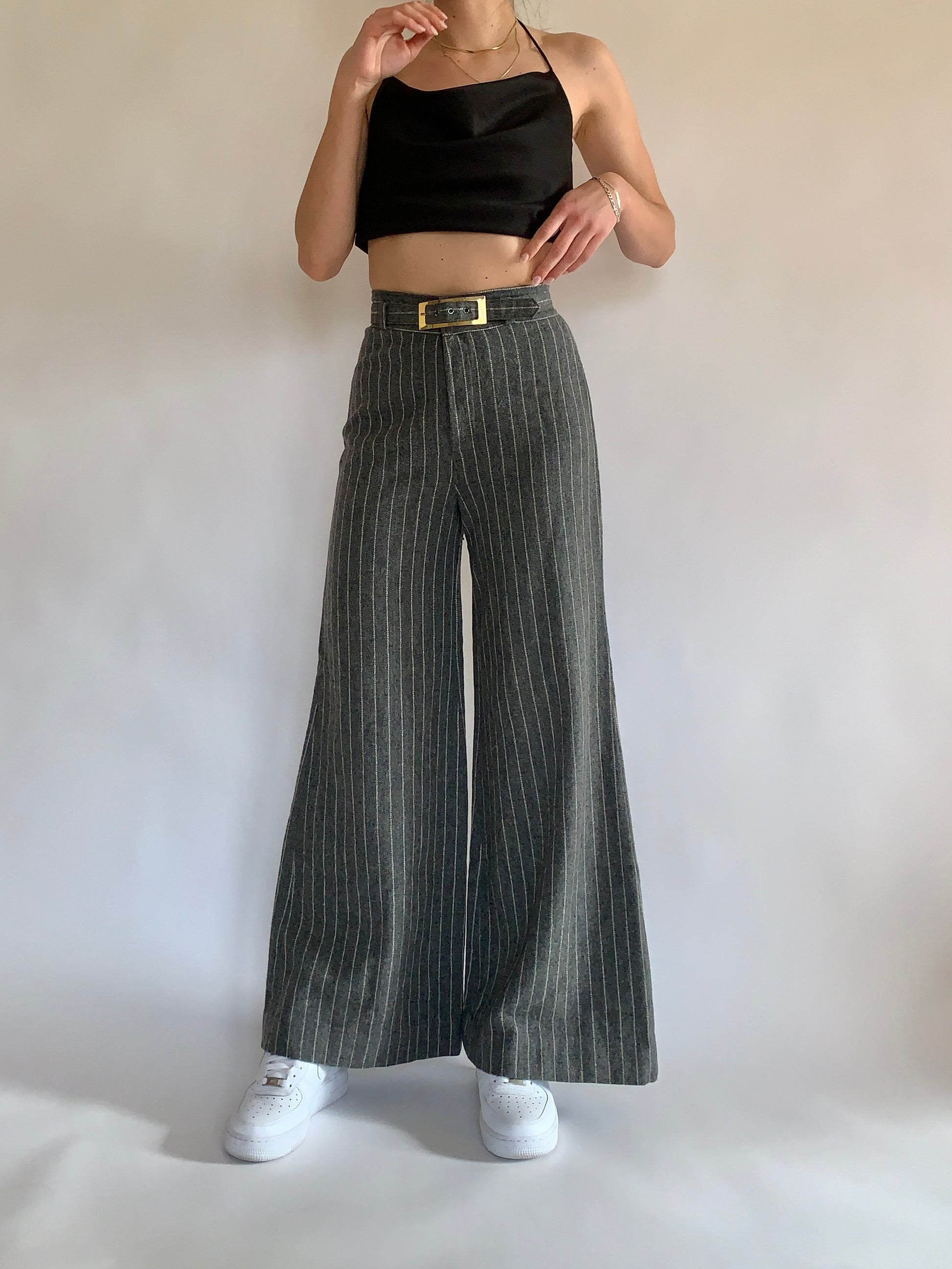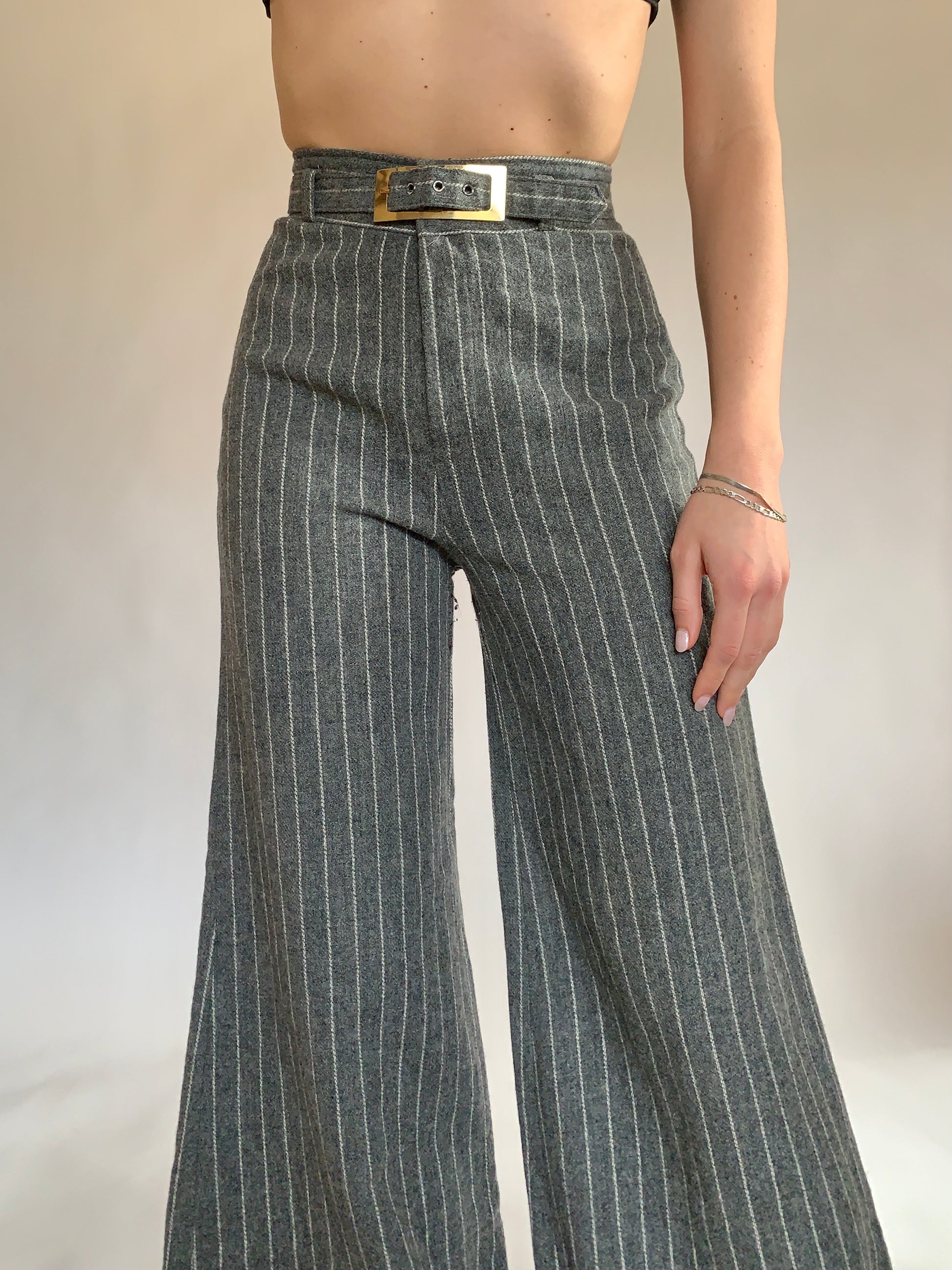 Vintage 1970s wool trousers, made by Shequers. High waisted with a zip fly and mega flare. In gray with white pin stripes. In excellent vintage condition. Belt is removable. Tagged 9/10, but best fits 23-24” waist.