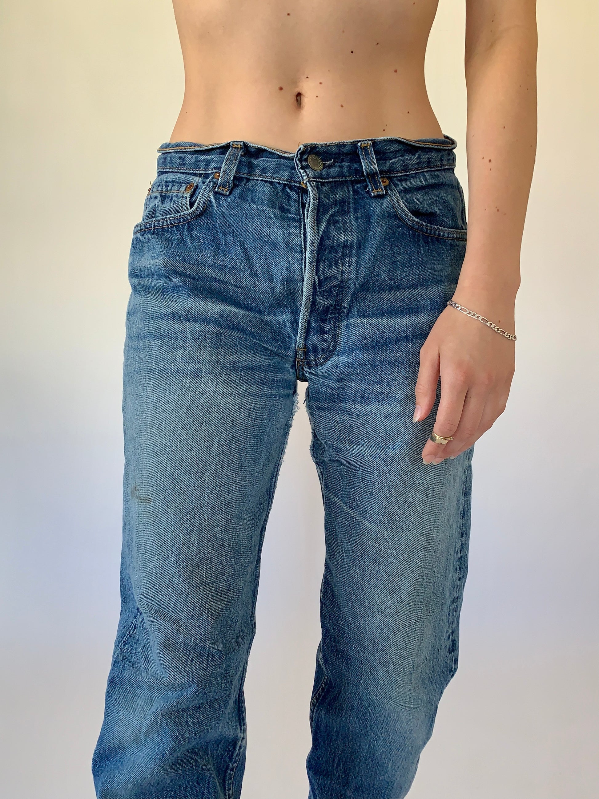 Vintage 1980s Levi’s 501 jeans. High waisted with a five button fly and straight leg. In a dark blue wash. 100% cotton denim. Made in USA. In good vintage condition with visible wear including fading, discoloration and fraying. Tagged W30 L32, best fits 28-29” waist.