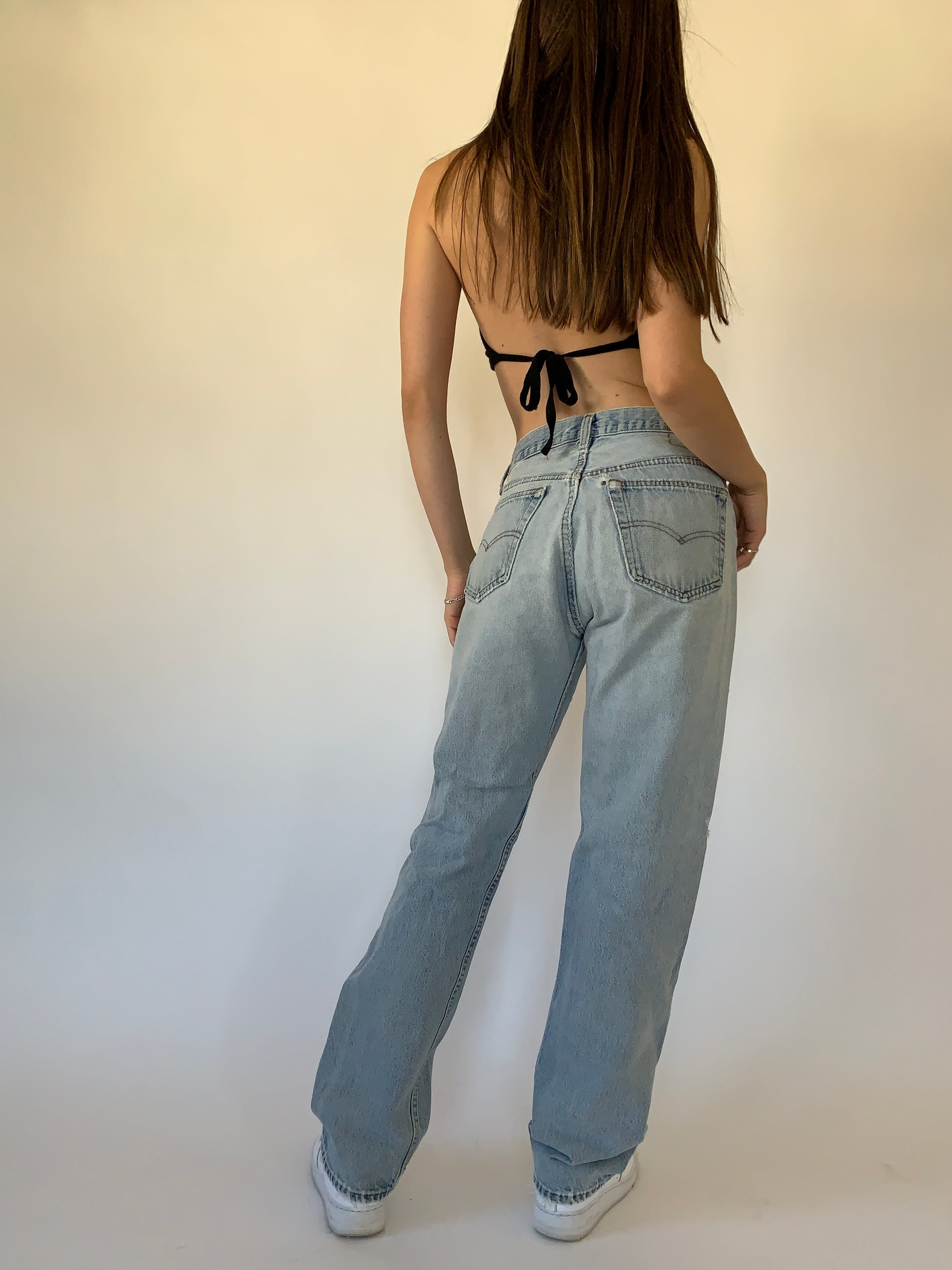 Vintage 1980s Levi’s 501 jeans. High waisted with a five button fly and straight leg. In a light wash. 100% cotton denim. Made in USA. In distressed vintage condition with holes and patchwork including right below the fly. Tagged W33 L36, best fits 30-31” waist.