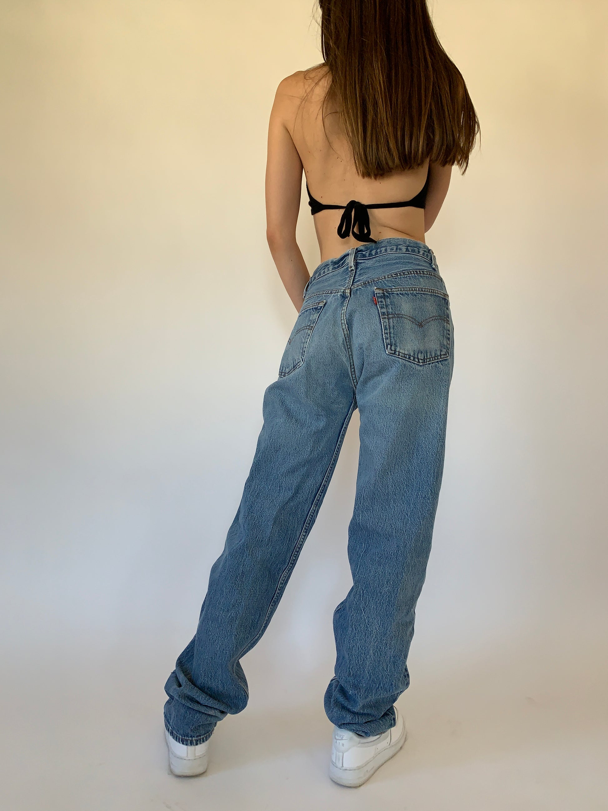 Vintage 1980s Levi’s 501 jeans. High waisted with a five button fly and straight leg. In a medium wash. In excellent vintage condition with some fading due to age. Tagged W33 L36, best fits 31-32” waist.