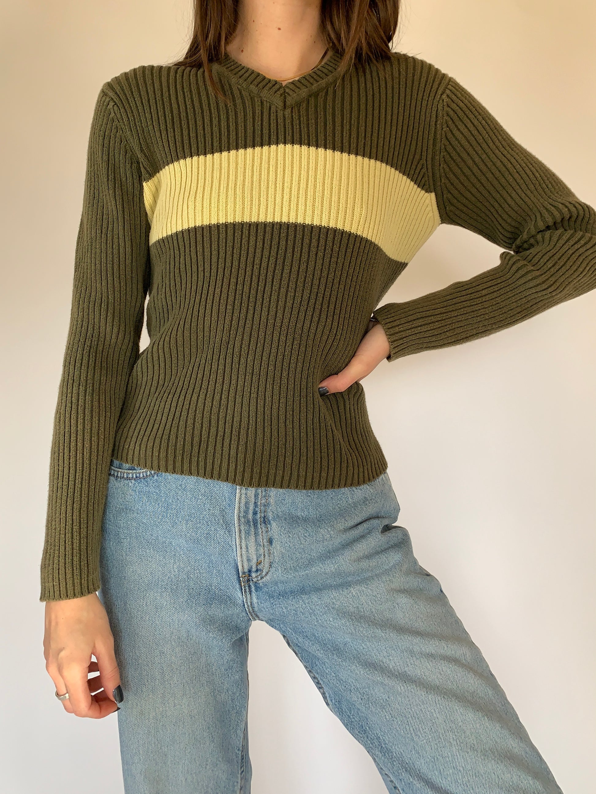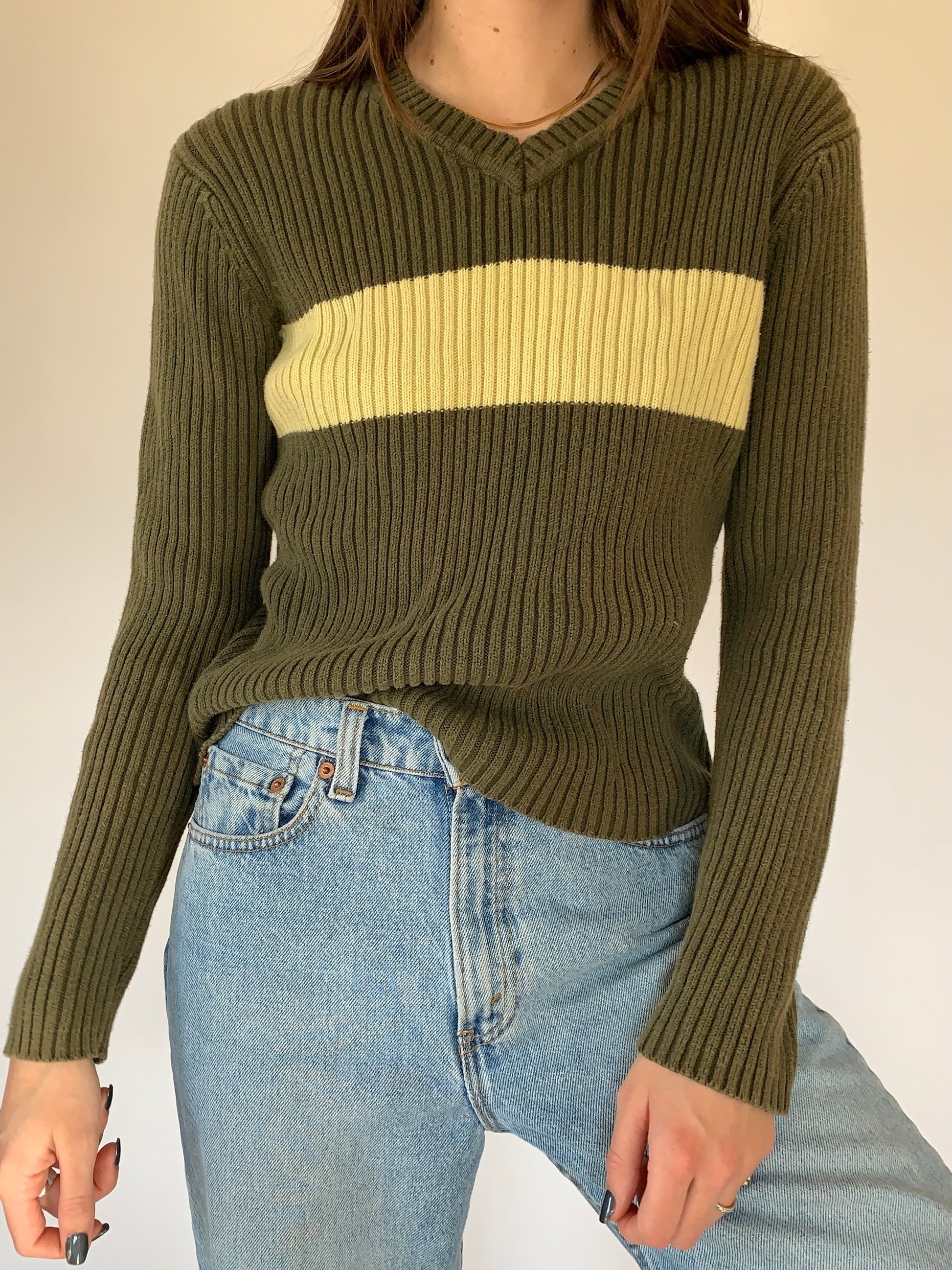 Vintage 1990s American Eagle sweater. V neck long-sleeve with olive green and yellow color block. 100% cotton with stretch. In good vintage condition. Tagged size M, shown on size XS.