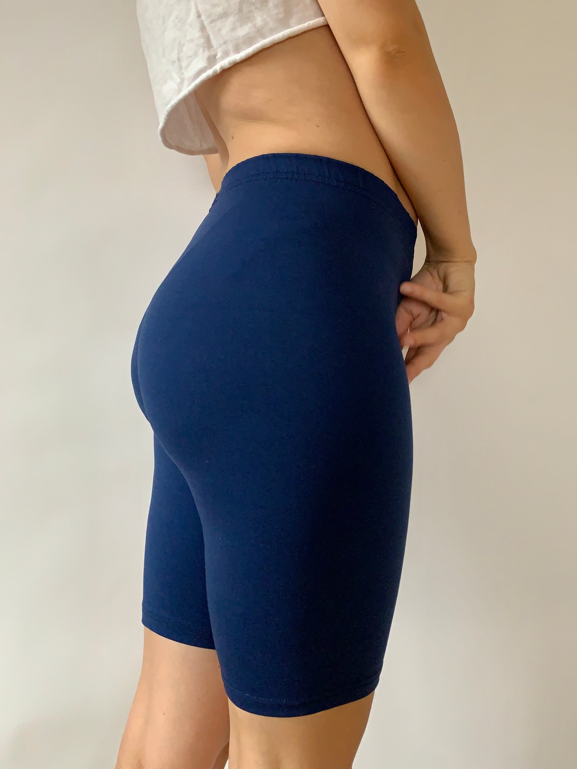 Vintage 1990s biker shorts by WilliWear Athletic. In navy blue. Material is a nylon/lycra/spandex blend. Made in USA. Good condition. Recommended for size XS-S. Shown on size S.