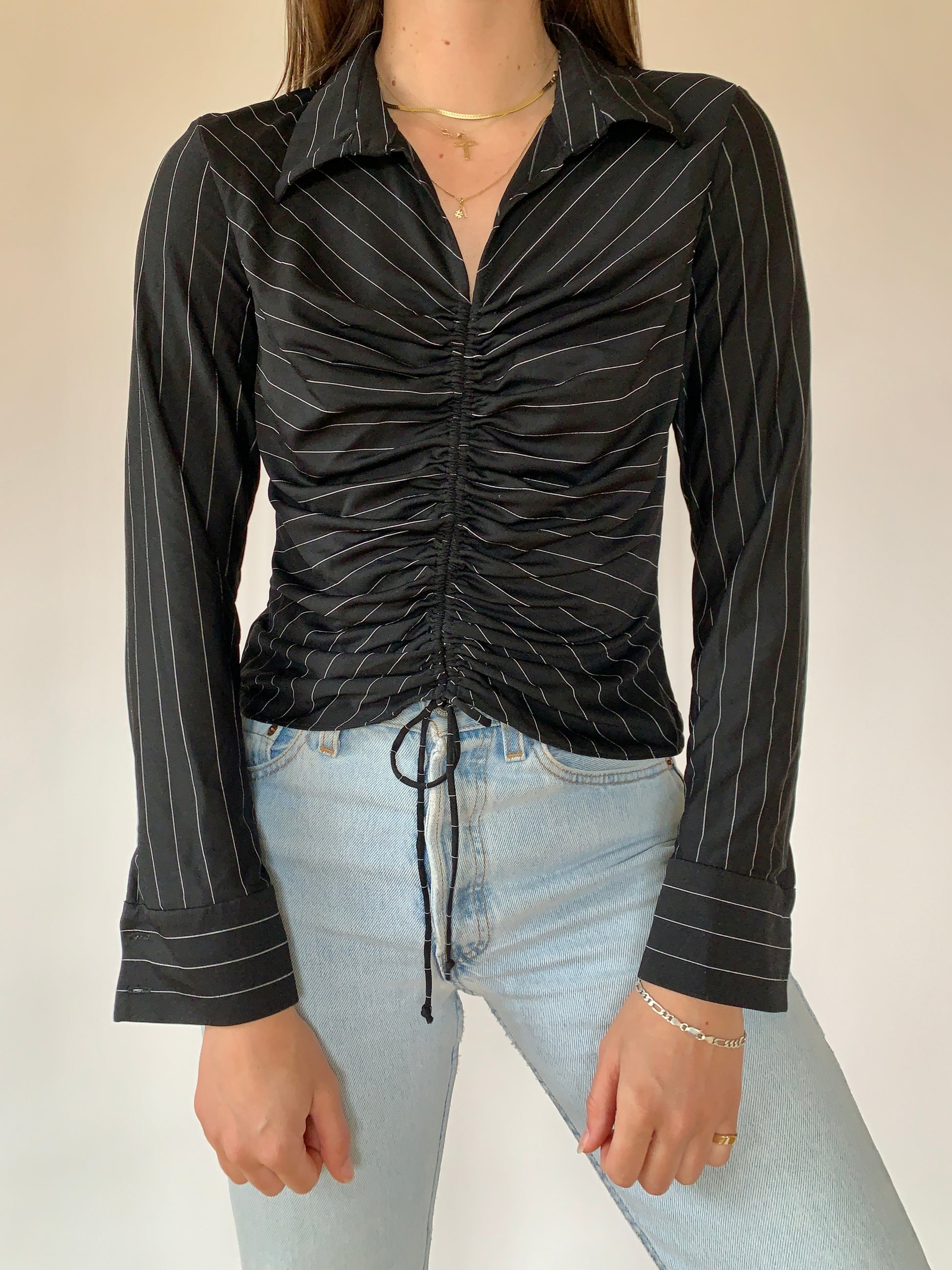 Vintage 1990s ruched pinstripe blouse, made by Ice. Material is a nylon rayon spandex blend. Excellent condition. Tagged size medium. Shown on size XS.