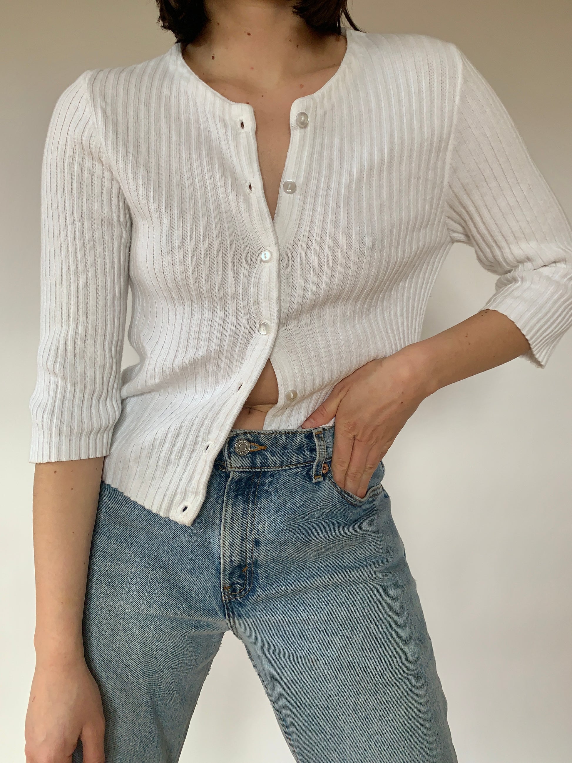 Vintage 1990s ribbed cardigan in white. Made by Takeout. Material is 100% cotton. Made in USA. Excellent condition. Tagged size medium. Has stretch.