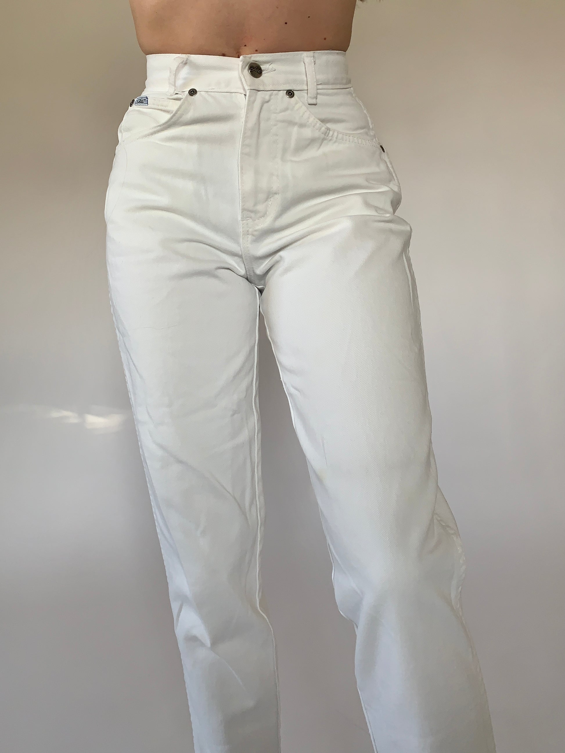 Vintage 1990s Chic jeans. High waisted with a zip fly and tapered leg. In white. Made in USA. In good condition with small discoloration spots on leg - see pics. Tagged size 3, best fits 23-24” waist.