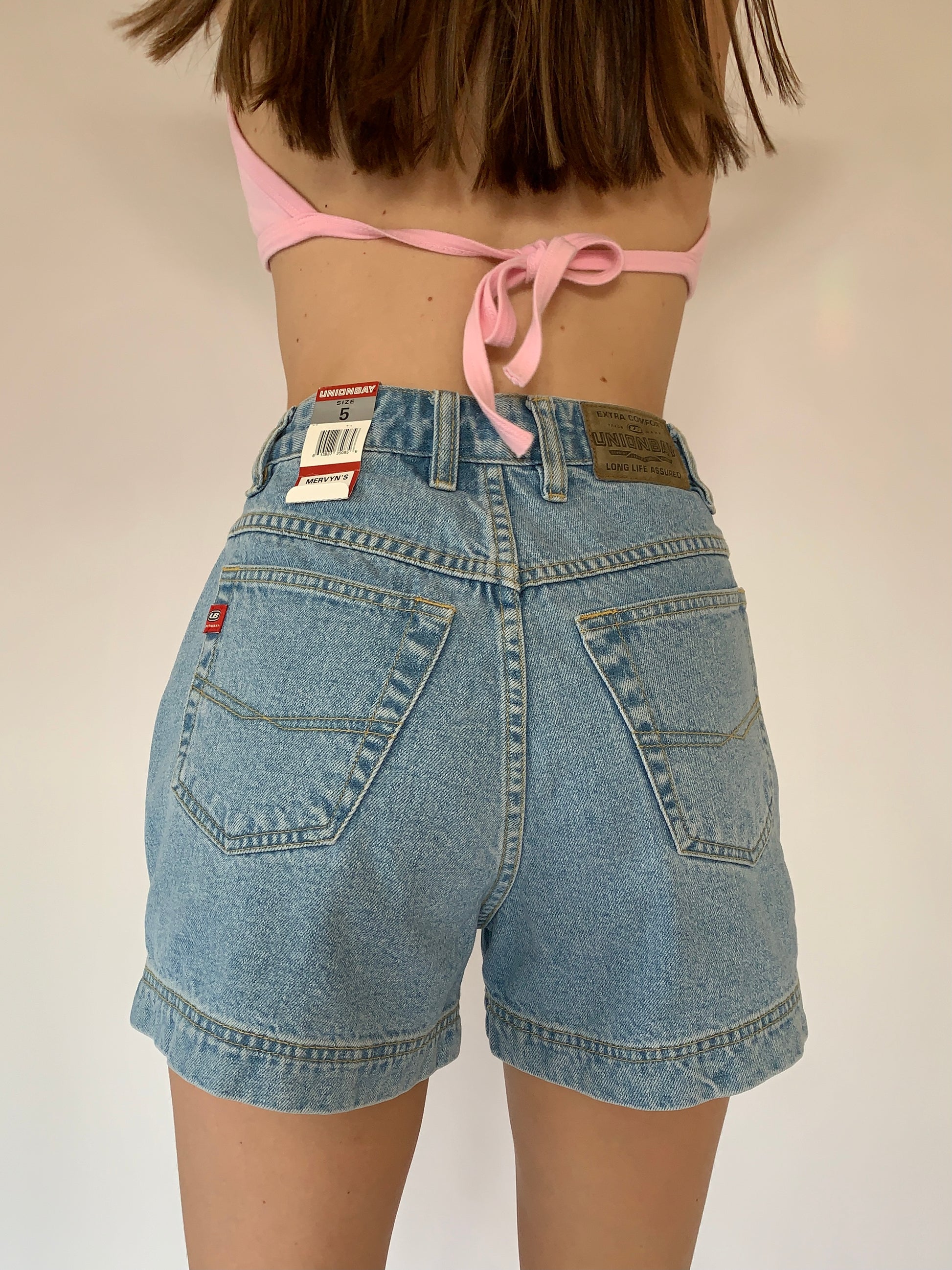 Vintage 1990s Deadstock Union Bay denim shorts. High waisted with a zip and double button fly. In a light wash. 100% cotton denim. In like new, deadstock condition with original tags attached. Tagged size 5, best fits 24-25” waist.