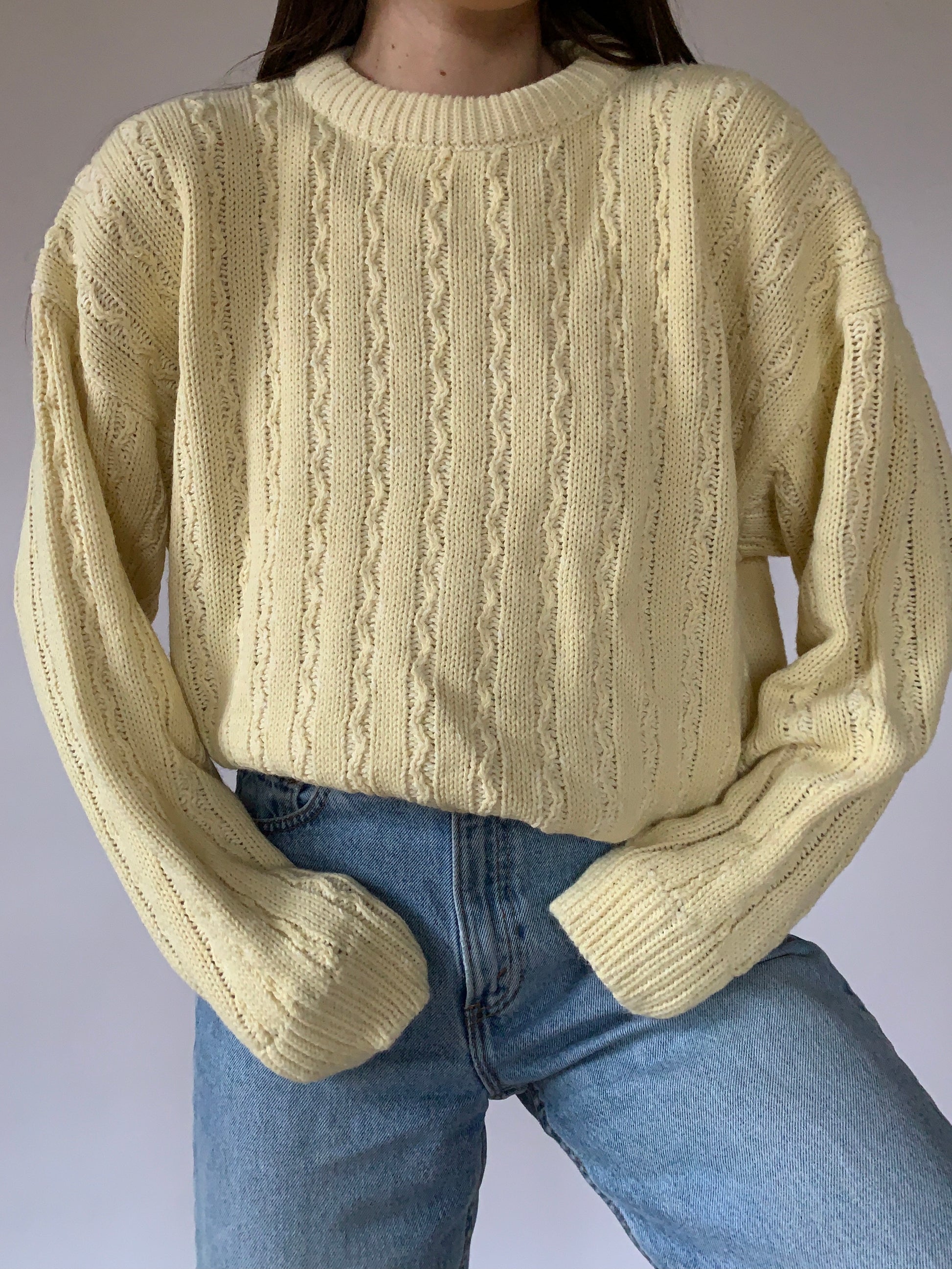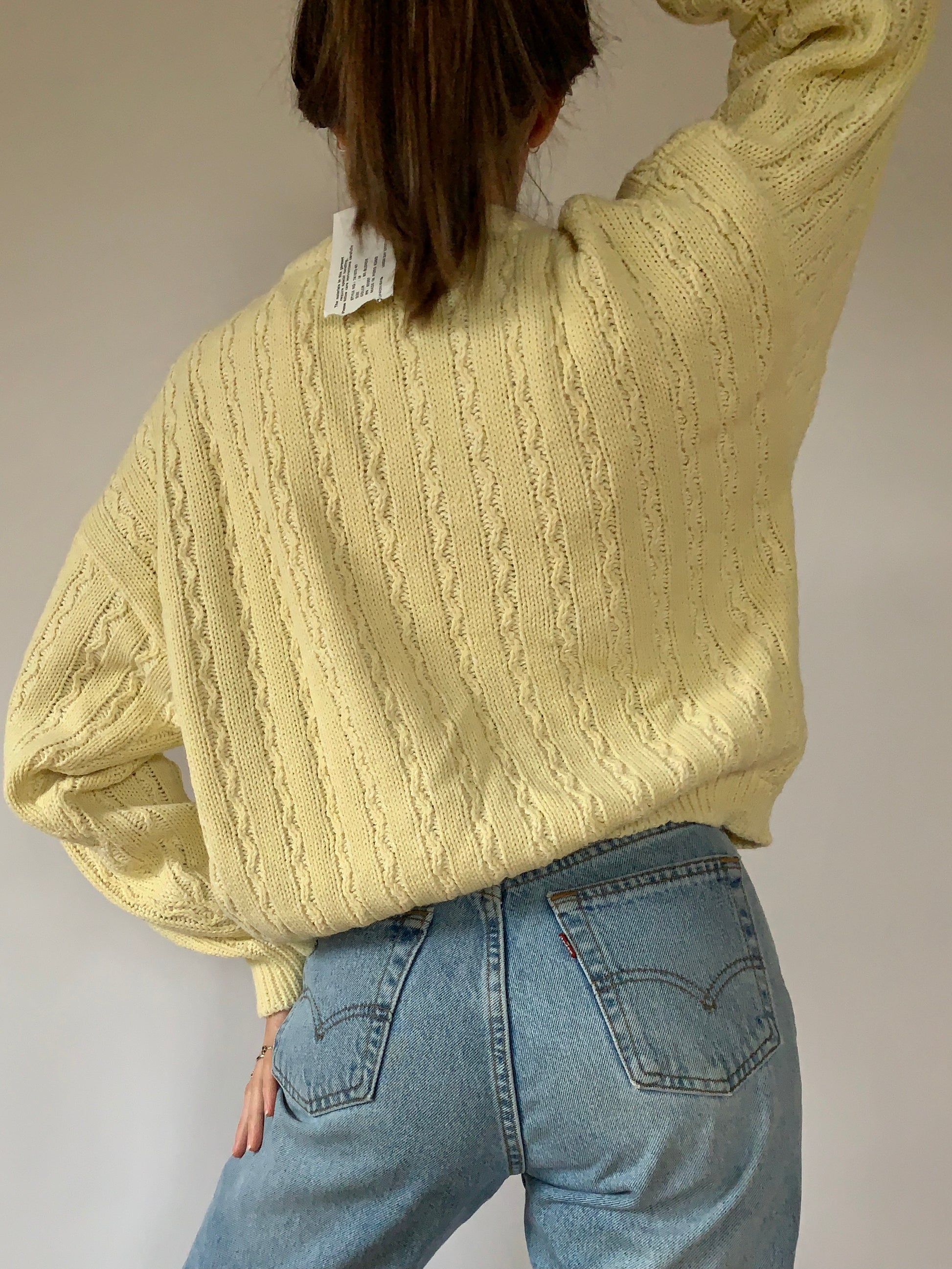 Vintage 1990s Deadstock Unionbay sweater. In a buttery yellow color. Material is acrylic. In brand new condition with original tag attached. Tagged size M, shown on size XS.