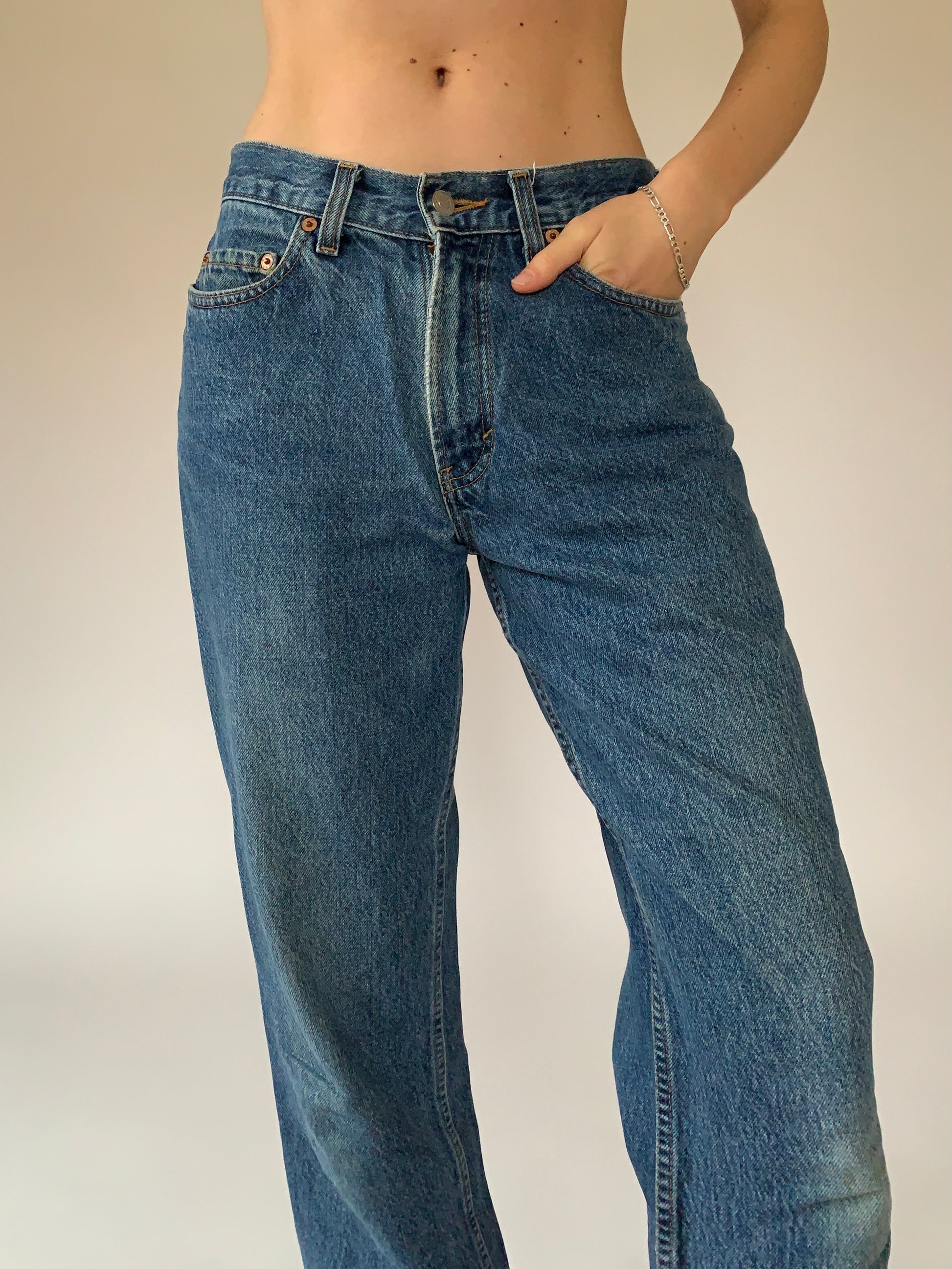 Vintage 1990s Gap jeans. High waisted with a relaxed fit. In a medium blue wash. 100% cotton denim. Made in USA. In good condition. Tagged W28 L30, best fits 28” waist.