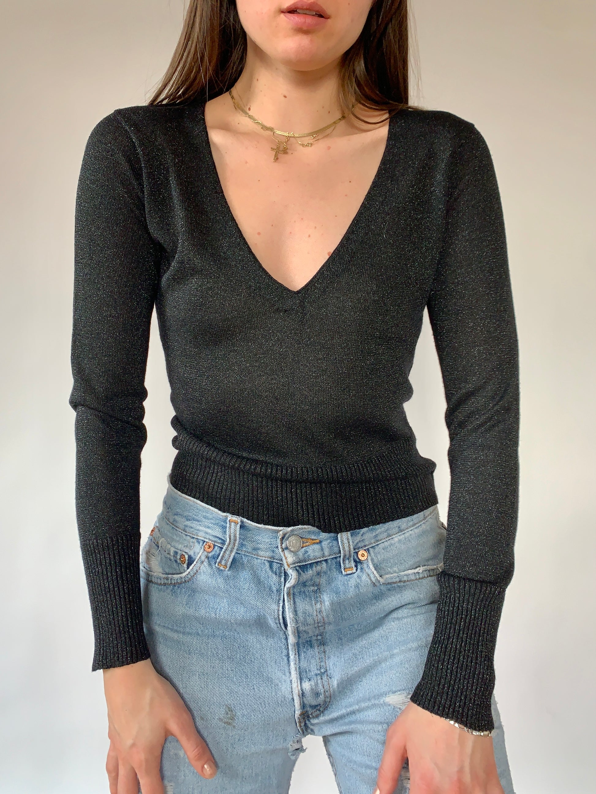 Vintage 1990s black glitter sweater, made by Jacqueline De Young. Material is a viscose & lurex blend. Excellent condition. Tagged size S. Shown on size XS.