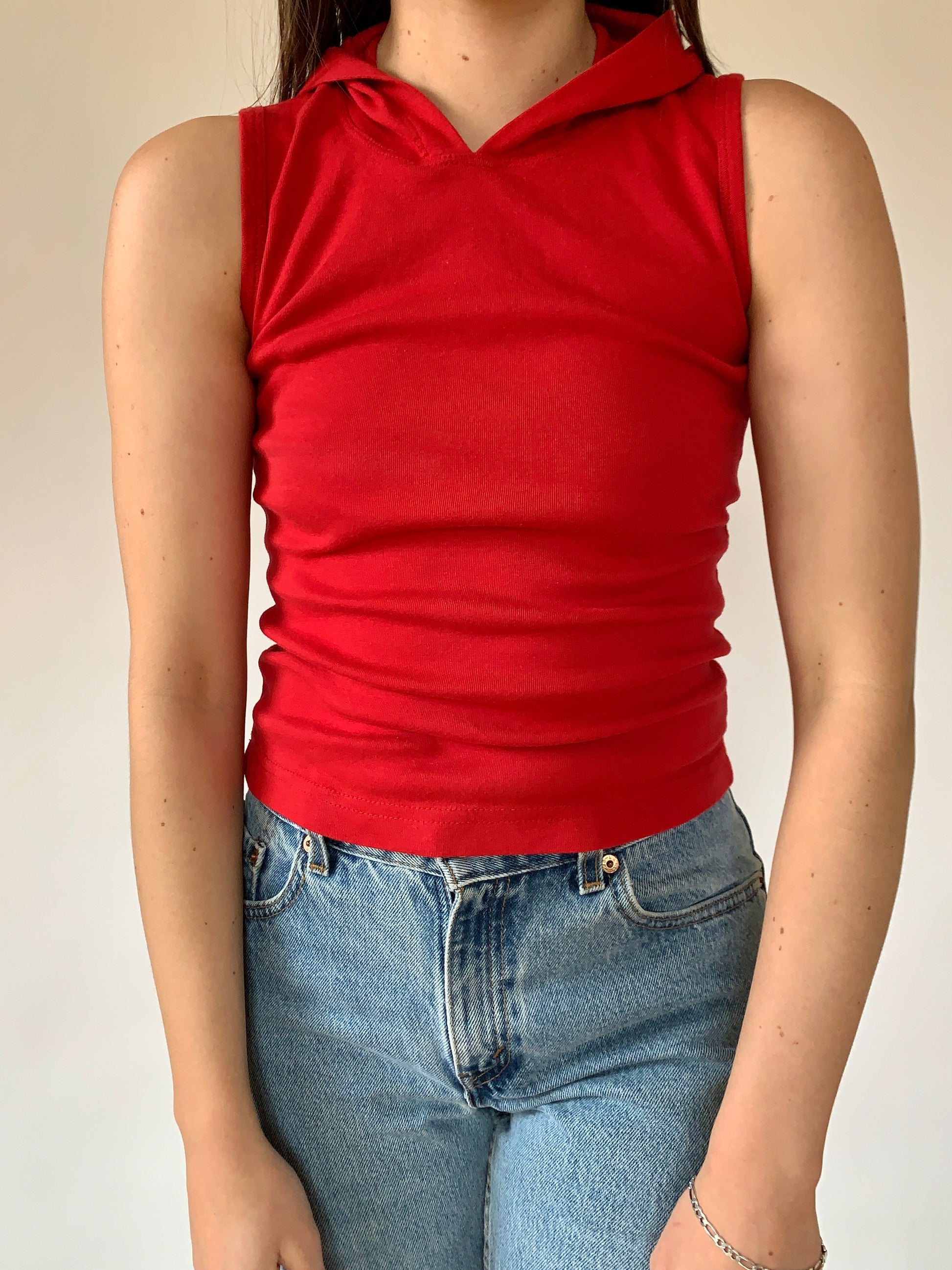 Vintage 1990s red hooded tank, made by Classic Girl American Apparel. 100% cotton. Made in USA. Excellent condition. Tagged one size, but fits like a small. Shown on size XS.