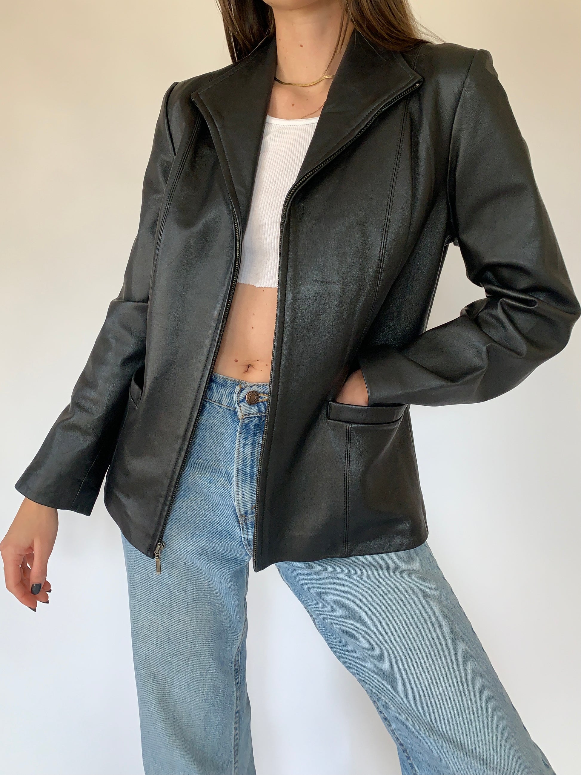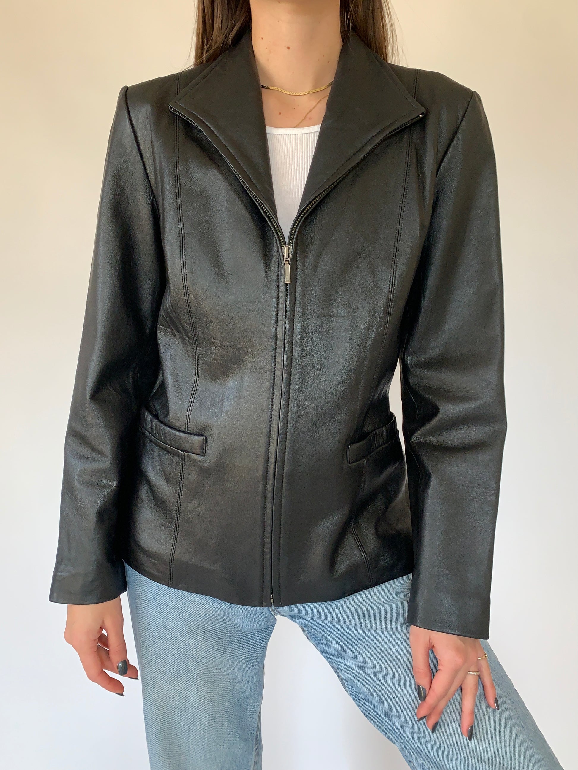 Vintage 1990s genuine leather jacket, made by JLC New York. Full zip closure. Black, 100% leather with a polyester lining. In excellent condition. Tagged size S, shown on size XS.