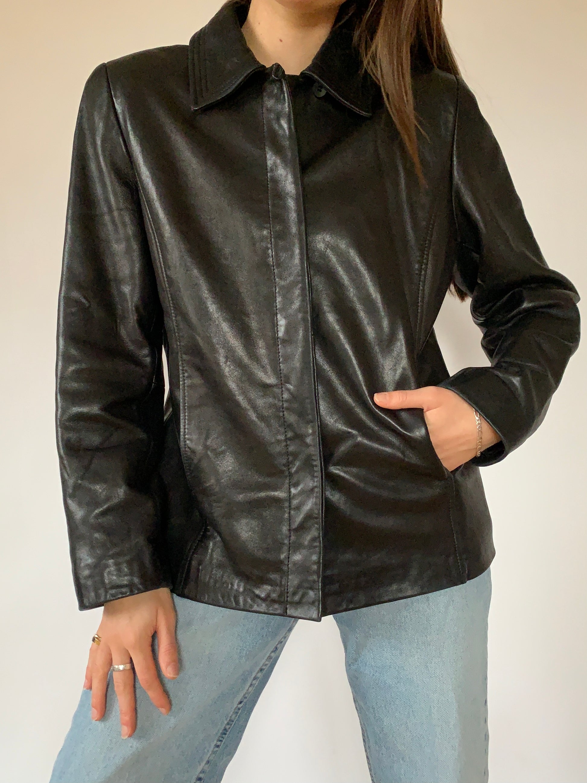 Vintage 1990s genuine leather jacket, made by Anne Taylor. In black, butter soft 100% leather with an acetate lining. In excellent condition. Tagged size M, shown on size XS.