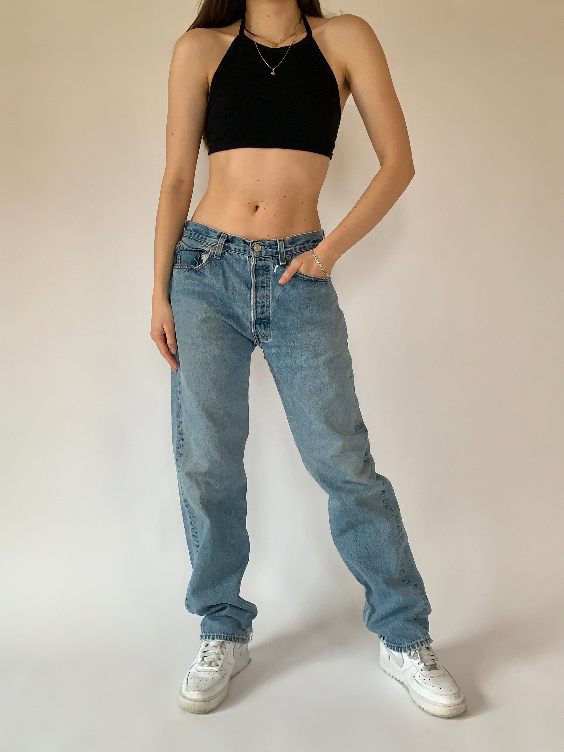Vintage 1990s Levi’s 501s “For Women.” High waisted with a five button fly and straight leg. In a medium wash. 100% cotton denim. Made in USA. In distressed condition with a few small holes and fraying. Tagged W32 L32, but best fits 29-30” waist.