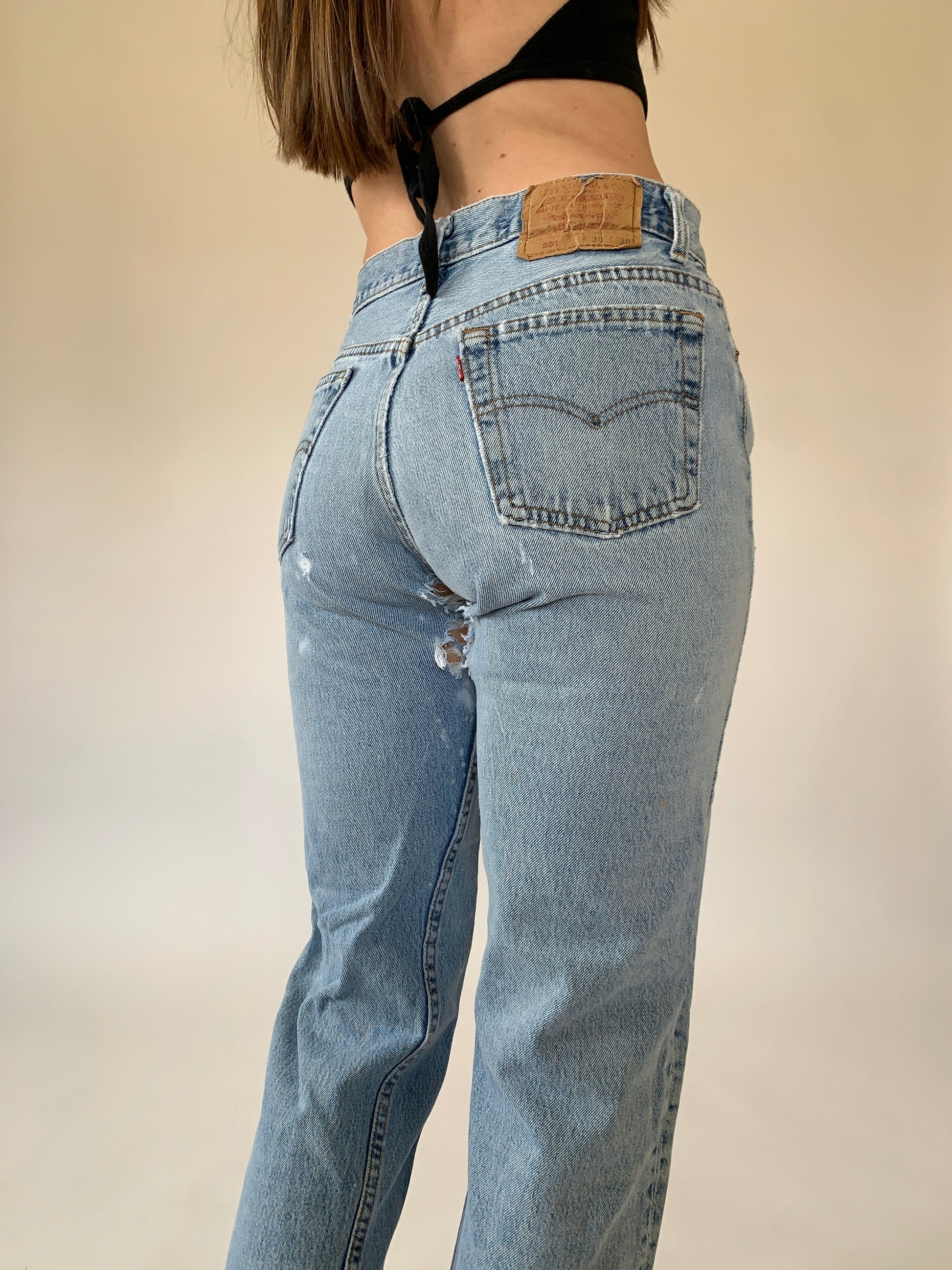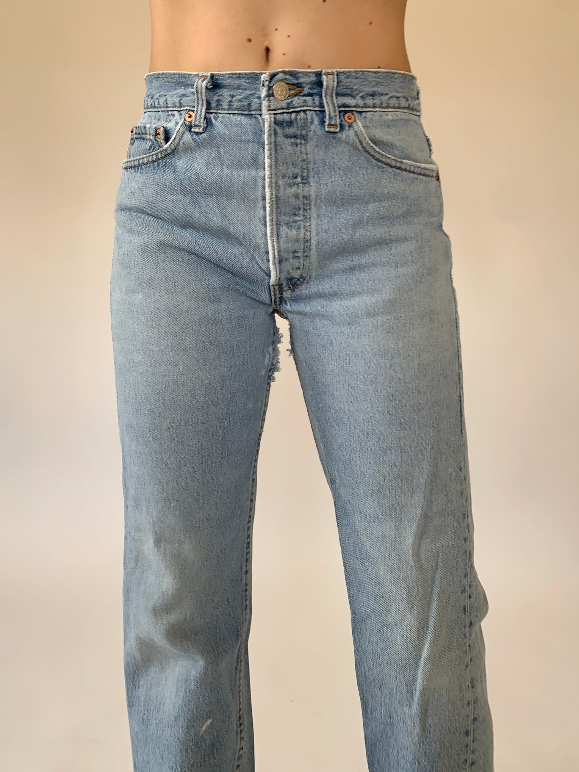 Vintage 1990s Levi’s 501 jeans. Mid rise with a five button fly and straight leg. In a light wash. 100% cotton denim. Made in USA. Selling as-is in distressed condition - holes in the rear could use patching if desired. Tagged W30 L30, best fits 27” waist.