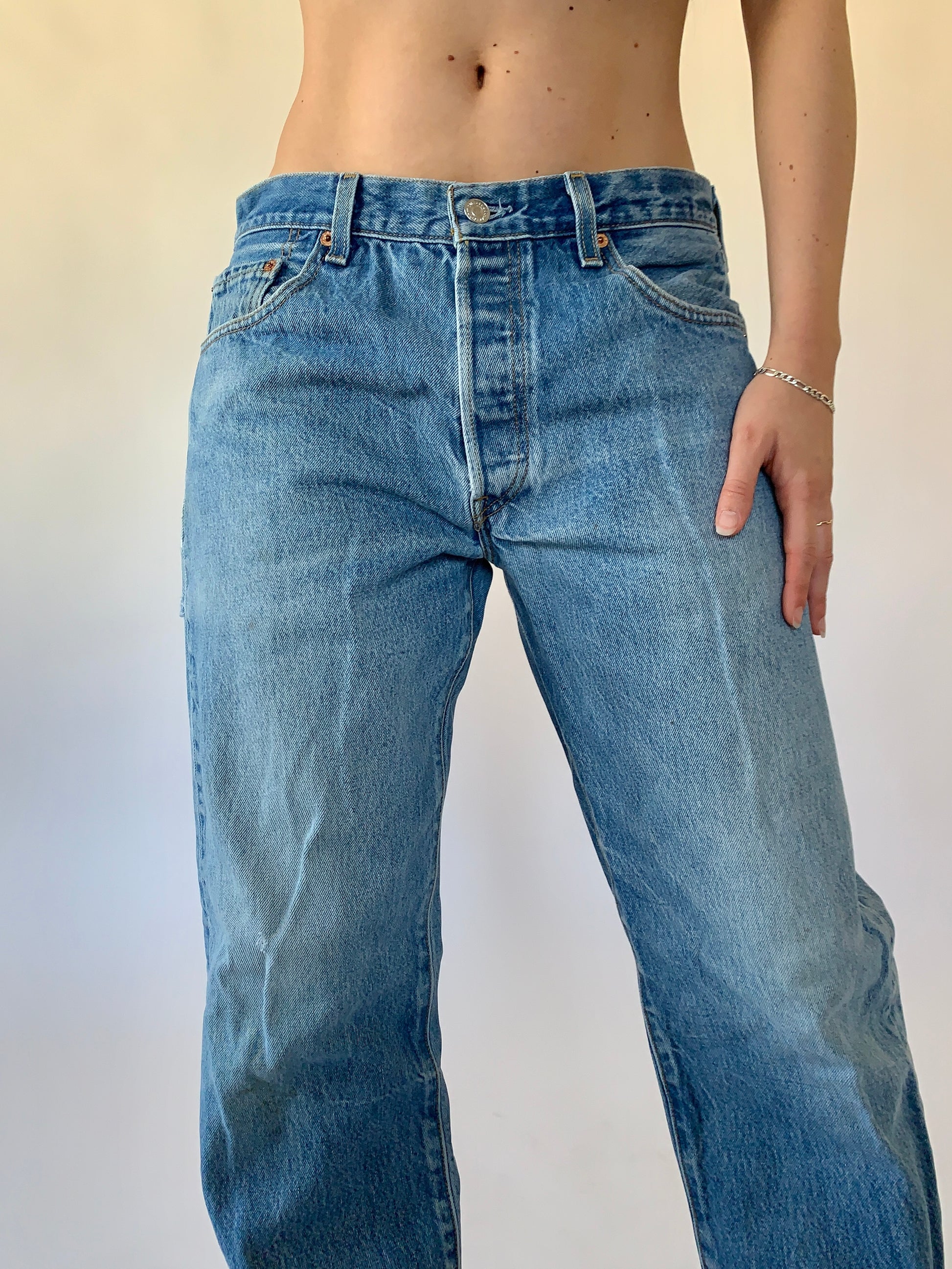 Vintage 1990s Levi’s 501s. High rise with a five button fly and straight leg. In a medium wash. 100% cotton denim. Good condition with fading and discoloration. Tagged W35 L36, best fits 32” waist or below if a baggy fit is desired.