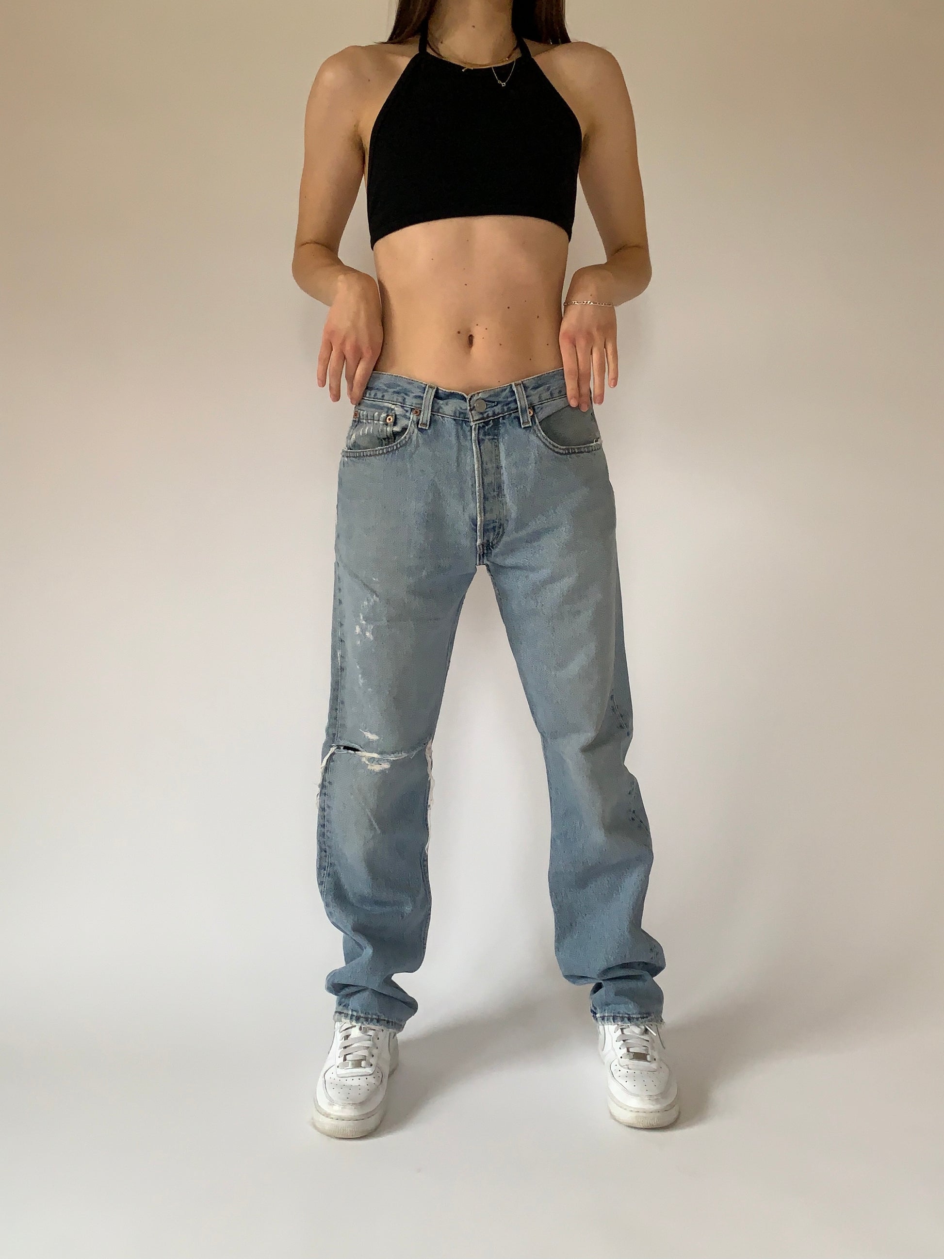 Vintage 1990s Levi’s 501 “For Women” jeans. High waisted with a five button fly and straight leg. In a light wash. 100% cotton denim. Made in USA. In distressed condition with holes and minimal discoloration. Tagged W31 L32, best fits 30-31” waist.