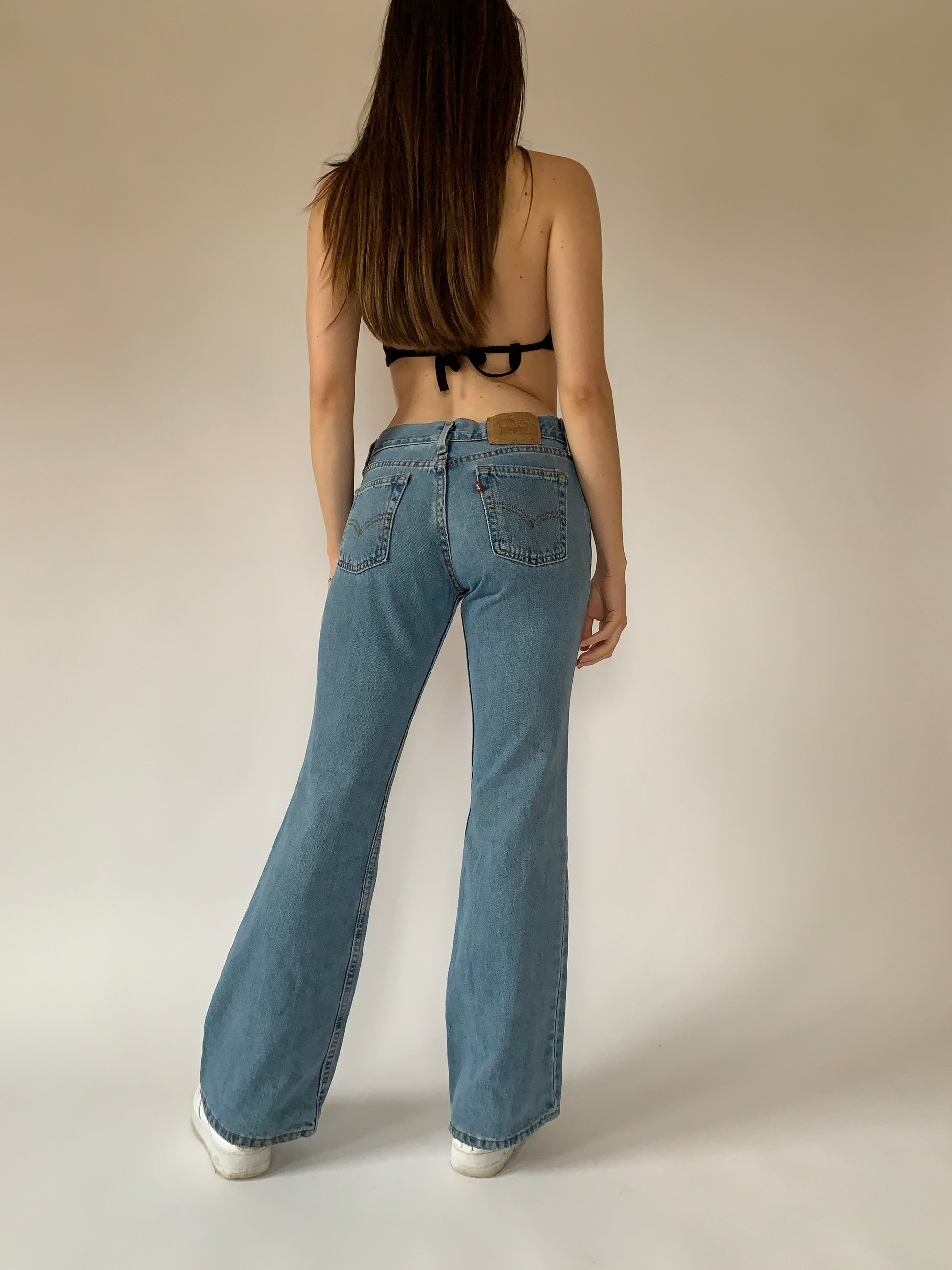 Vintage 1990s Levi’s 514 jeans. Low rise with flare. In a classic light wash. 100% cotton denim. Made in USA. In excellent condition despite minor discoloration at the hems. Tagged size 5 Jr., best fits 28” waist at low rise.