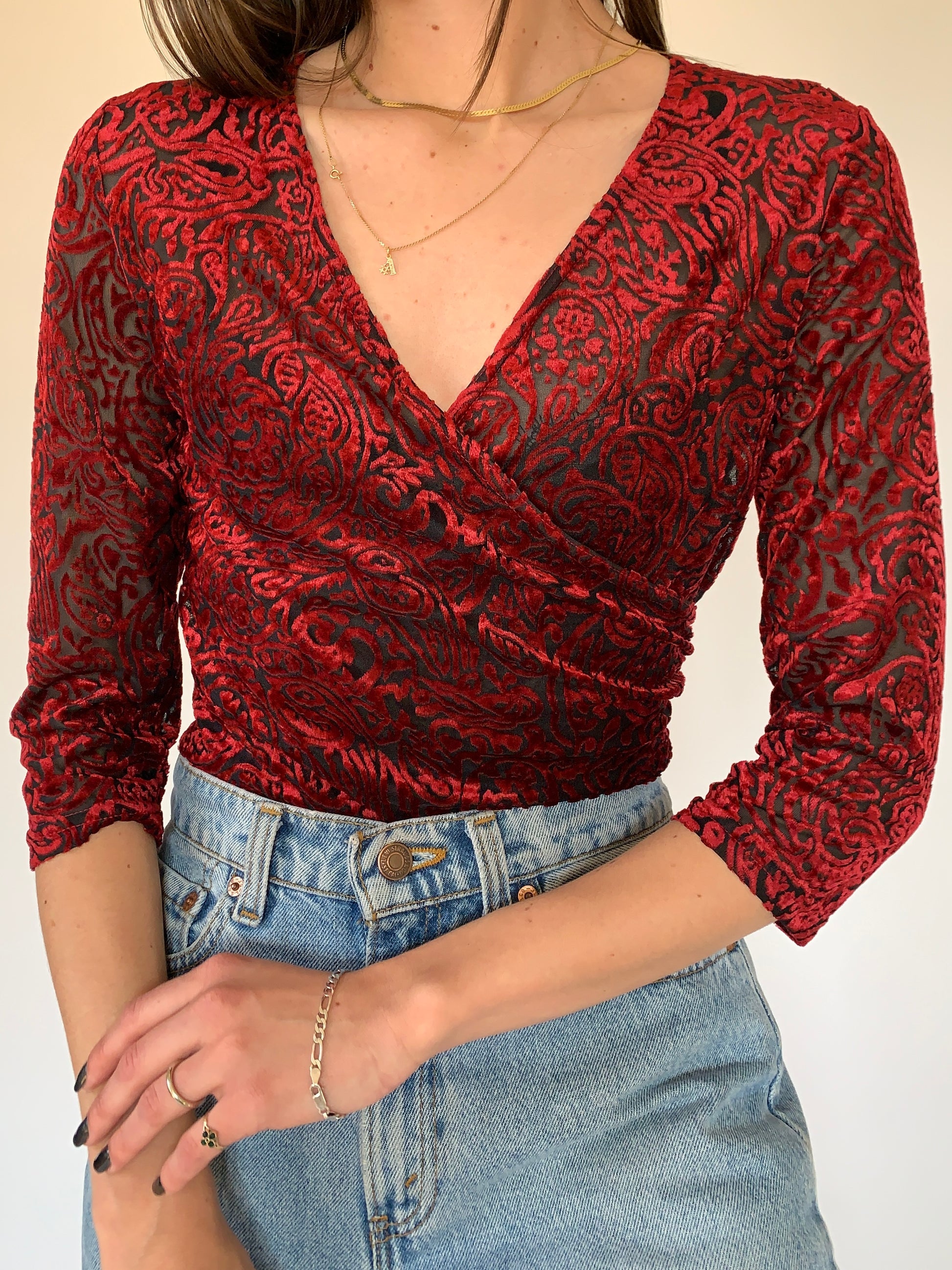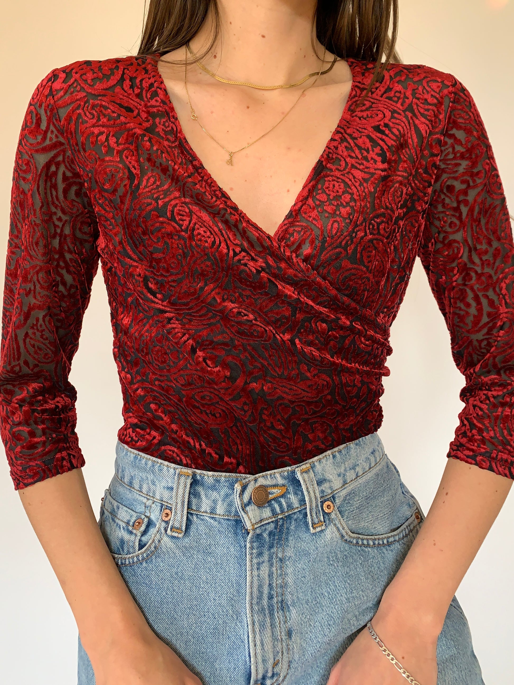Vintage 1990s A. Byer velvet mesh top. Three quarters sleeved with a v neck shape. In a sheer black mesh with red velvet paisley overlay. Material is a rayon poly blend with stretch. Made in USA. In excellent vintage condition. Tagged size M, but fits more like S. Shown on size XS.