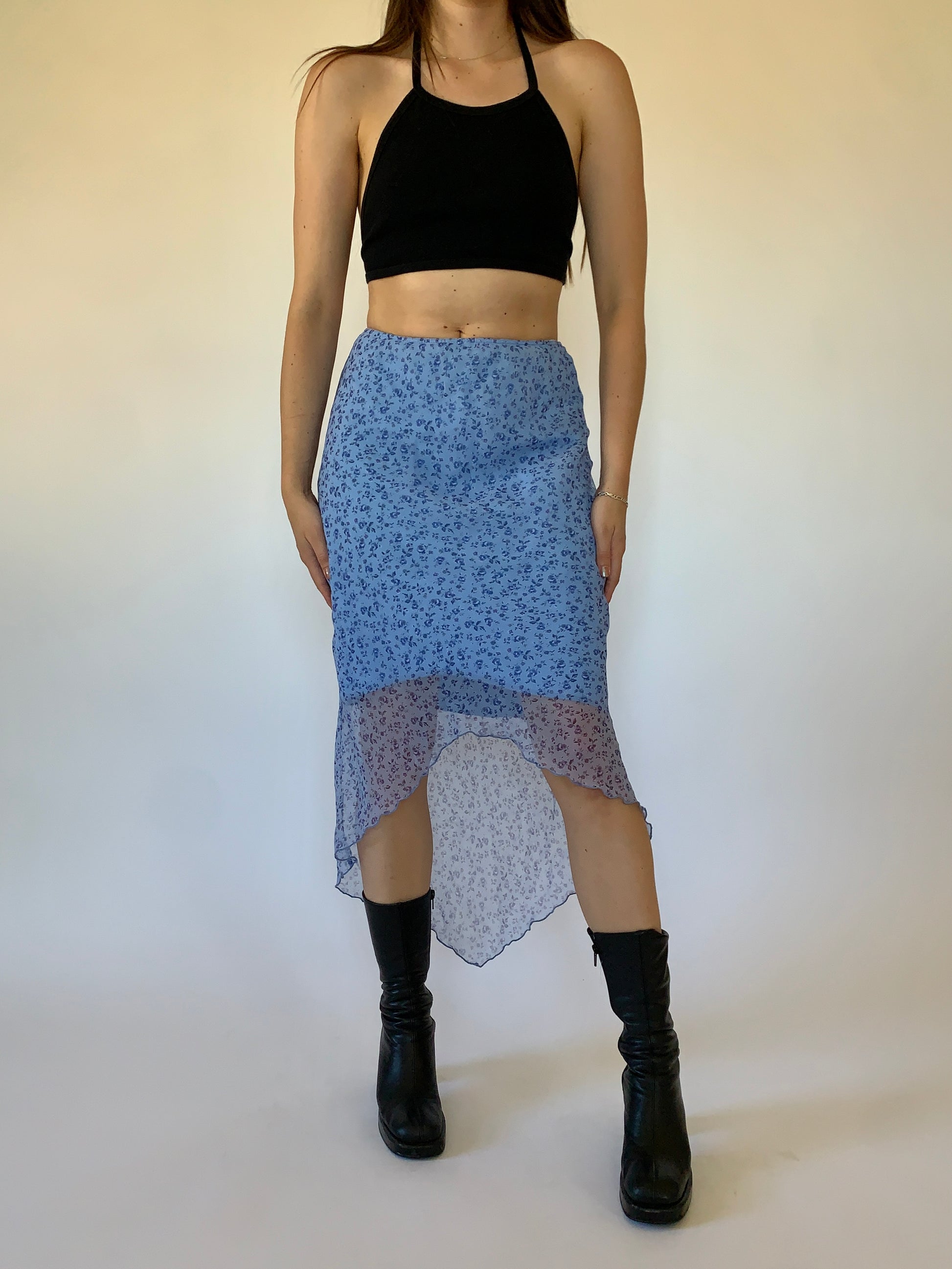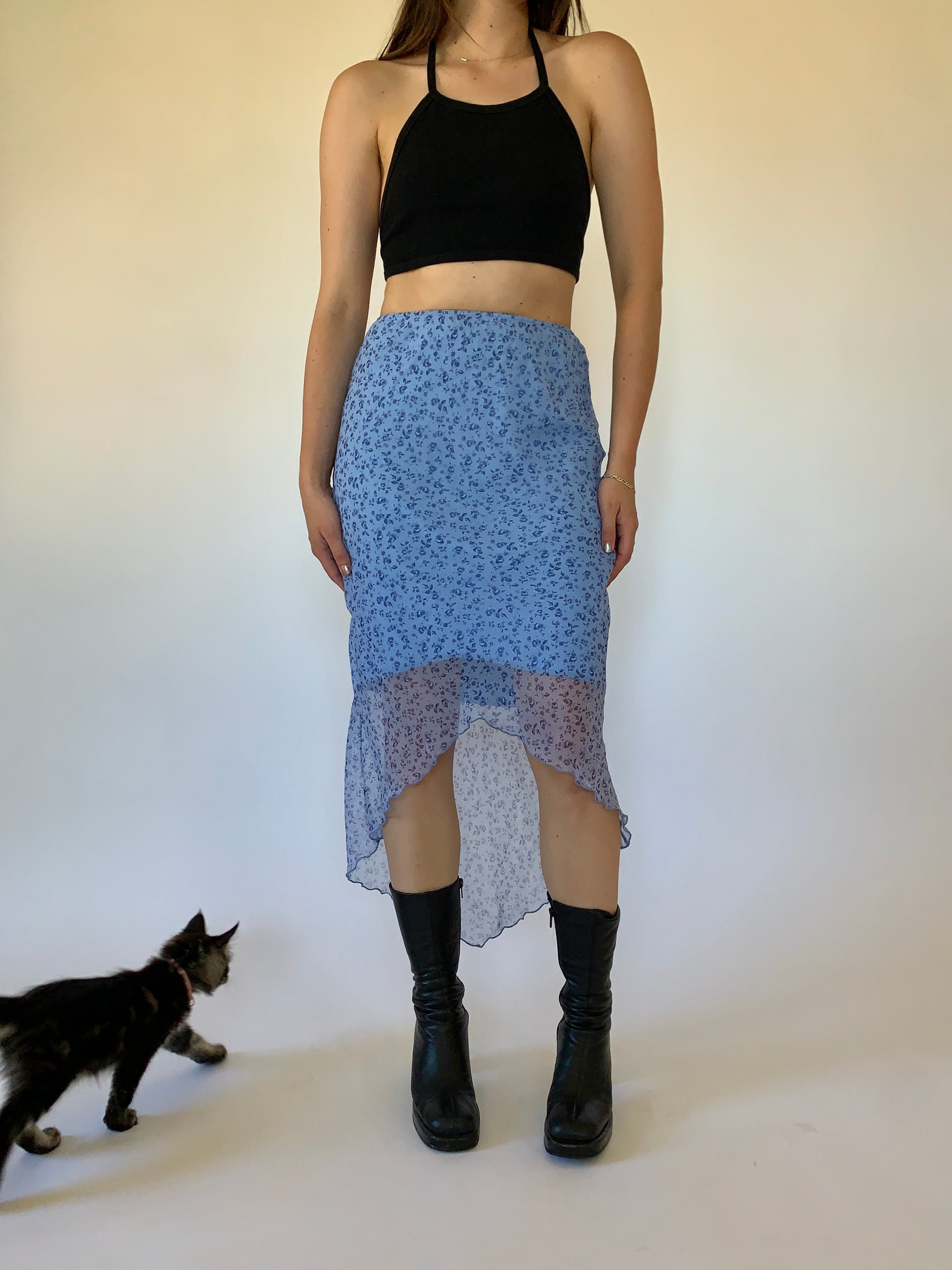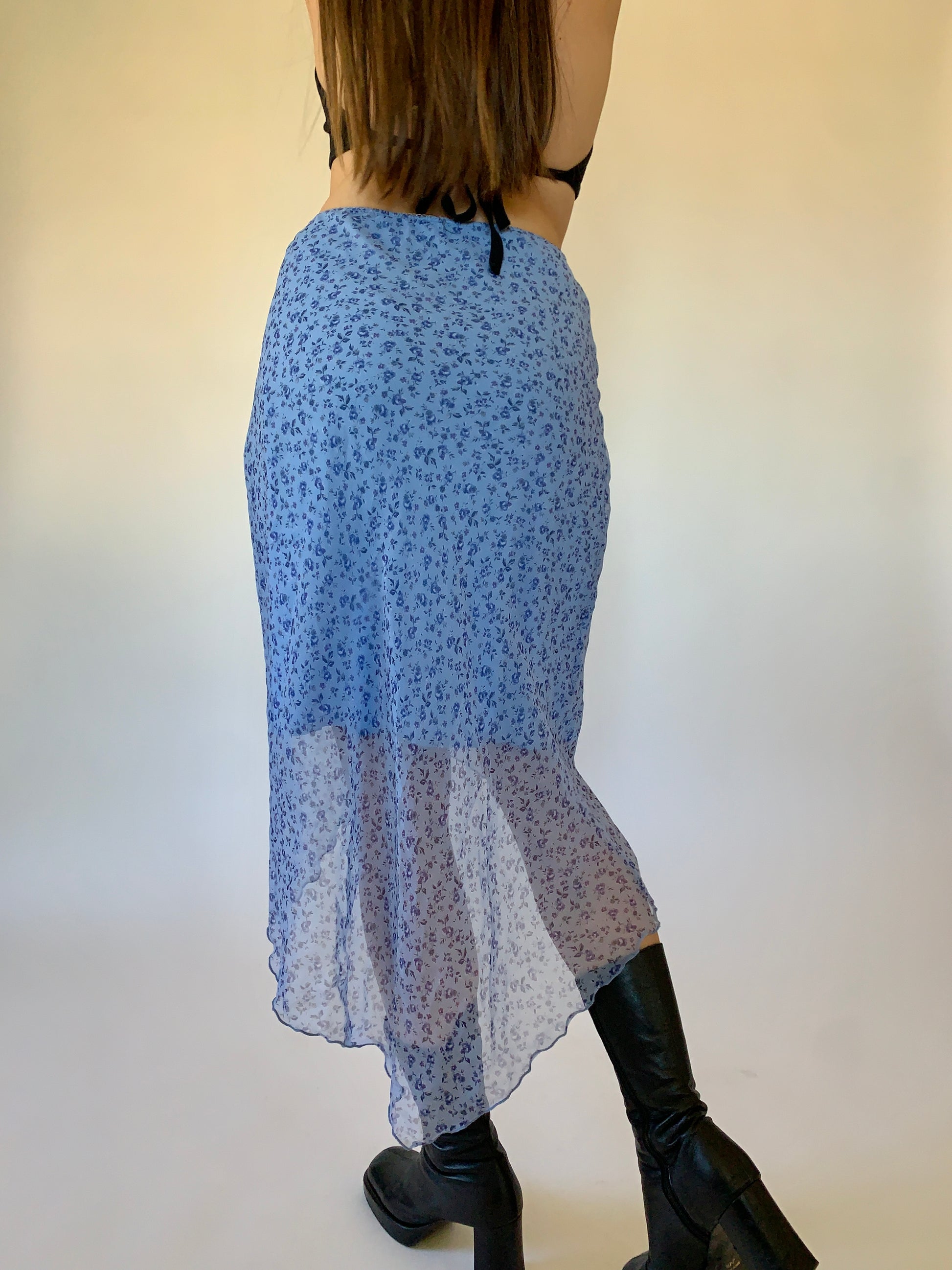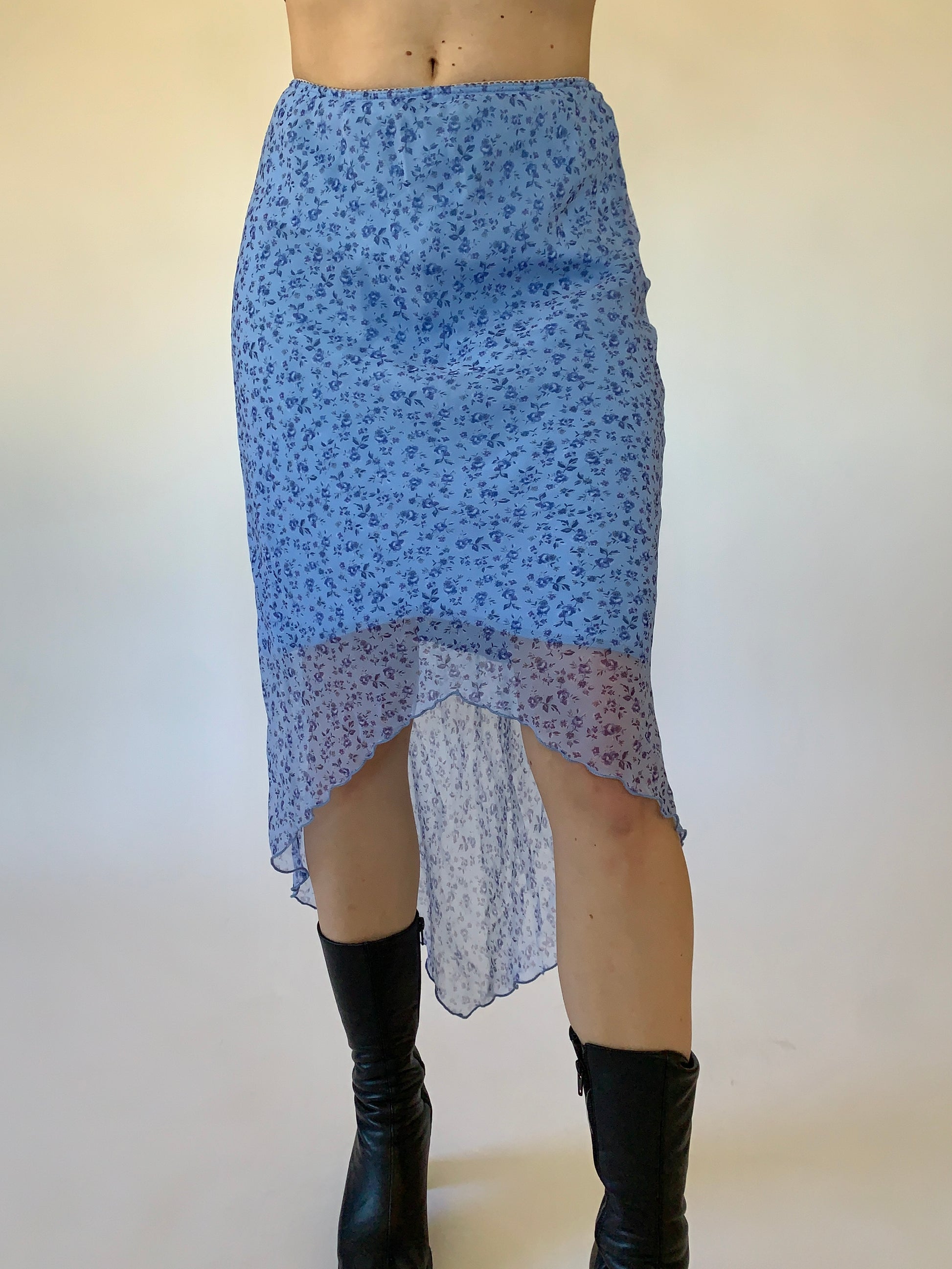 Vintage 1990s midi skirt by Y.K. Clothing. In blue mesh with a high low fit. Material is polyester. Made in USA. Excellent condition. Tagged size M, but best fits 22-26” waist due to stretch.
