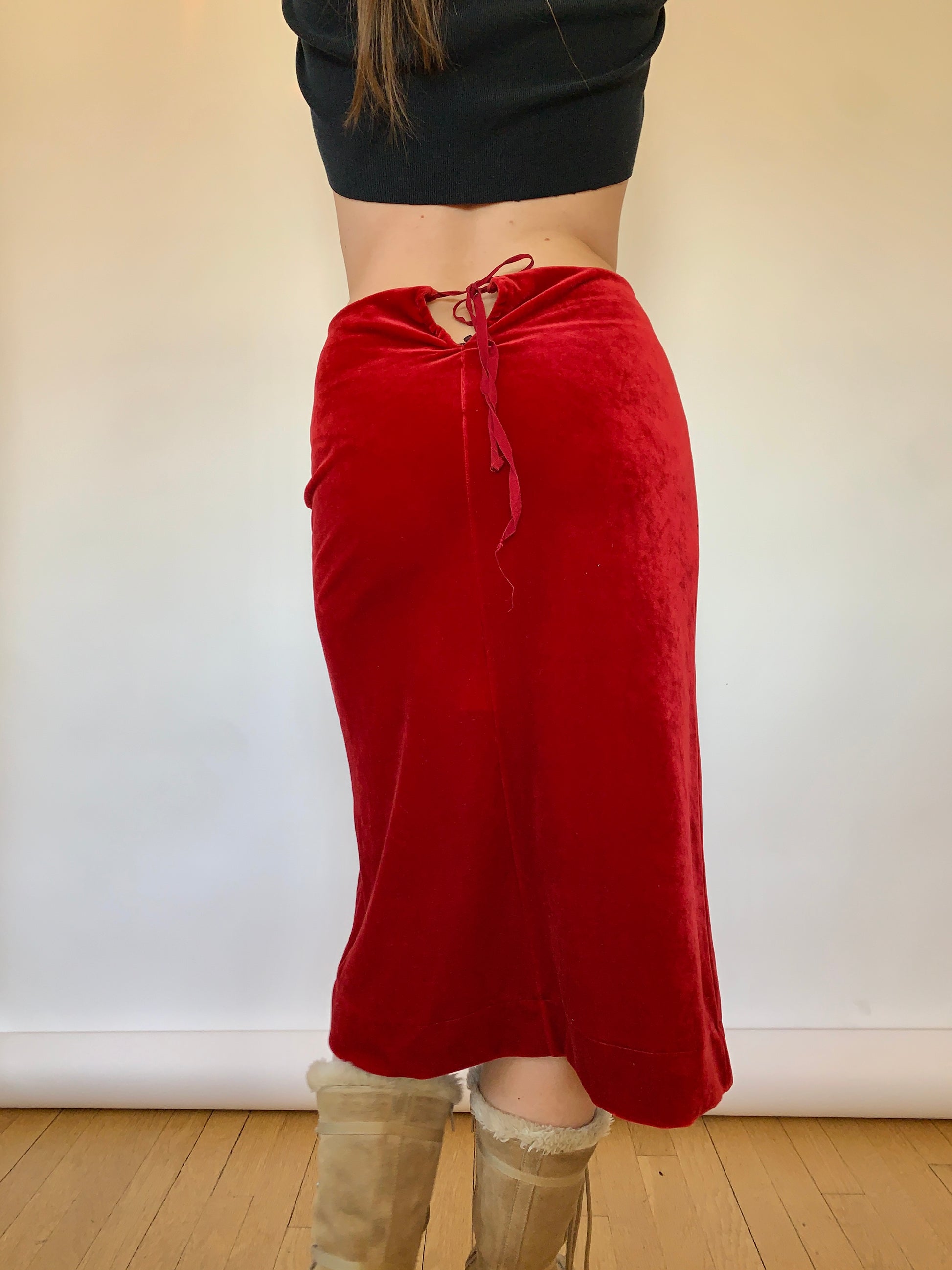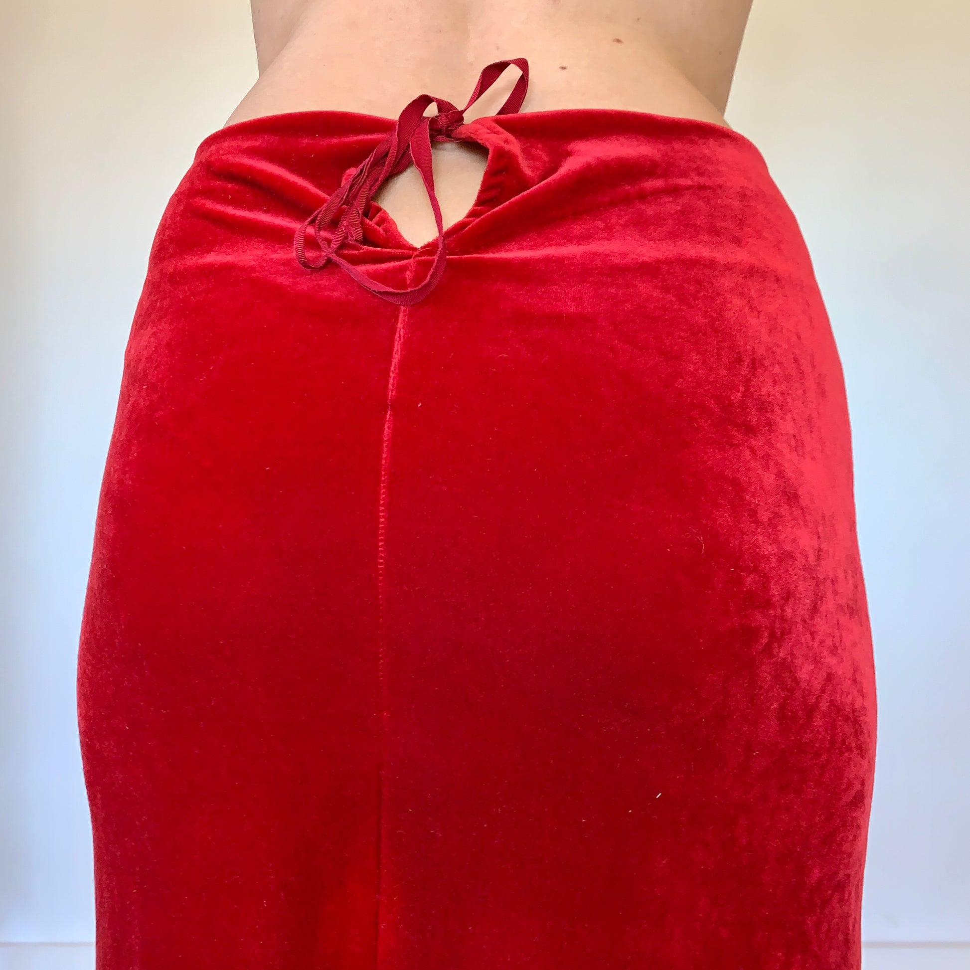 Vintage 1990s red velvet midi skirt. With a peekaboo and tie closure in the back. Good condition. Best fits size S or 26-28” waist.