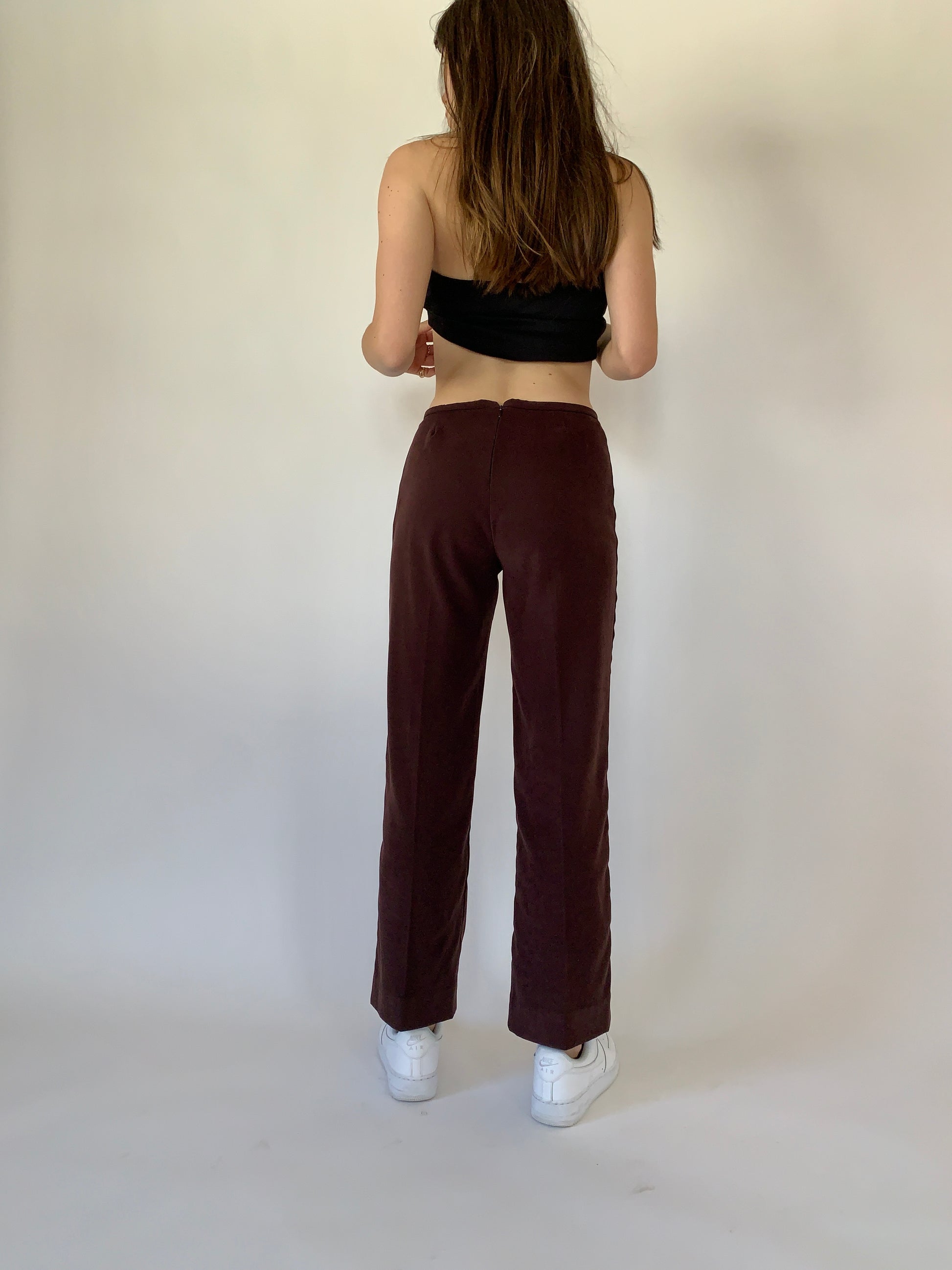 Vintage 1990s Rampage USA pants. Mid rise with a back zip and straight leg. In brown. Material is a poly spandex blend. In excellent vintage condition. Tagged size 7, but best fits 26-27” waist.