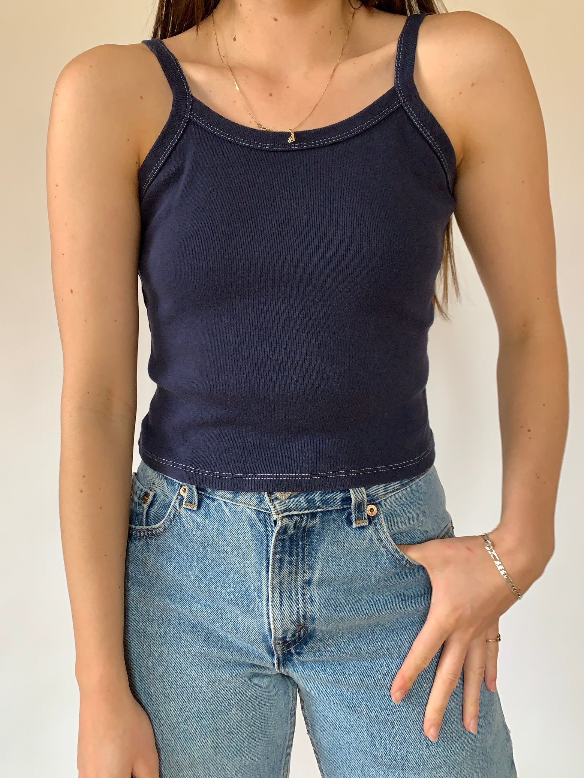 Vintage 1990s navy cotton tank. Excellent condition. Best fits XS, shown on XS.