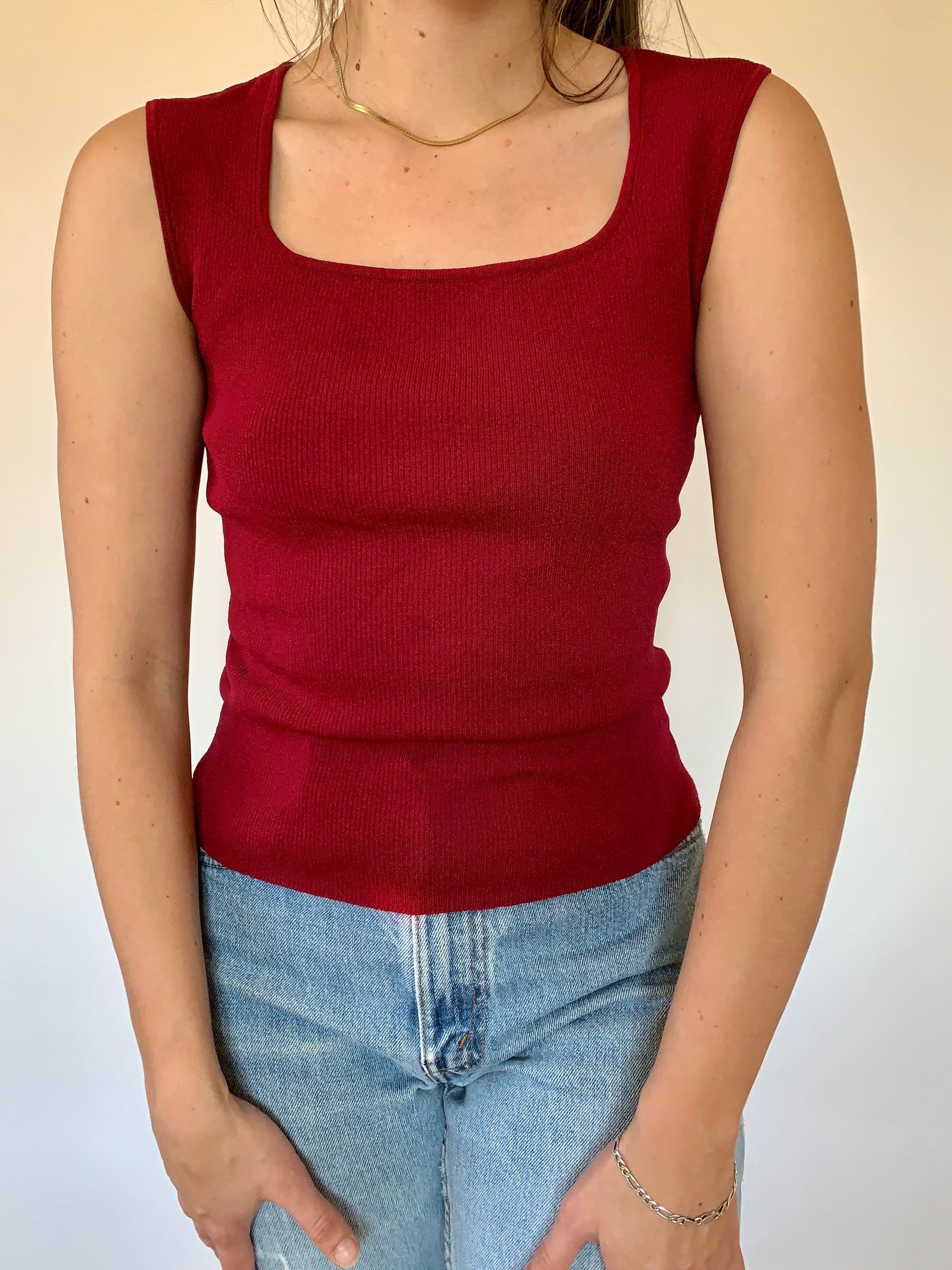 Vintage 1990s tank by Jones New York. In wine red. Material is a rayon/nylon blend with stretch. Excellent condition. Tagged size S, shown on size S.